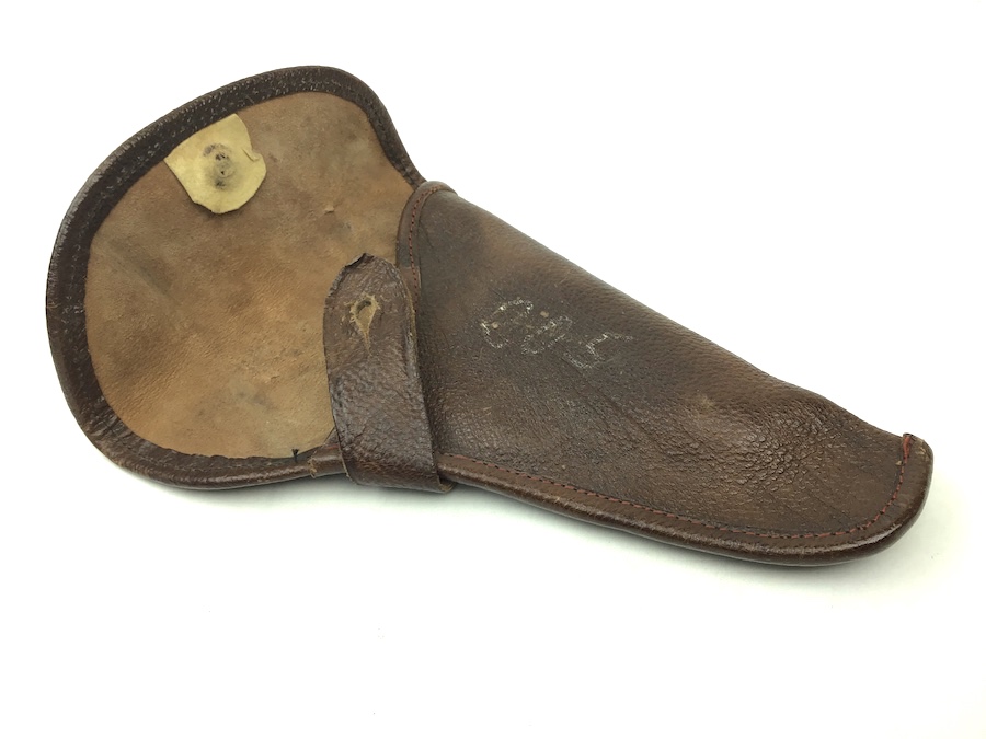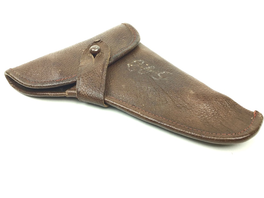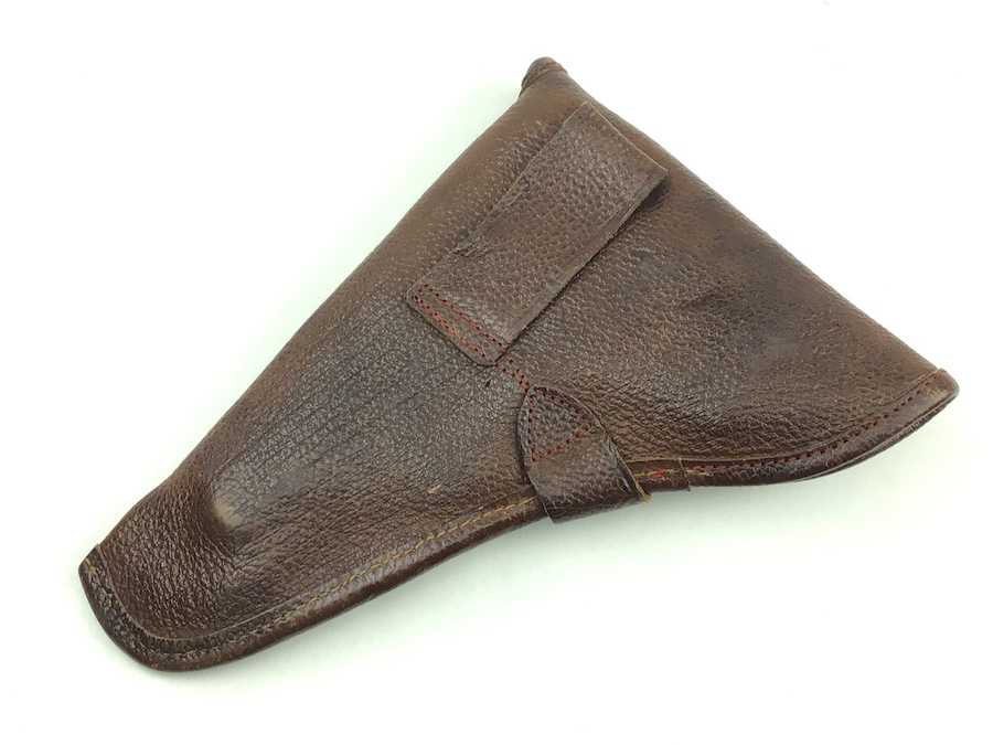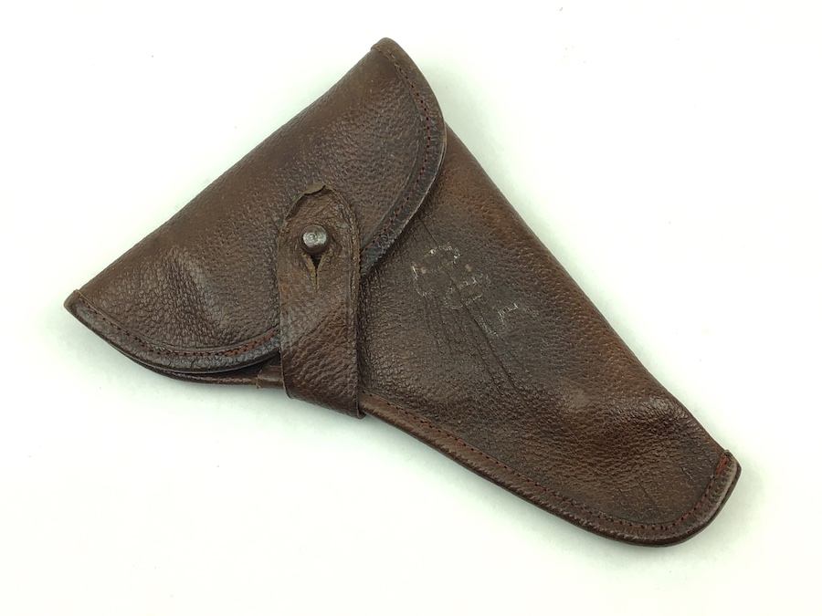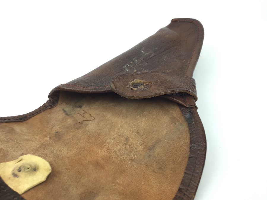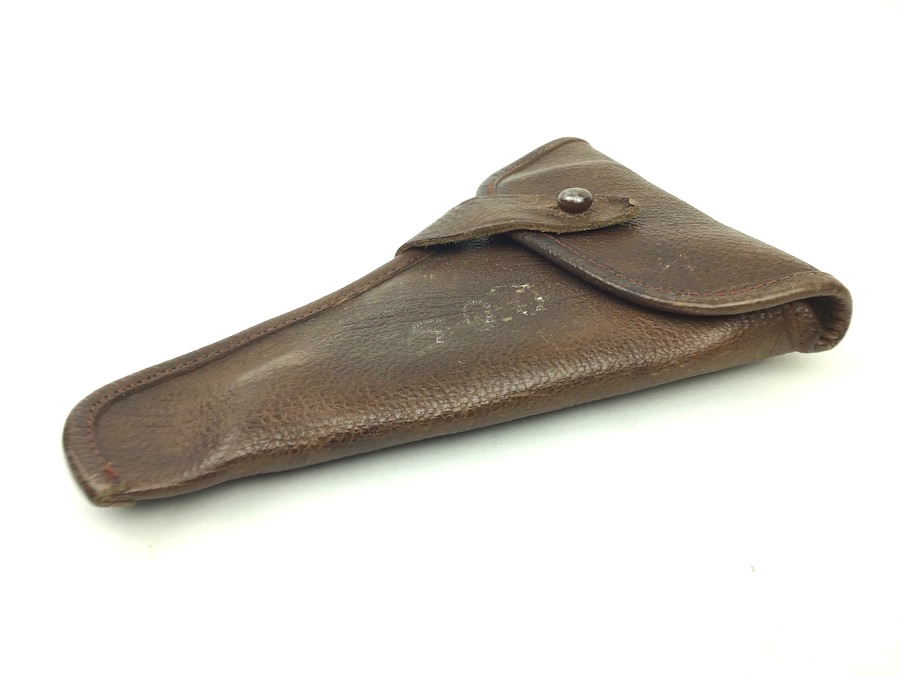4/21/20 – The is a leather, pre-war / wartime commercial holster that fits a Walter PP / PPK pistol. Factory original holster without a magazine pouch. Prints of a pre-war pistol are visible on the internals. A protective leather piece was added to the rear of the closer stud. The numerals “205” were hand written on the front, but otherwise an interesting piece.