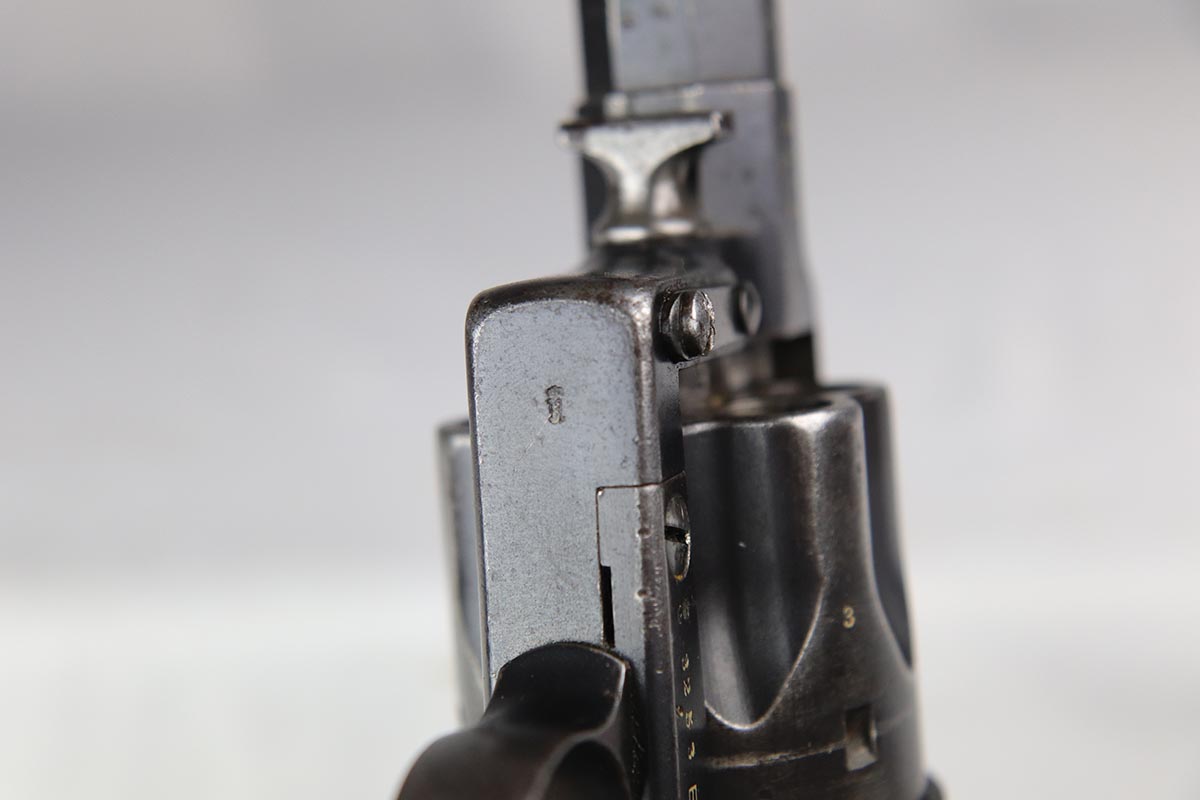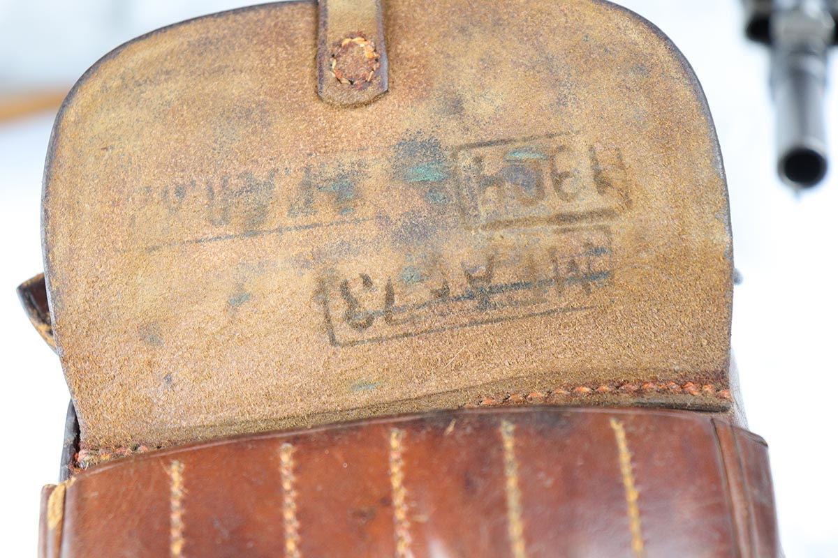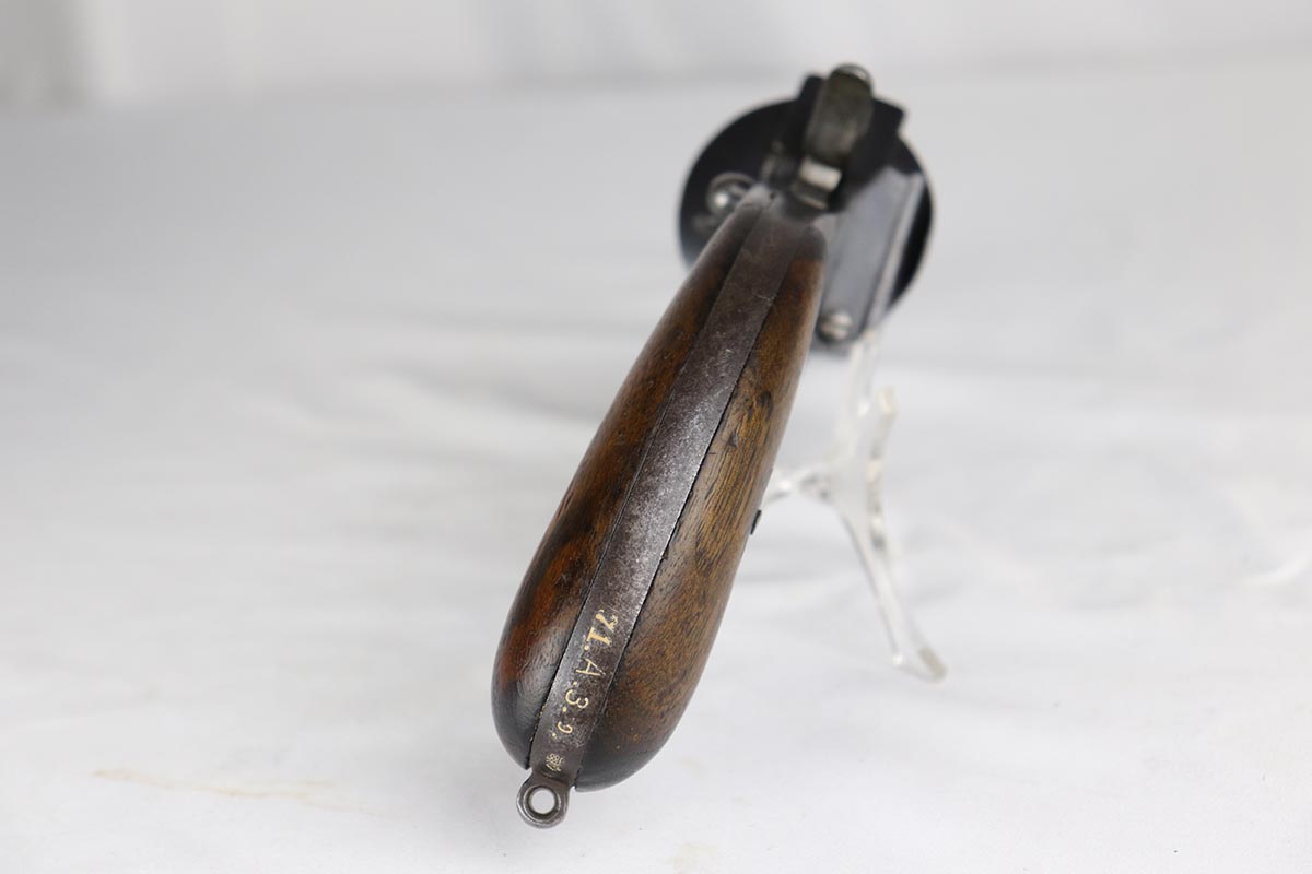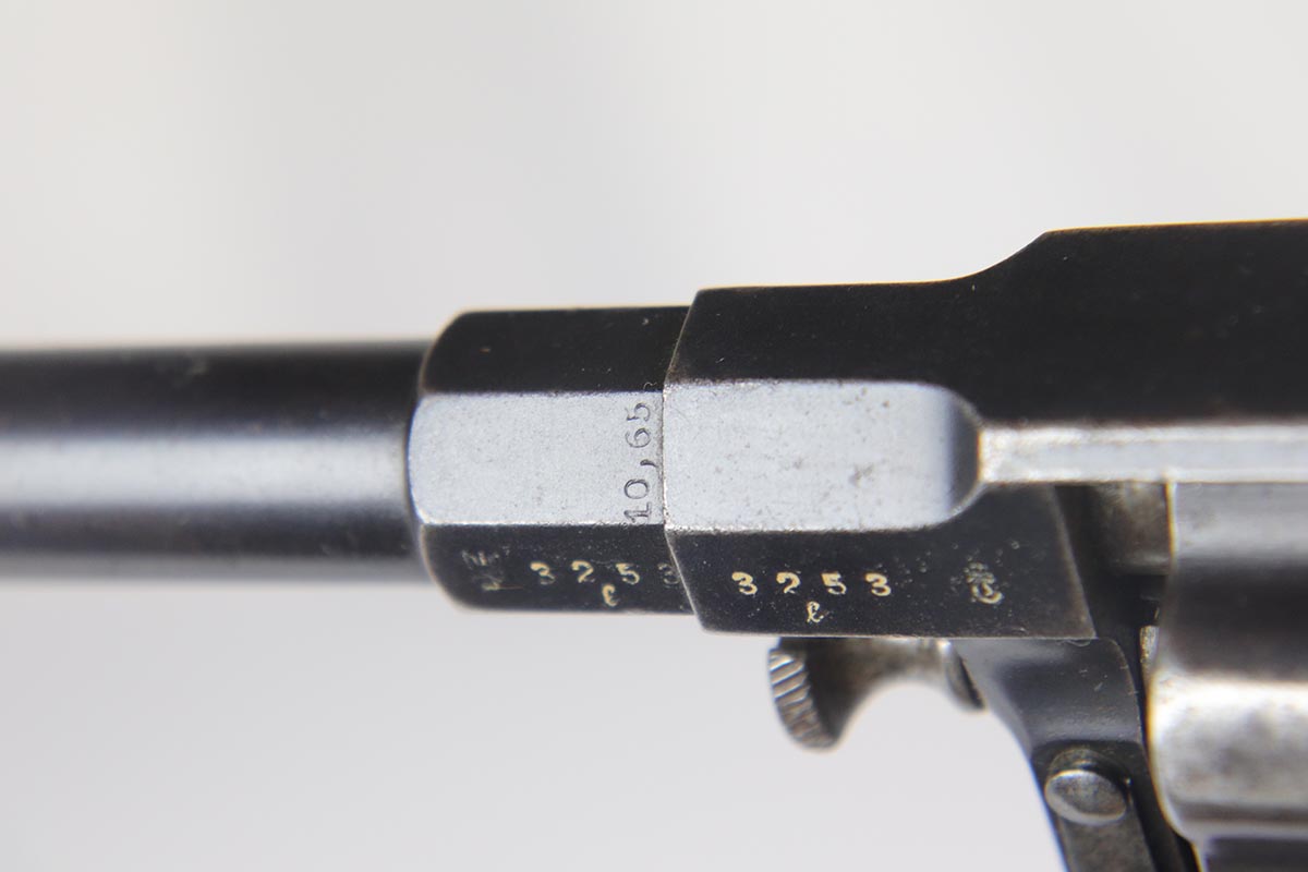 5/4/18 – This is a very nice German Model 1883 Reichsrevolver made at the Erfurt Arsenal pre WW1. The pistol is all matching and retains about 92% of the original “rust blue” finish. The revovler has speckling thoughout the blued finish, but this is normal aging patina. The barrel has some muzzle wear and holster wear throughout. The cylinder similarly has use and holster wear, but none of this wear is excessive and the finish is all original. The wood grips are excellent, with no cracks or chips. The bore is also excellent, with only very minor residue and excellent rifling. The markings and serial numbers are all crisp, and matching. The revolver comes with an original holster, which is scarce in its’ own right. The holster has some surface cracking but is all original and in tact. Overall this is an excellent rig and an antique!