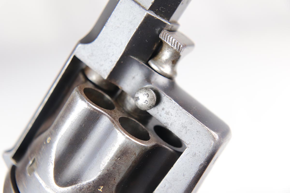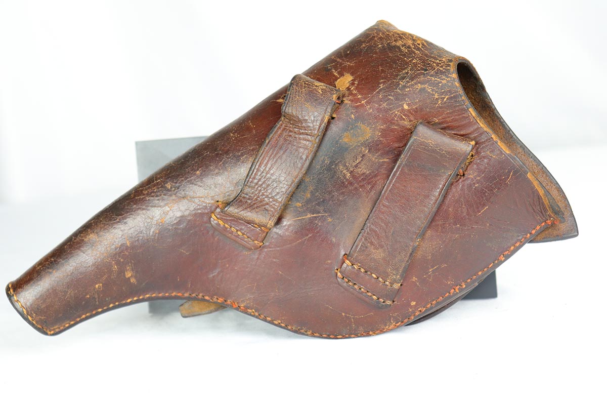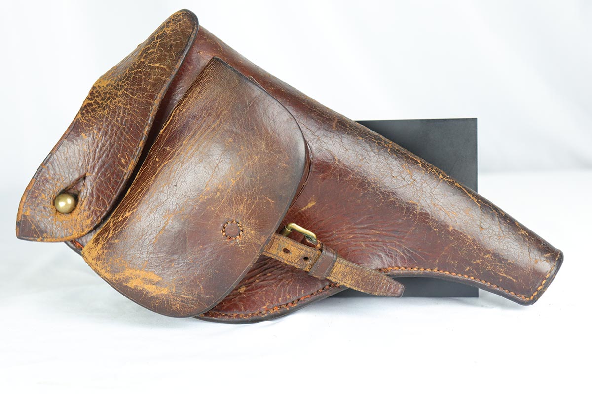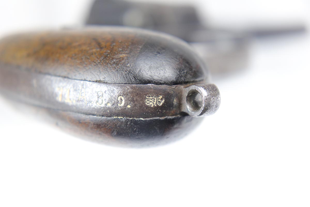 5/4/18 – This is a very nice German Model 1883 Reichsrevolver made at the Erfurt Arsenal pre WW1. The pistol is all matching and retains about 92% of the original “rust blue” finish. The revovler has speckling thoughout the blued finish, but this is normal aging patina. The barrel has some muzzle wear and holster wear throughout. The cylinder similarly has use and holster wear, but none of this wear is excessive and the finish is all original. The wood grips are excellent, with no cracks or chips. The bore is also excellent, with only very minor residue and excellent rifling. The markings and serial numbers are all crisp, and matching. The revolver comes with an original holster, which is scarce in its’ own right. The holster has some surface cracking but is all original and in tact. Overall this is an excellent rig and an antique!