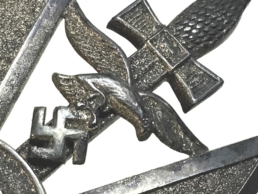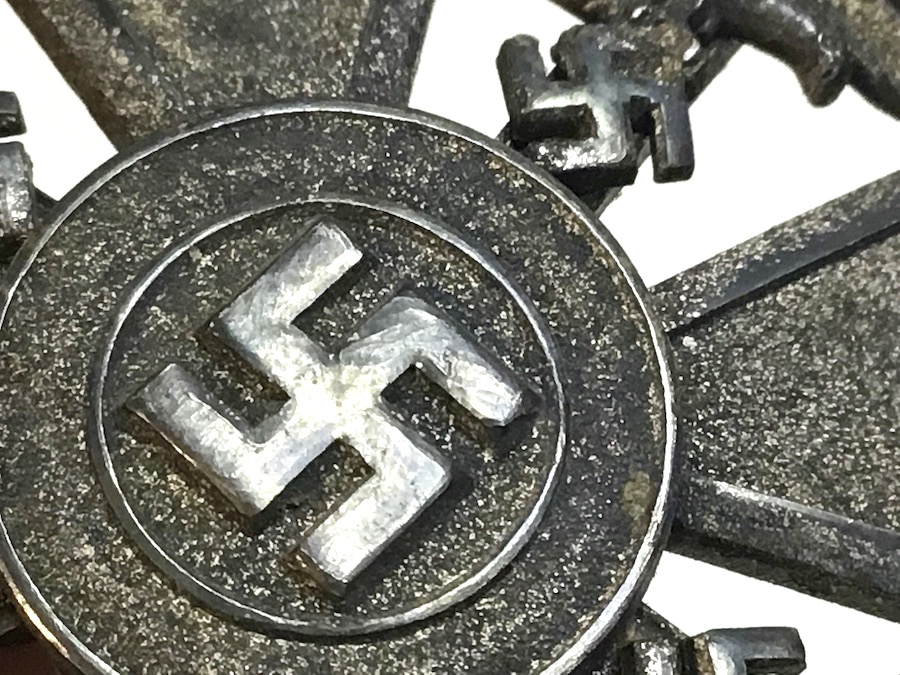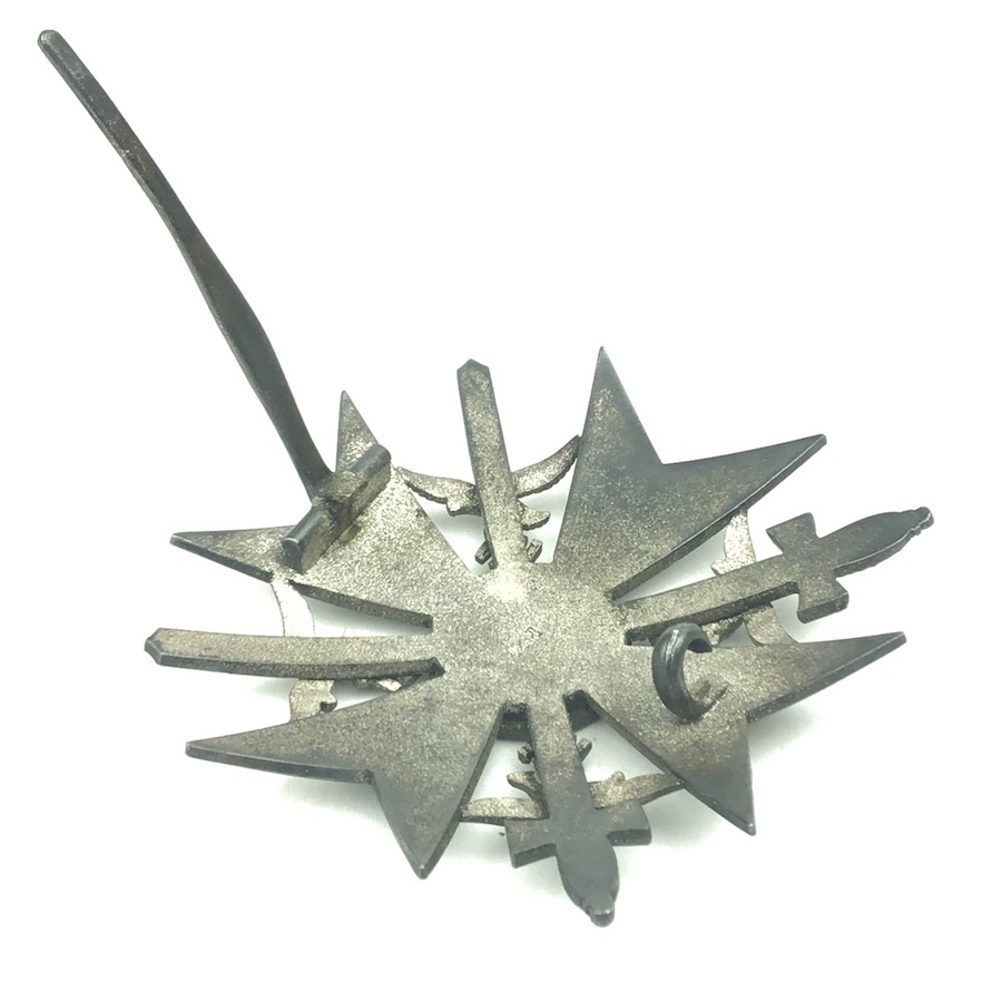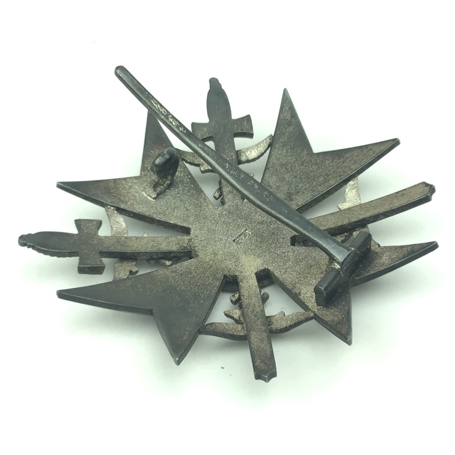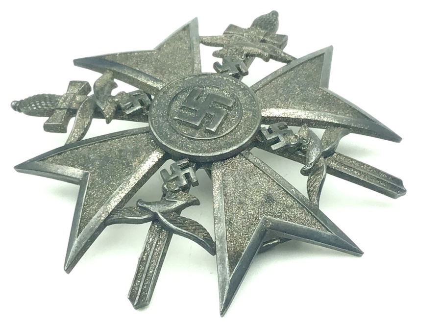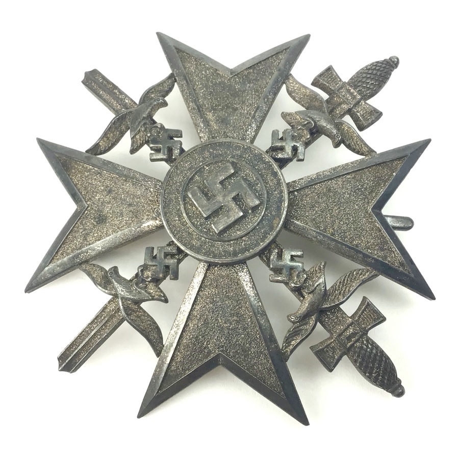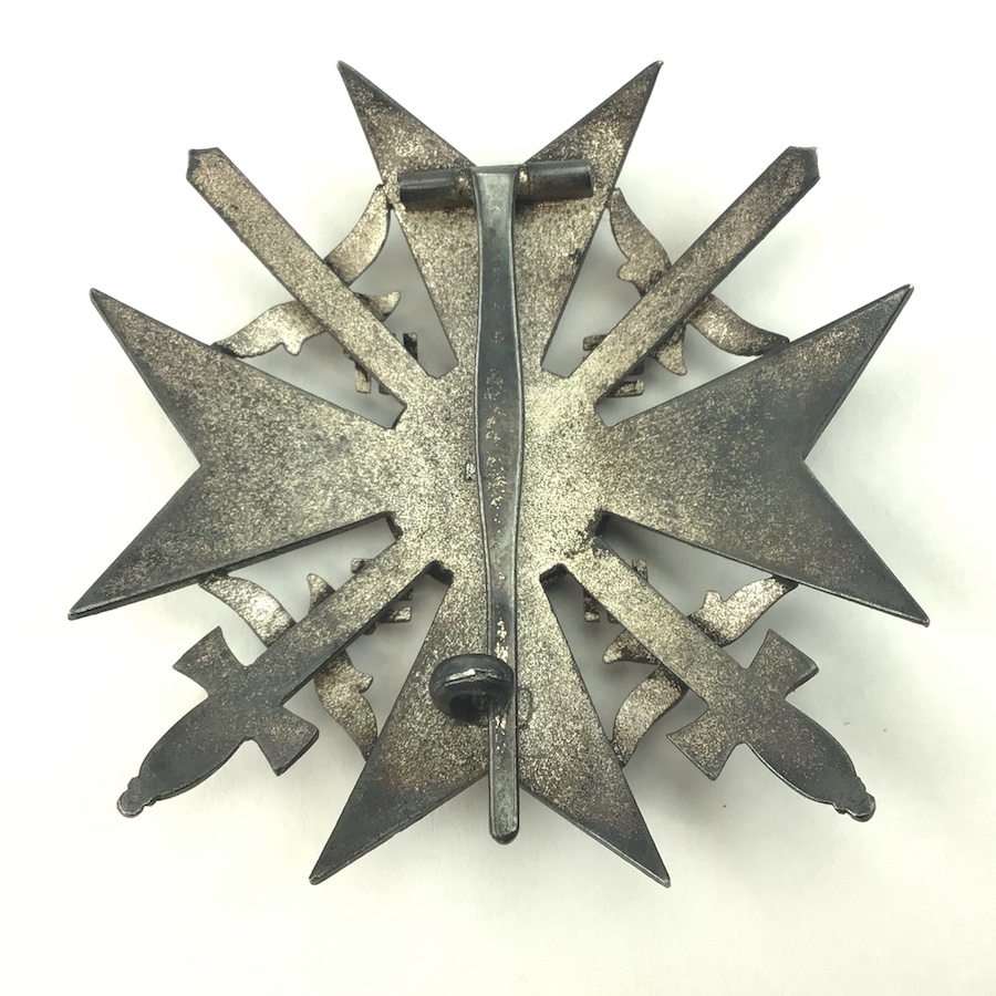 6/17/21 – Original and great condition. German / Spanish Silver Cross With Swords. Maker stamped on the back “L/52” which is the code for C.F. Zimmerman. The Spanish Cross in Silver was awarded to servicemen who took part in decisive battles or had considerable fighting experience. This piece has surface patina and may have been guided in gold at one time. Nice piece.
