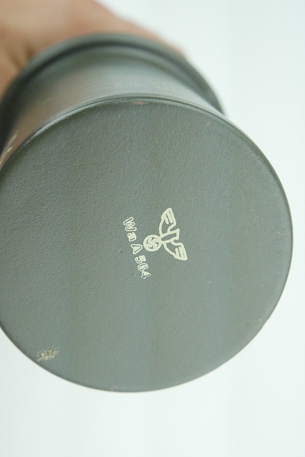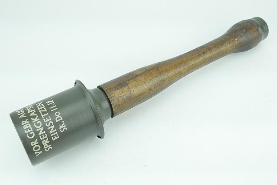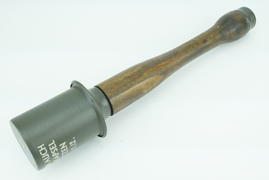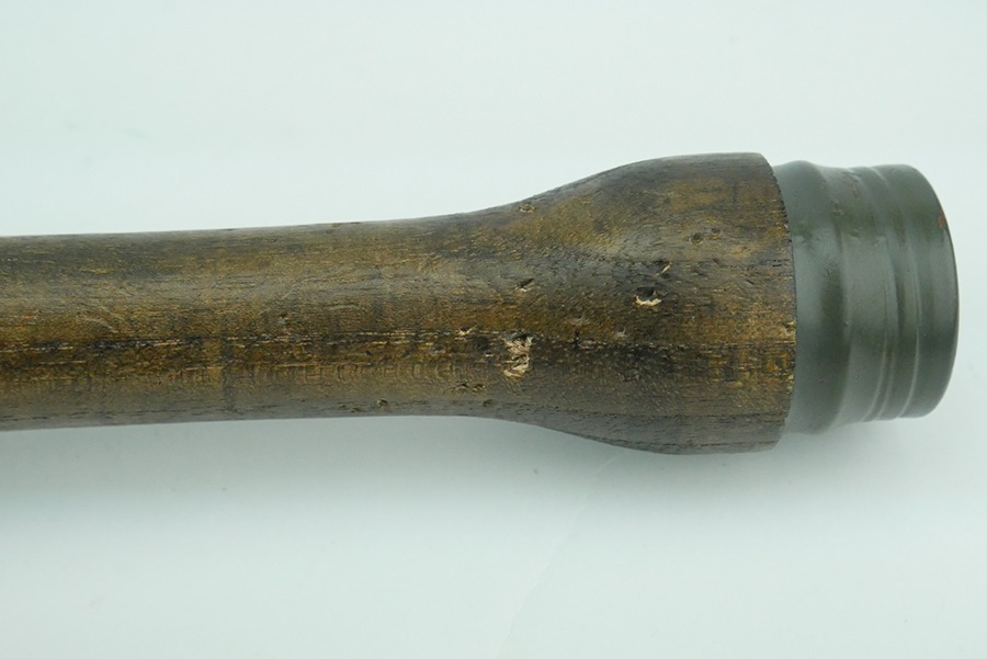 10/15/24 – This is a great example of a reproduction inert WW2 German stick grenade. This inert grenade is in great condition with very little loss to the paint. This inert grenade does have a removable base with the correct lanyard and ball that would be expected. The wood on this grenade is in good shape, with only a couple dents towards the bottom. The inert grenade is weighted correctly to mimic it’s real counterpart.