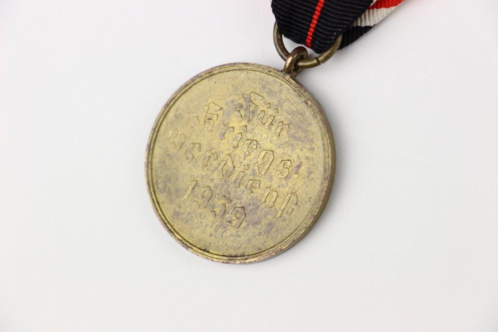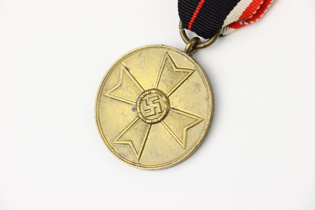 6/22/24 – This is a WW2 German War Merit Medal with original ribbon (Kriegsverdienstmedaille). The medal has great detail and light, natural patina on both sides. Inscribed, ““Für Kriegs-verdienst 1939” (For War Merit 1939) on the reverse. The ribbon is clean and excellent with a frayed top. Passes black light inspection.
