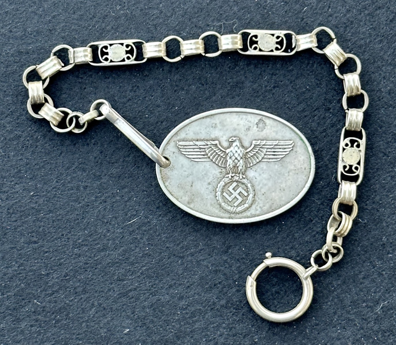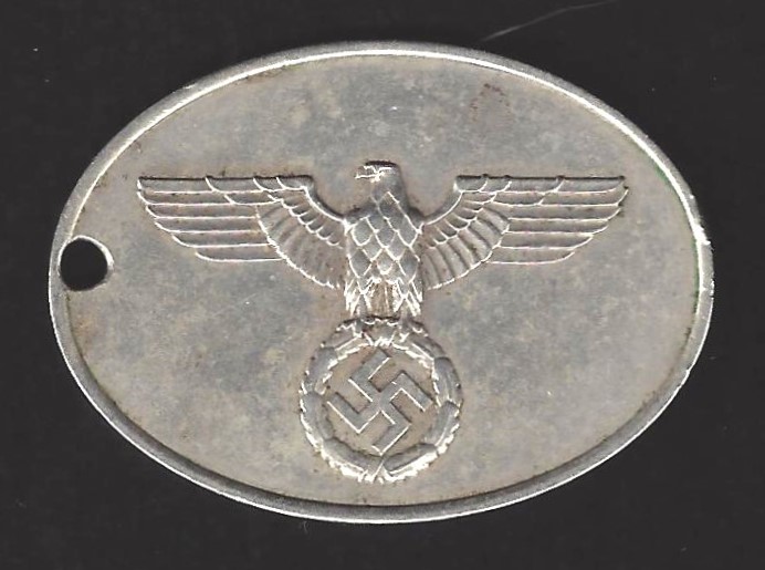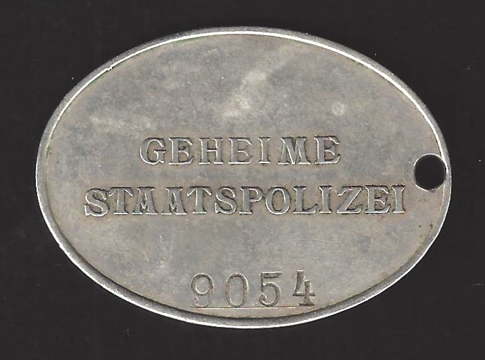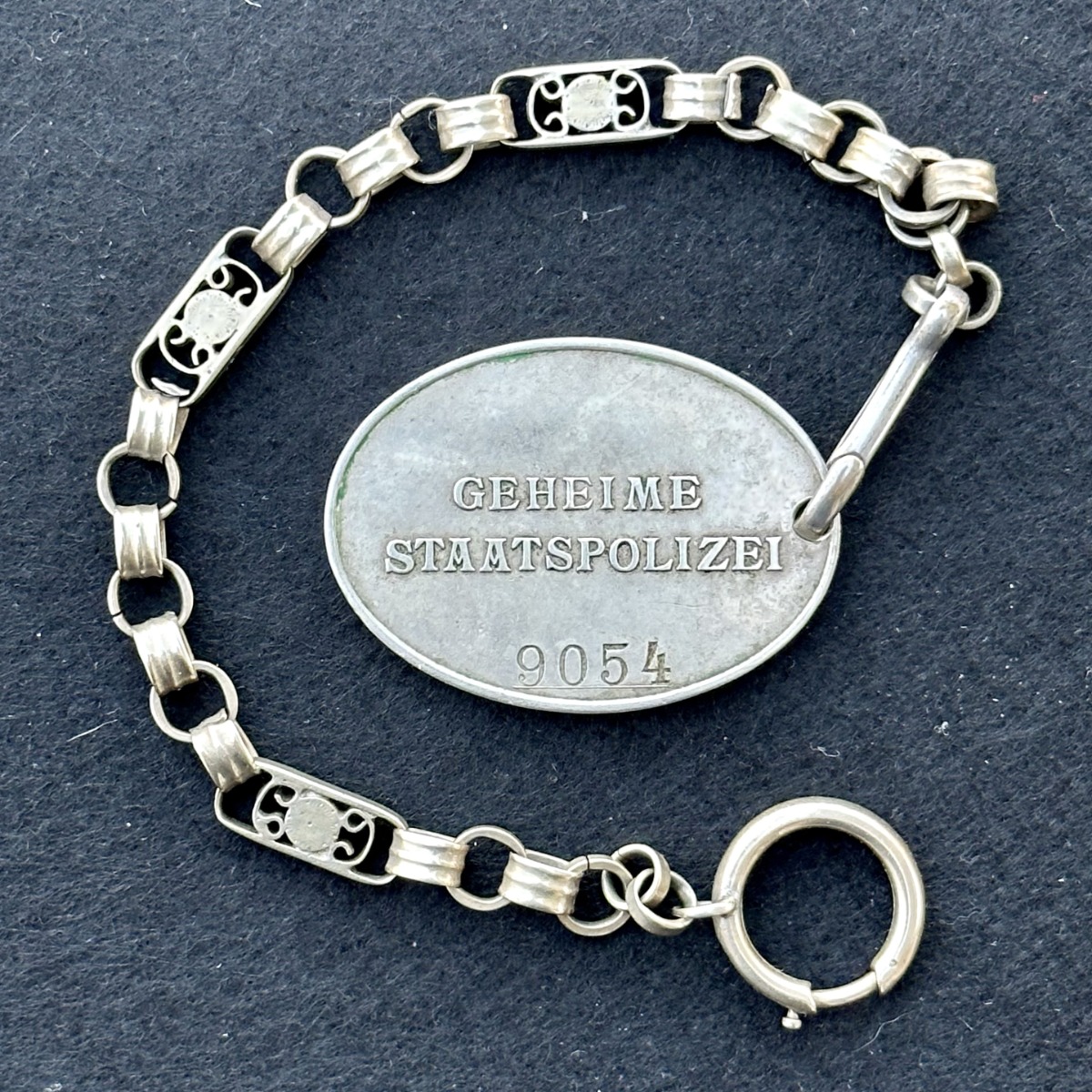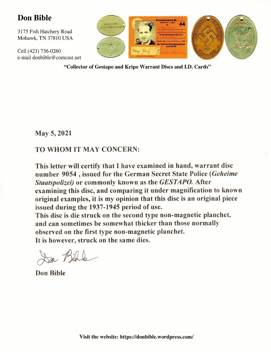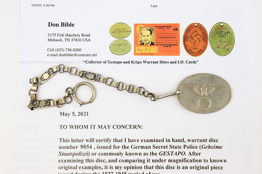 3/23/23 – This is an original WW2 Gestapo warrant disc. These are more scarce than the Kripo warrant discs as they were worn and issued to the Gestapo (Secret State Police). The disc is lightweight non-magnetic metal and in great condition. Approx. weight of the disc is 26 grams. The chain is in similar condition and made from the same non-magnetic lightweight metal. The chain weighs approx. 20 grams. This example also comes with a signed certification letter from Don Bible, an authority on these discs. Measures approximately 51mm long and 37mm wide.