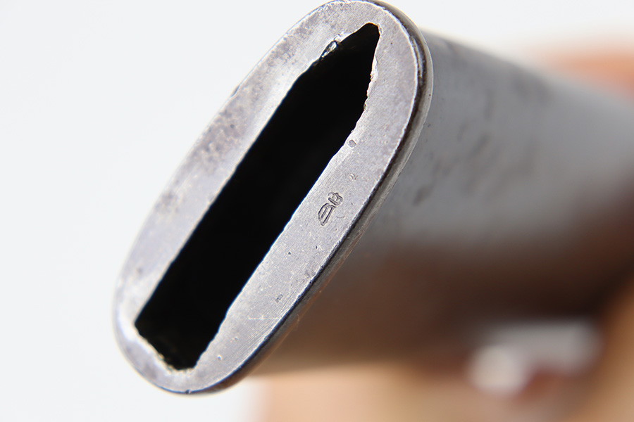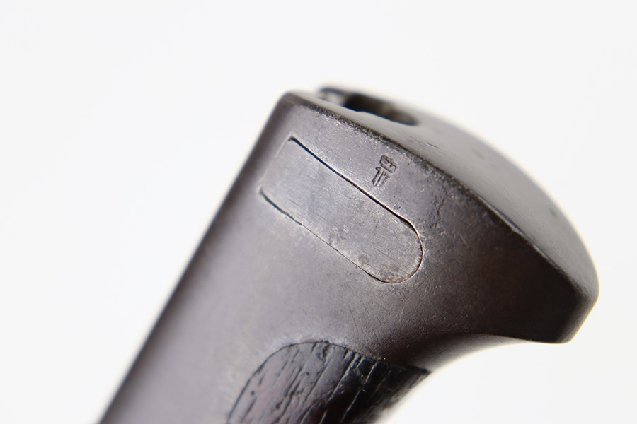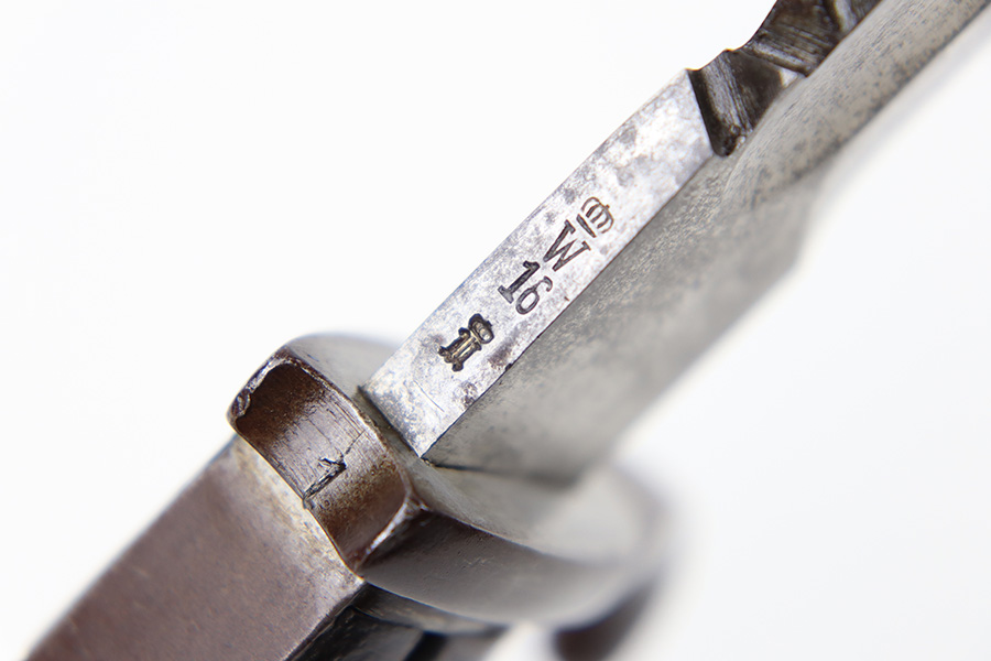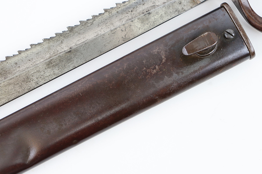 10/5/23 – This is an original 1916 production Gewehr 98 Sawback Butcher bayonet. These are fairly scarce and desirable as they became outlawed in the Treaty of Versailles after WW1. This example is in great overall condition with some honest wear throughout. The blade has speckling patina and mild pin-pricking but no signs of sharpening along the edge, and no rust or pitting. The spine of the blade is proof stamped and dated. The base of the blade is maker stamped as shown. Nice wood grips and normal patina on the quillon and pommel. The scabbard is original but shows dark patina throughout and has a few minor dents.
