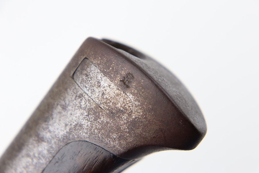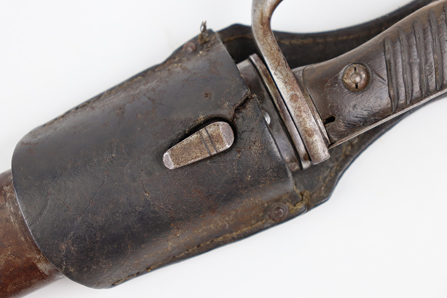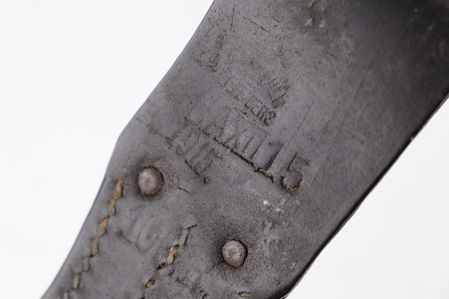 10/19/23 – This is an original WW1 German Gew98 Sawback Butcher bayonet. The bayonet comes with an original scabbard and leather frog. The frog is maker stamped and 1915 dated on the back leather as shown. Great overall condition. The bayonet blade has speckling discoloration throughout, but this is light surface splotches and there are a few mild surface scratches as well. Signs of mild use and sharpening along the edge. The base of the blade is maker stamped as shown. Imperial proof stamped on the spine. The hand guard and pommel have dark discoloration and natural patina but no rust or pitting, and an original wood grip. The scabbard has a few dents in the metal but fits nicely. Brown patina throughout and honest wear.