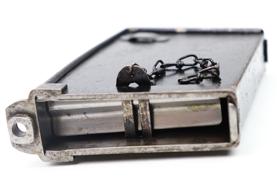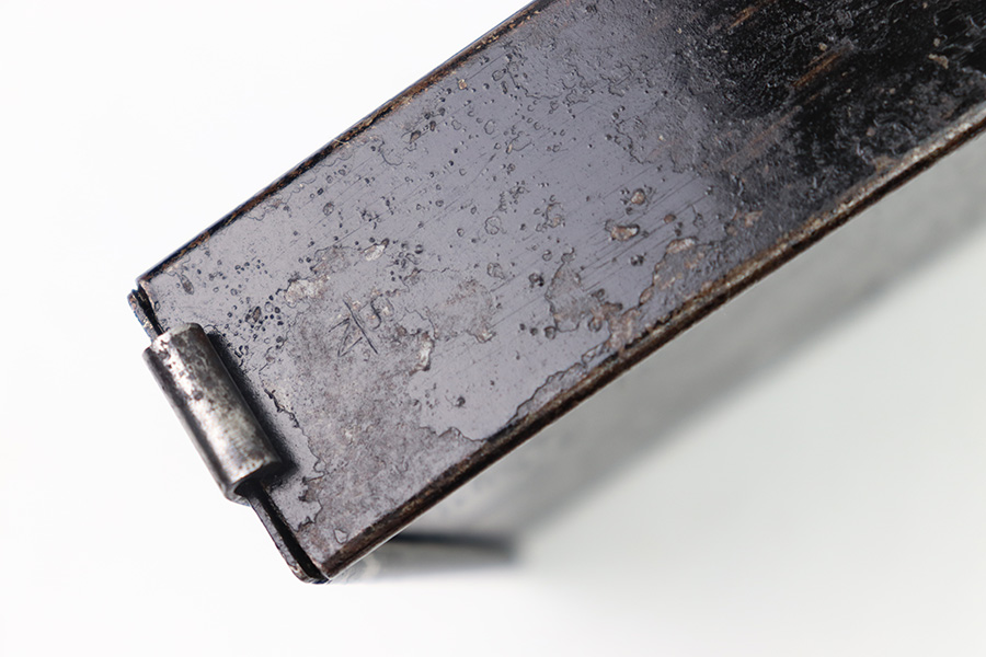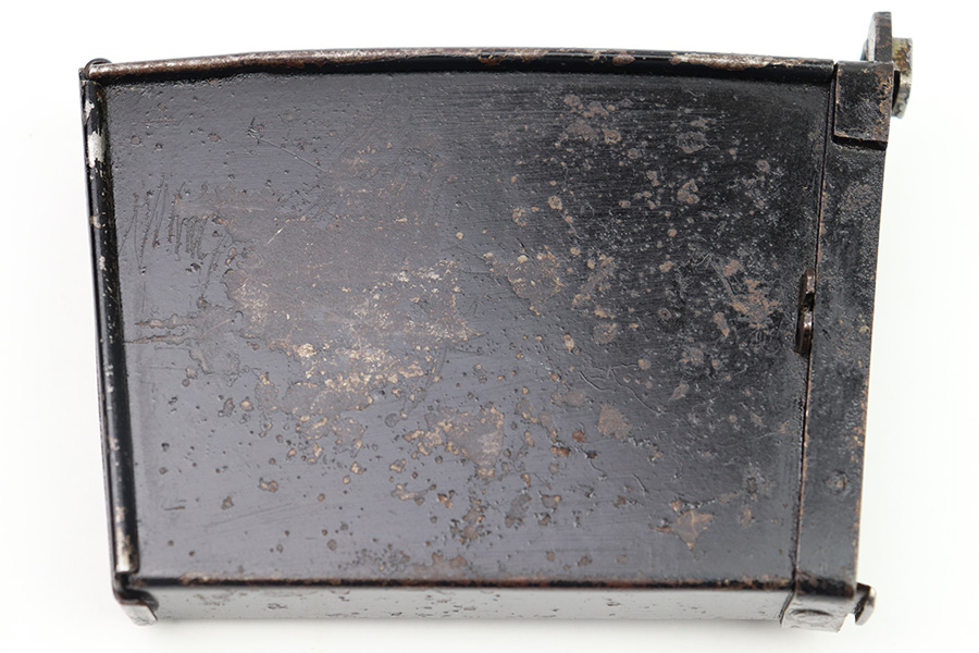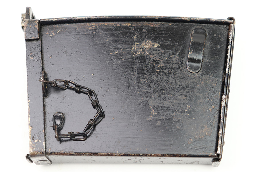 9/22/22 – This is a rare, original WW1 Gewehr magazine. Made for trench warfare, allowing the user to swap the base-plate in a Gewehr rifle for this 25 round extended magazine. The magazine is unmarked and in great condition with most of the original black painted finish still intact. There’s some spotty patina and mild finish loss as shown, but given the items’ age this condition is excellent. The spring is strong and fully functional. All parts included as shown.