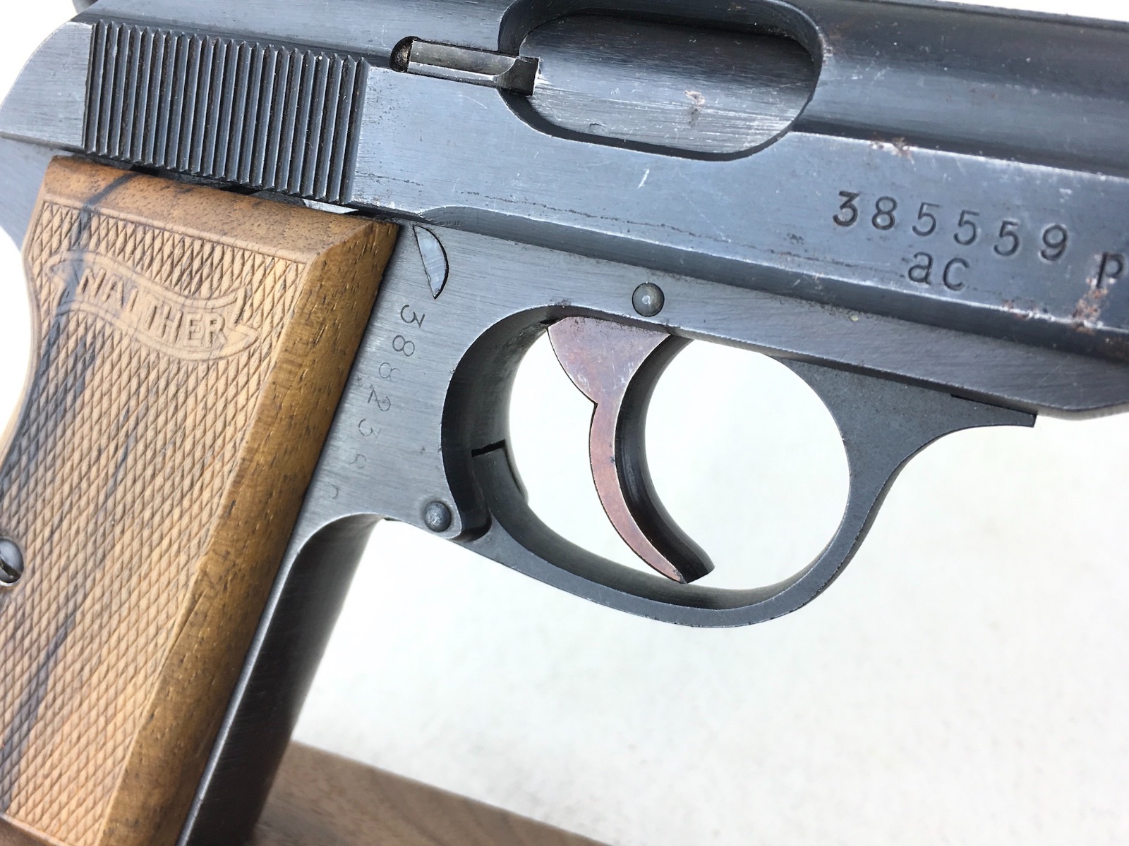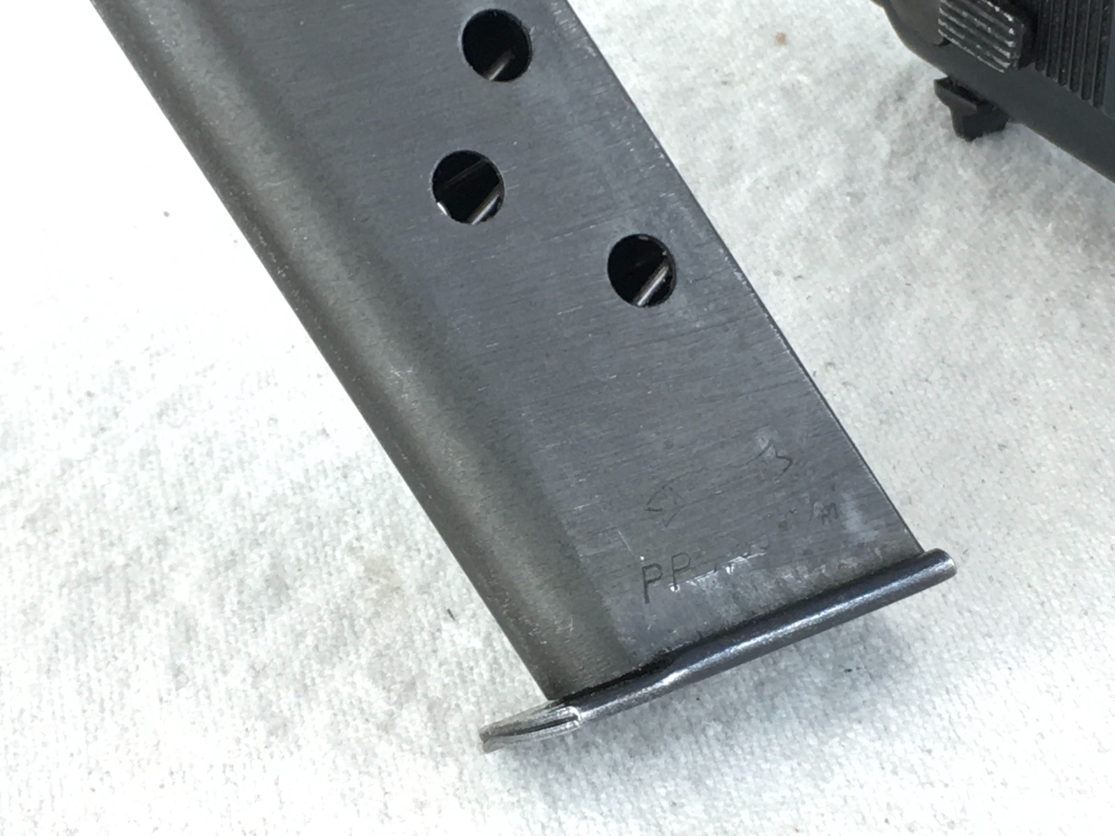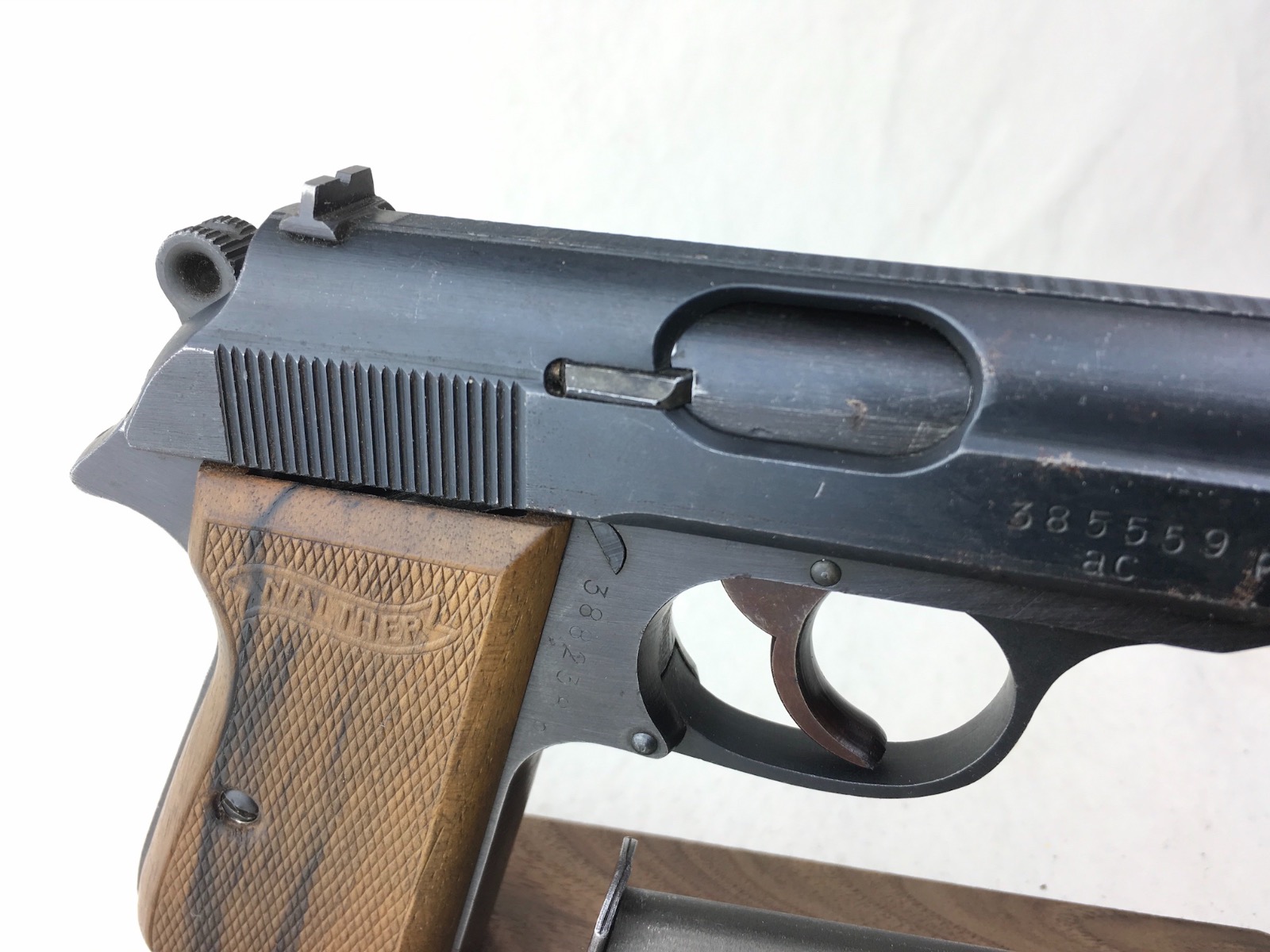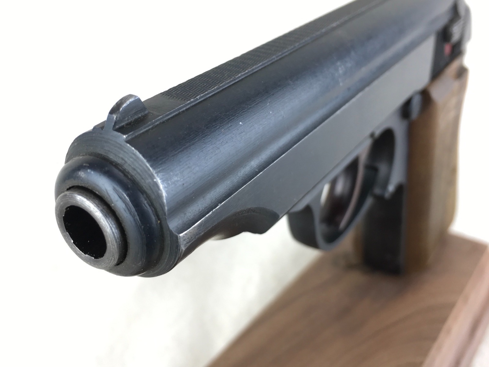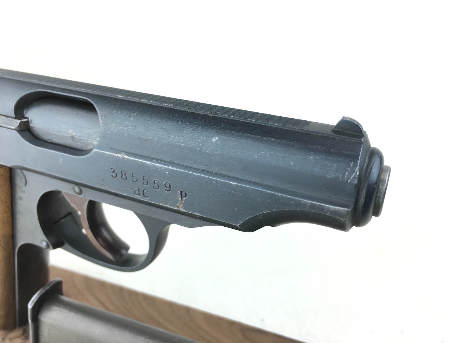 1/15/19 – This is a Walther PP from late World War II. It was most likely assembled in the factory right after the war ended. These are known as “GI put together” pistols. They are often mismatched and had the late war features, such as no slide legend and a dull-late war finish. Right side of the slide has “ac” under the serial number. There’s some very minor pitting near the “ac” on the slide, and general edge wear (about 94-96% overall). Phosphate hammer and plumb-colored trigger. Excellent bore has some very minor patina but overall clean. Mechanically correct and fully functional. It comes with the rare late war “W” magazine. Beautiful wood grips with no issues.