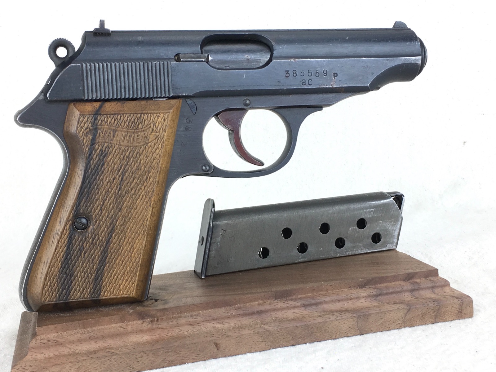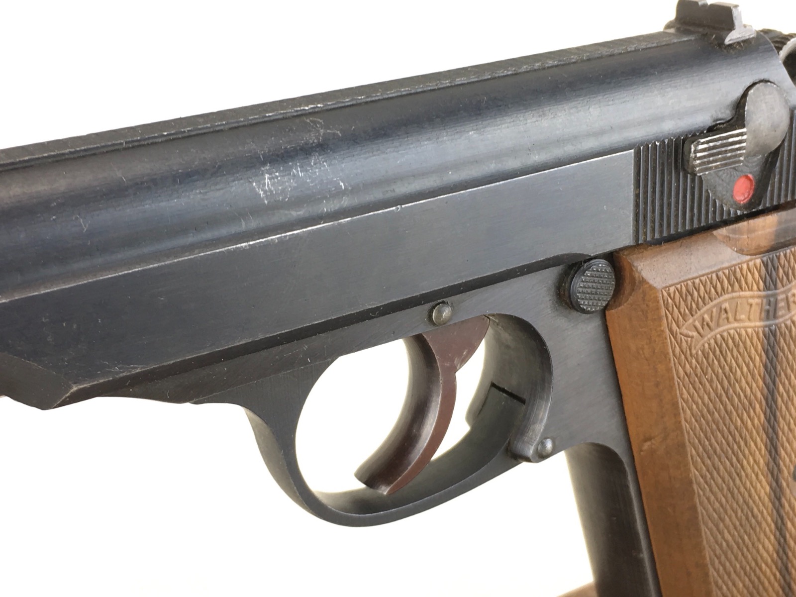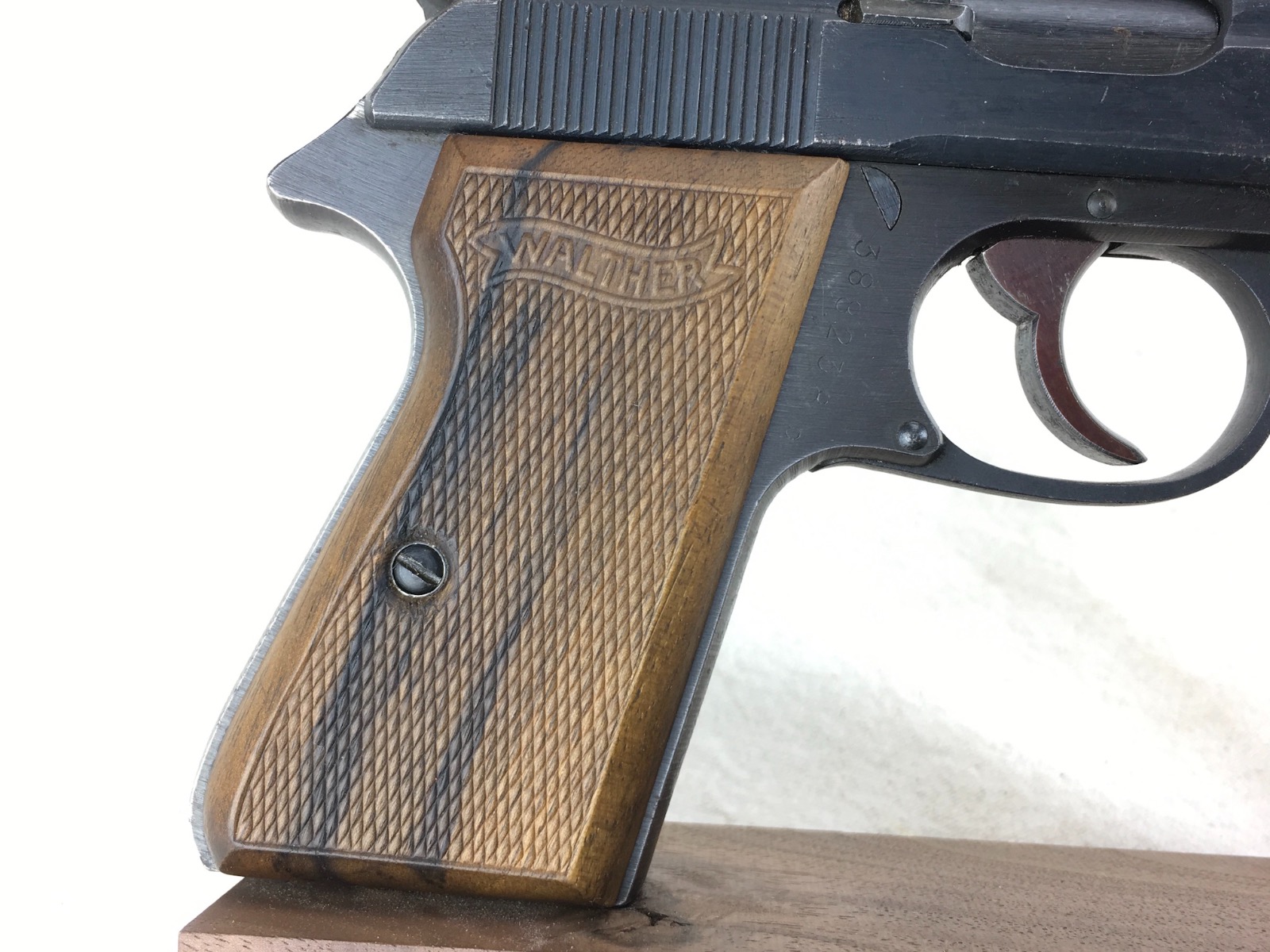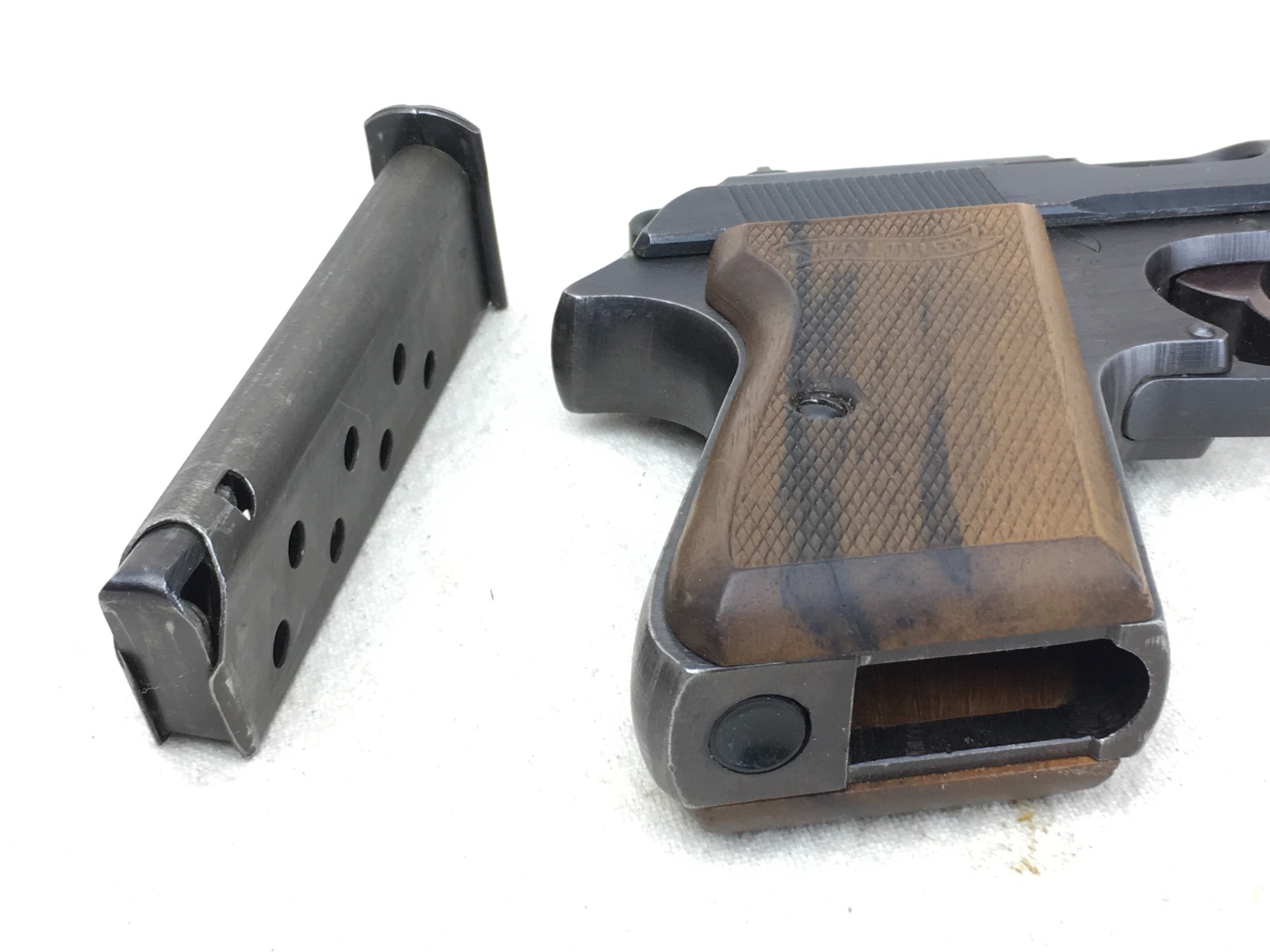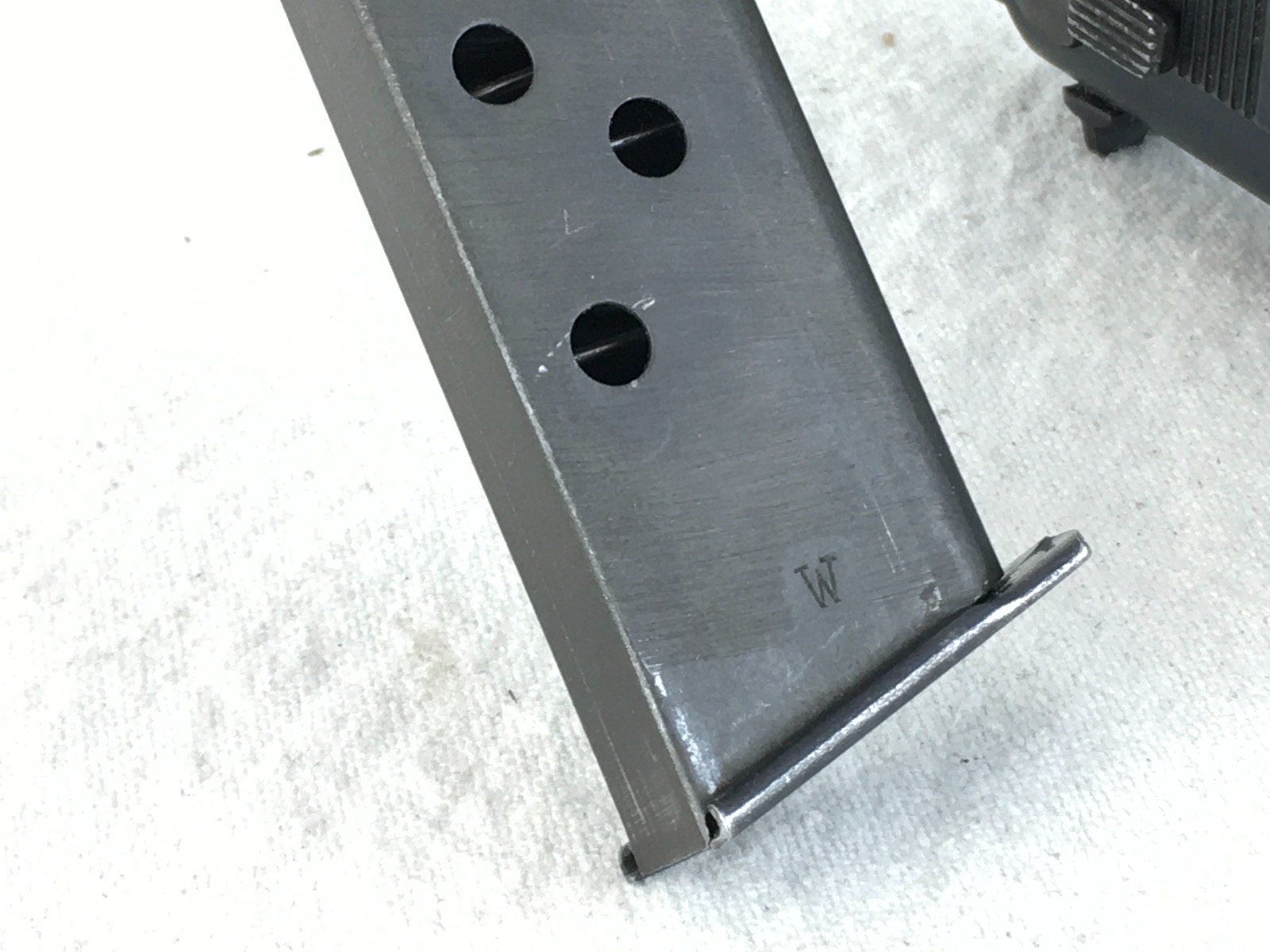 1/15/19 – This is a Walther PP from late World War II. It was most likely assembled in the factory right after the war ended. These are known as “GI put together” pistols. They are often mismatched and had the late war features, such as no slide legend and a dull-late war finish. Right side of the slide has “ac” under the serial number. There’s some very minor pitting near the “ac” on the slide, and general edge wear (about 94-96% overall). Phosphate hammer and plumb-colored trigger. Excellent bore has some very minor patina but overall clean. Mechanically correct and fully functional. It comes with the rare late war “W” magazine. Beautiful wood grips with no issues.