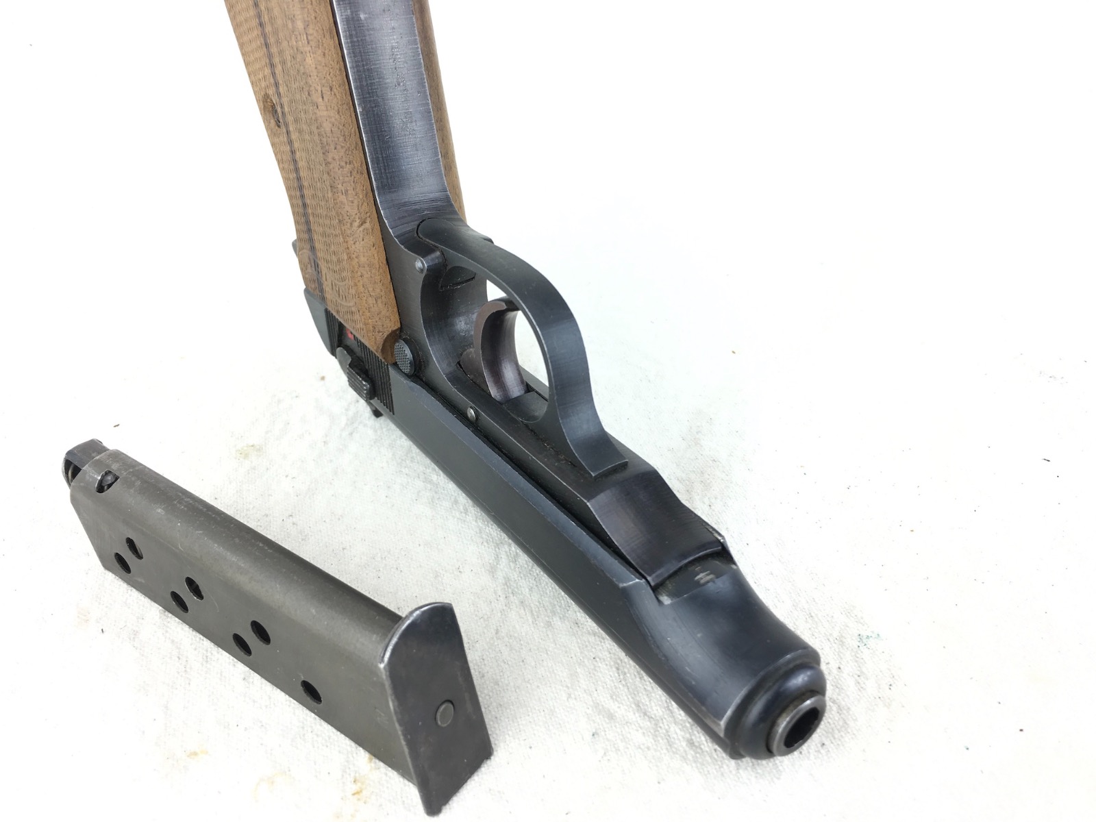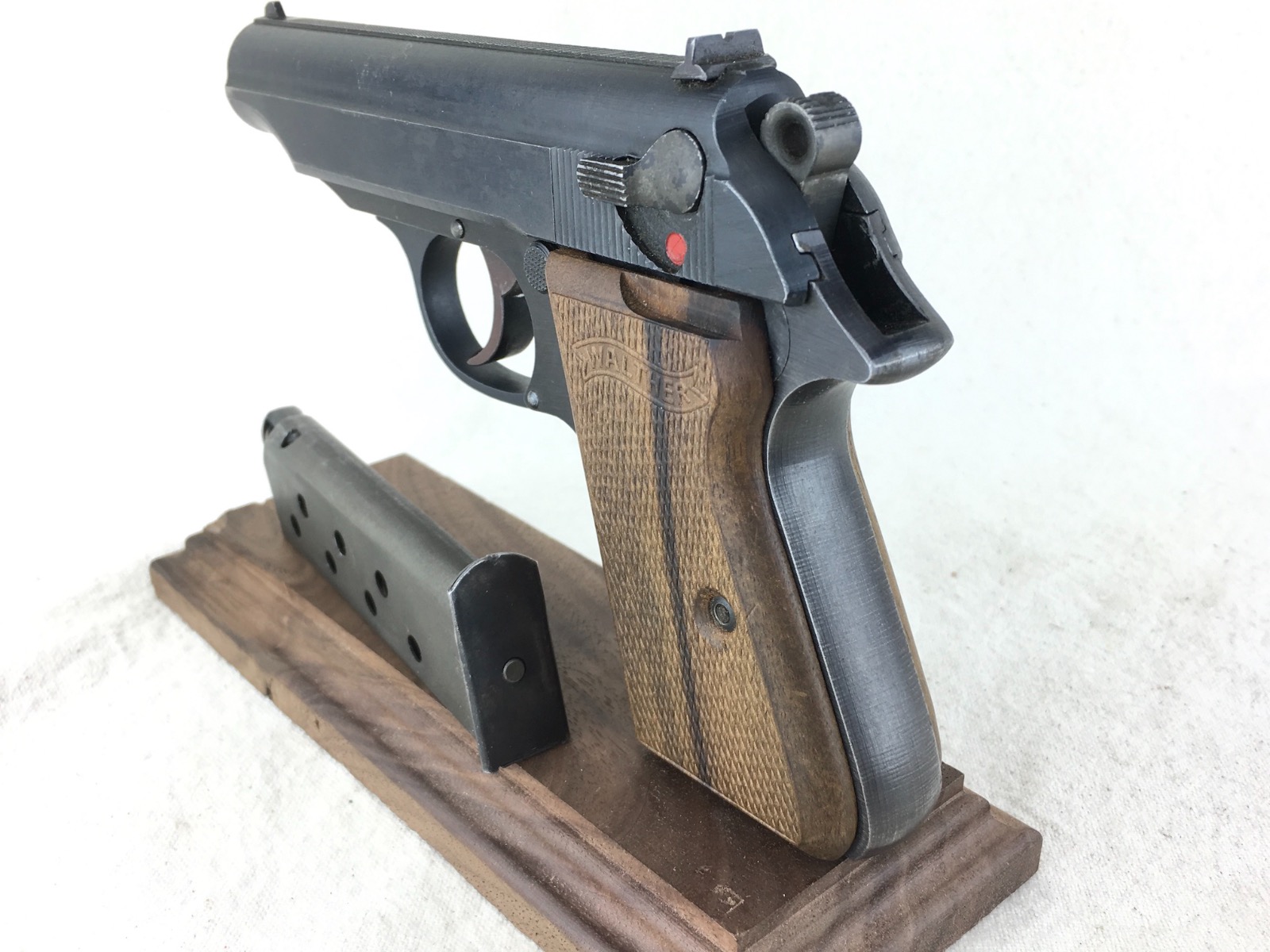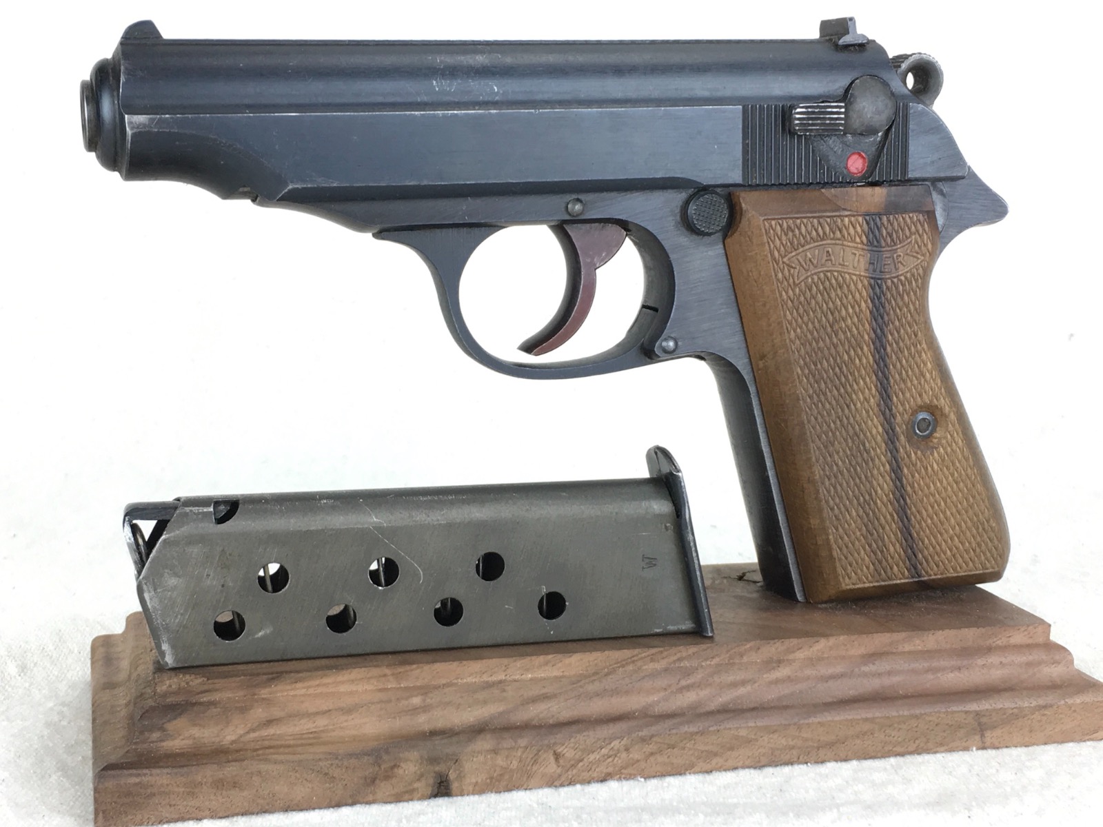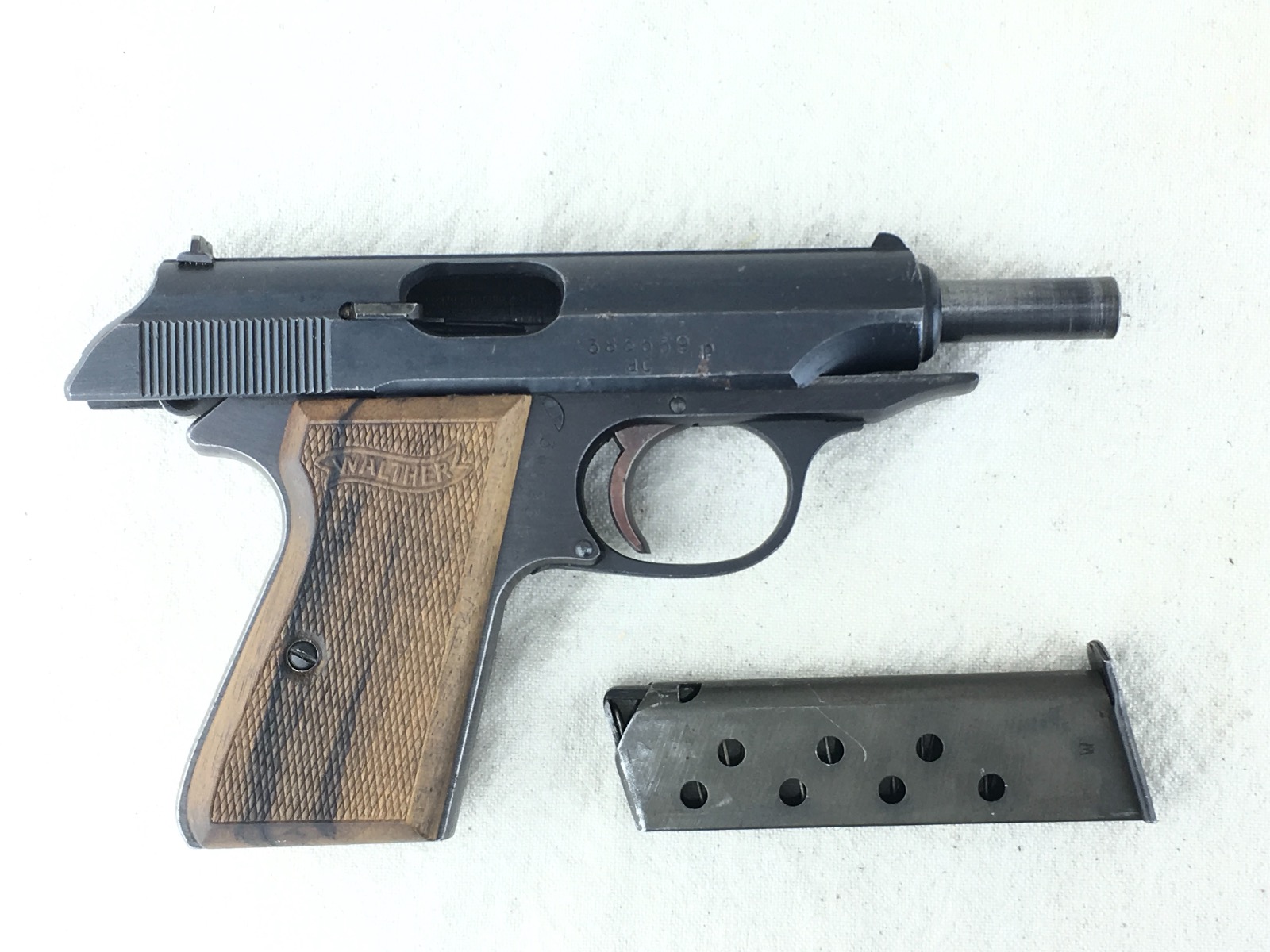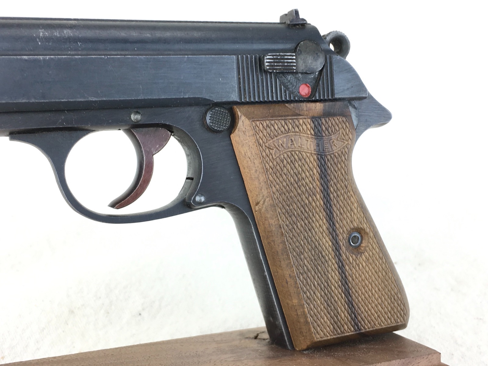 1/15/19 – This is a Walther PP from late World War II. It was most likely assembled in the factory right after the war ended. These are known as “GI put together” pistols. They are often mismatched and had the late war features, such as no slide legend and a dull-late war finish. Right side of the slide has “ac” under the serial number. There’s some very minor pitting near the “ac” on the slide, and general edge wear (about 94-96% overall). Phosphate hammer and plumb-colored trigger. Excellent bore has some very minor patina but overall clean. Mechanically correct and fully functional. It comes with the rare late war “W” magazine. Beautiful wood grips with no issues.