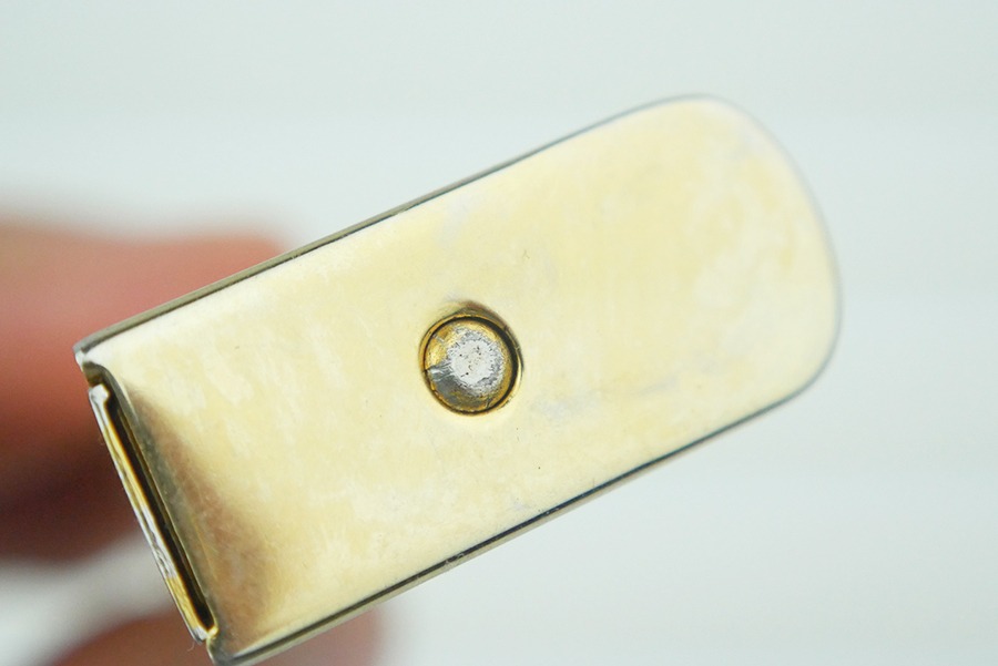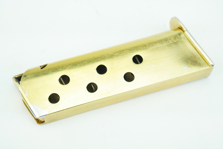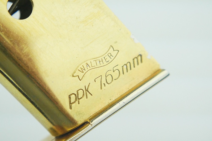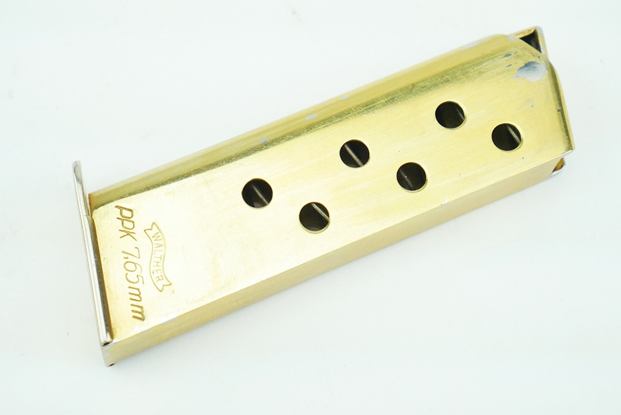 10/17/24- This is a great example of a post war factory gold gilded Walther PPK magazine. These magazines were often with gold presentation or commemorative pistols. This magazine retains most of it’s gold gilding with only minor areas of loss. This magazine has the Walther banner logo as well as “PPK 7.65mm” stamped into the side. The spring on this magazine is still strong and fully functional.