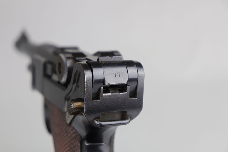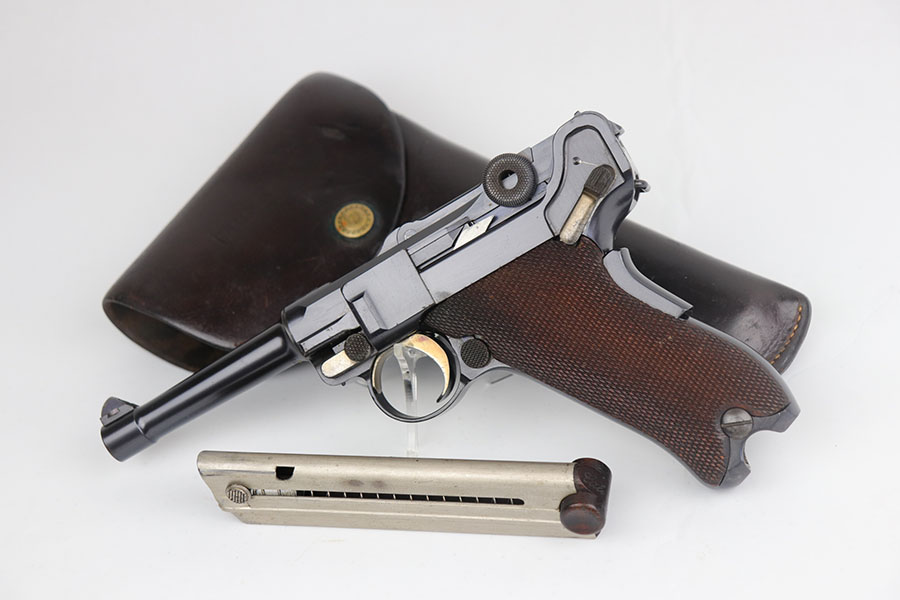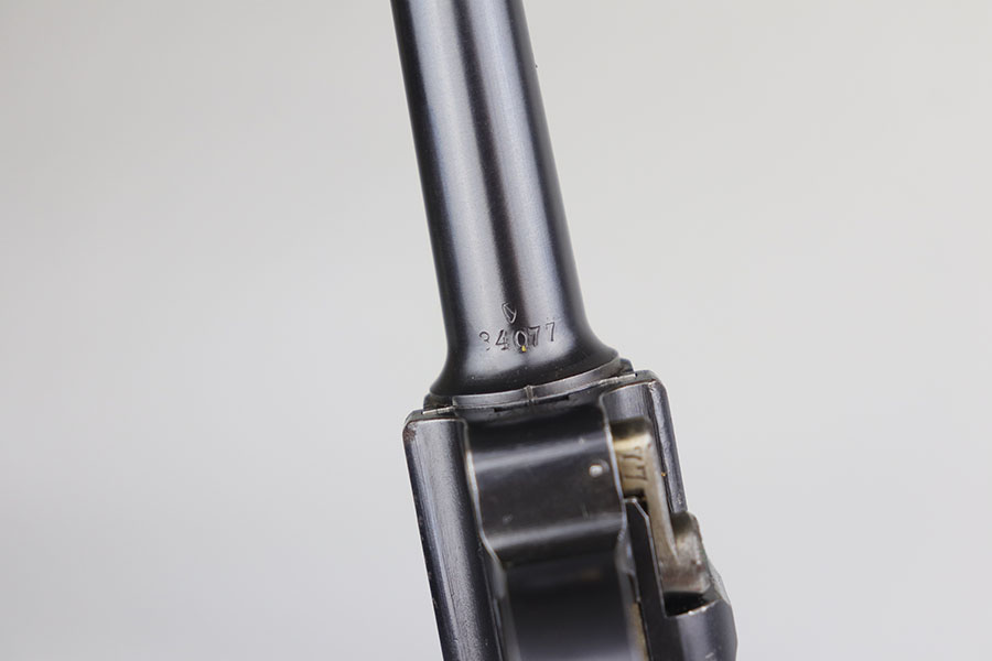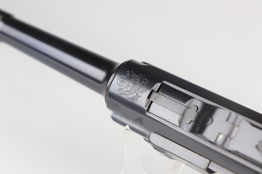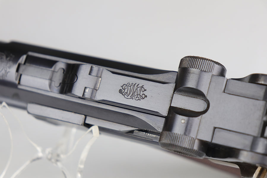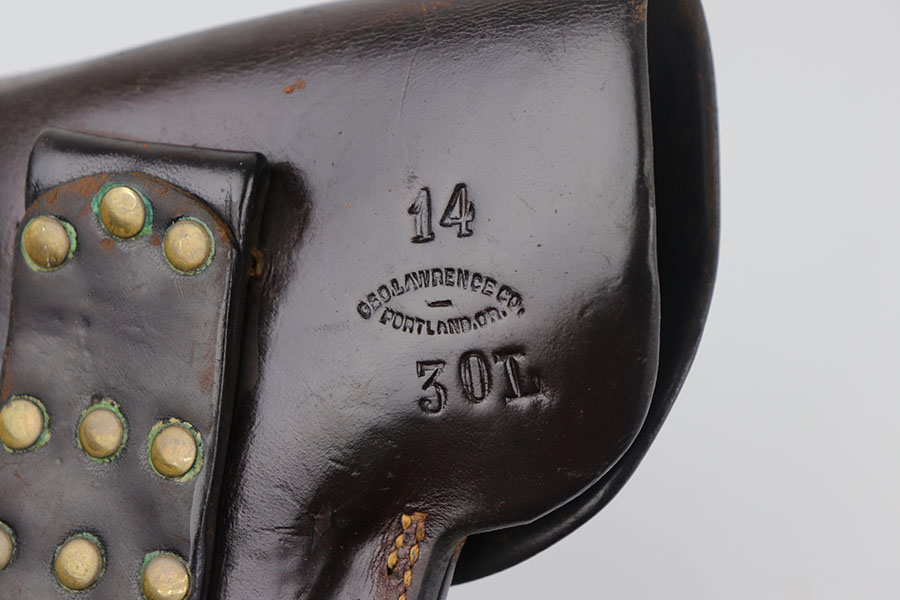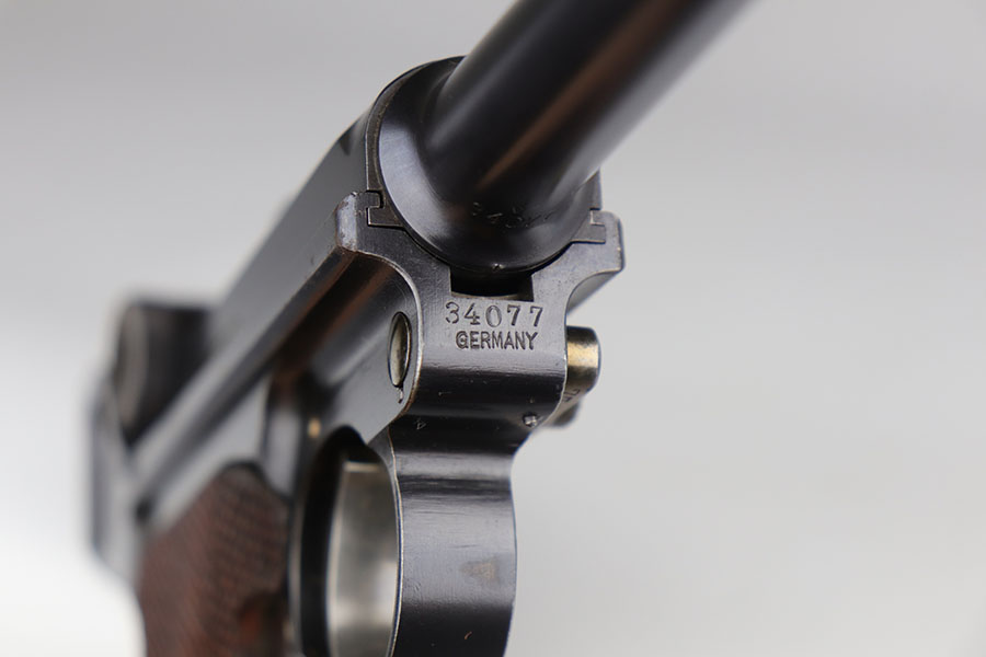 7/24/20 – This is a near-mint example of a 1906 DWM American Eagle Luger with all matching numbers and original finish. It has 99% of the original blue, with hardly any finish loss to note. There are a few minor spots of surface freckling though. One on left side frame, and one on right side muzzle and rail. Gorgeous straw small parts. The original grips are present and matching numbered to the pistol. Rare, original magazine with ‘Cal. 9m/m’ marking on the bottom. Terrific bore. Comes with a period holster that is maker marked by Geo Lawrence Co in Portland, Oregon. It’s also marked ’14’ over ’30L’ but unsure the significance.