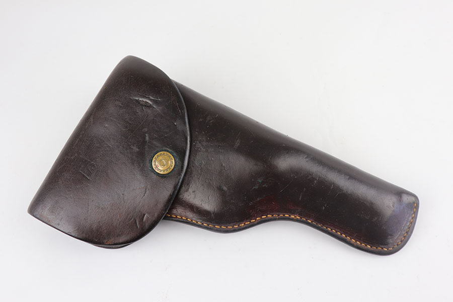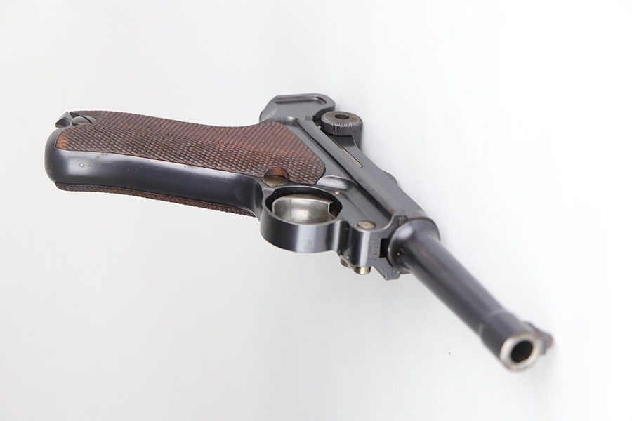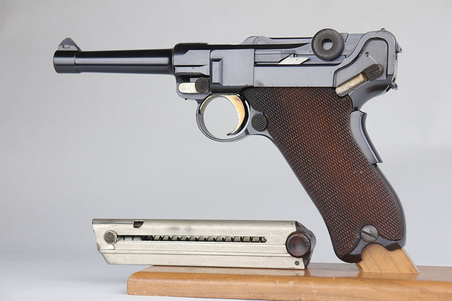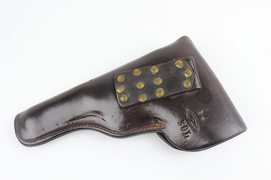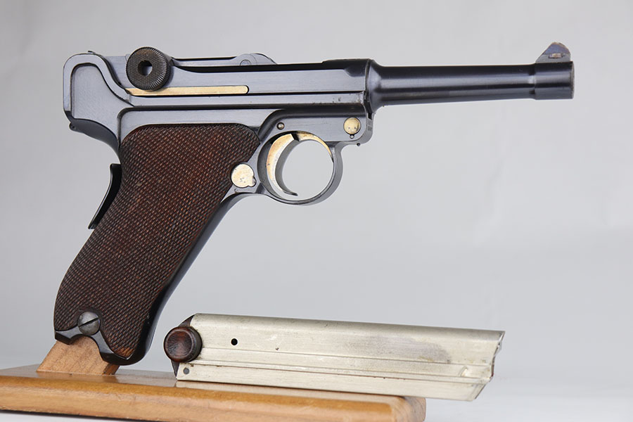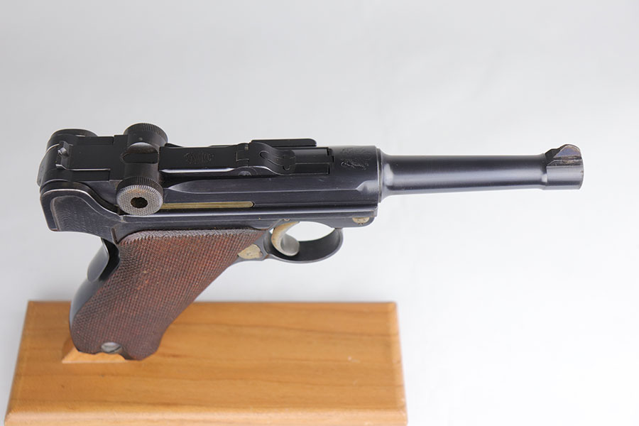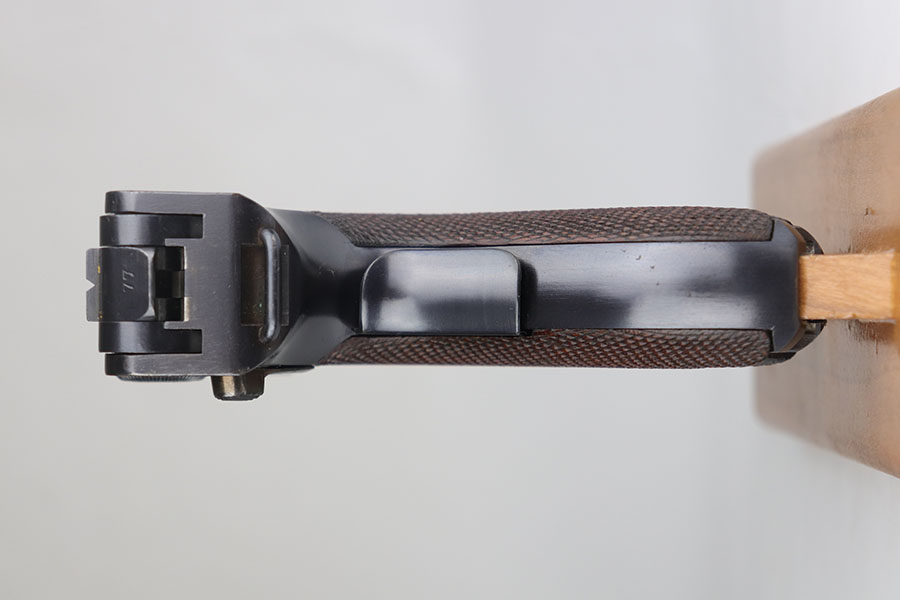 7/24/20 – This is a near-mint example of a 1906 DWM American Eagle Luger with all matching numbers and original finish. It has 99% of the original blue, with hardly any finish loss to note. There are a few minor spots of surface freckling though. One on left side frame, and one on right side muzzle and rail. Gorgeous straw small parts. The original grips are present and matching numbered to the pistol. Rare, original magazine with ‘Cal. 9m/m’ marking on the bottom. Terrific bore. Comes with a period holster that is maker marked by Geo Lawrence Co in Portland, Oregon. It’s also marked ’14’ over ’30L’ but unsure the significance.
