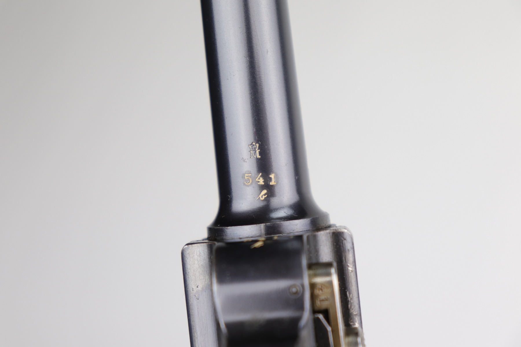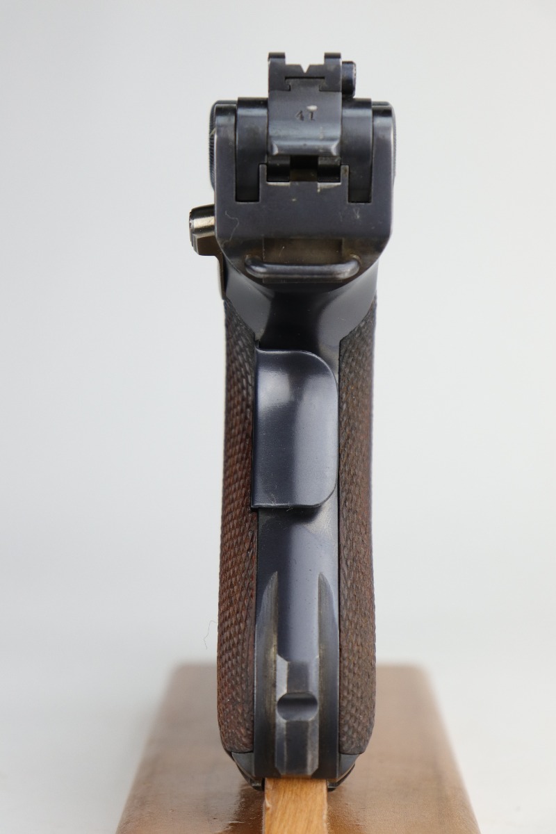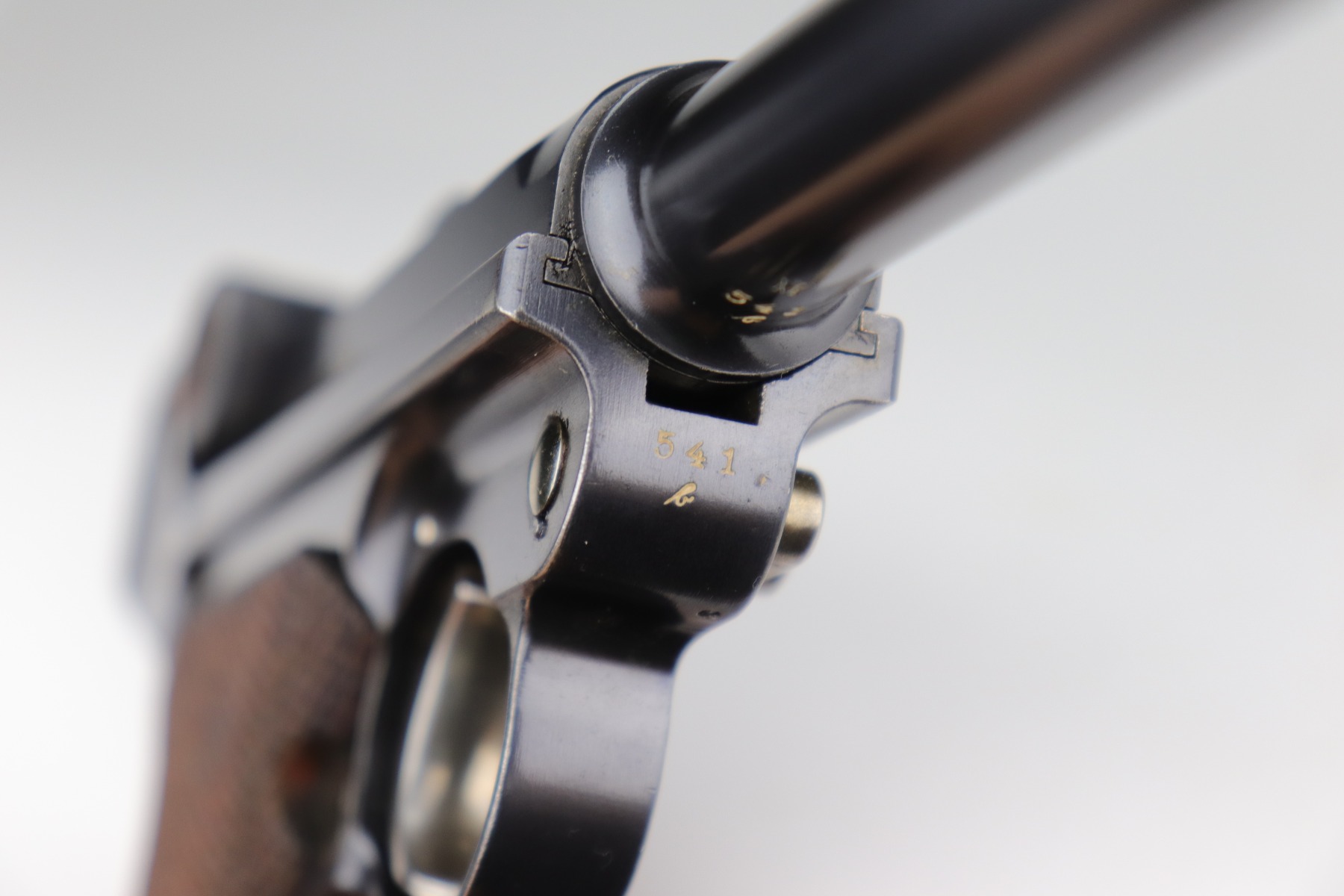 10/6/20 – This is a gorgeous and highly desirable 1906 DWM Second Issue Navy Luger. Only about 2,000 of this particular variation were manufactured and fall into the 9000a – 998b serial range. The gun is all matching and has the correct Navy “M” markings on the left side of the slide. The chamber is blank, which is correct for this variation. The gun is in minty condition, having retained about 98% of its original bluing. There is very minor muzzle wear and on some of the high edges. There is also a spot of wear and a few marks on the front strap. Very light scratch on the side plate. Minty grips. Comes with a period-correct Navy magazine that does not match the gun. The bore is shiny and has strong rifling with just very light pin-pricking in the grooves.