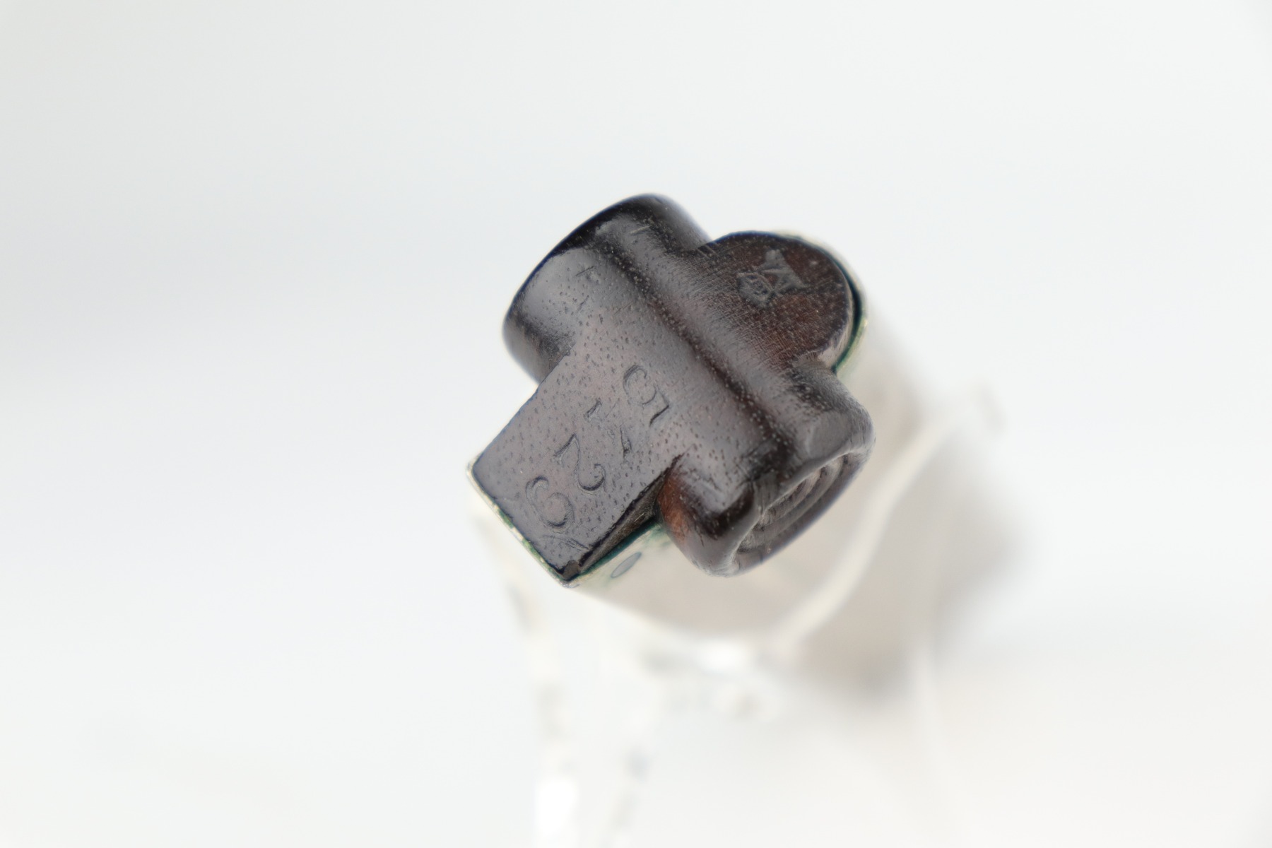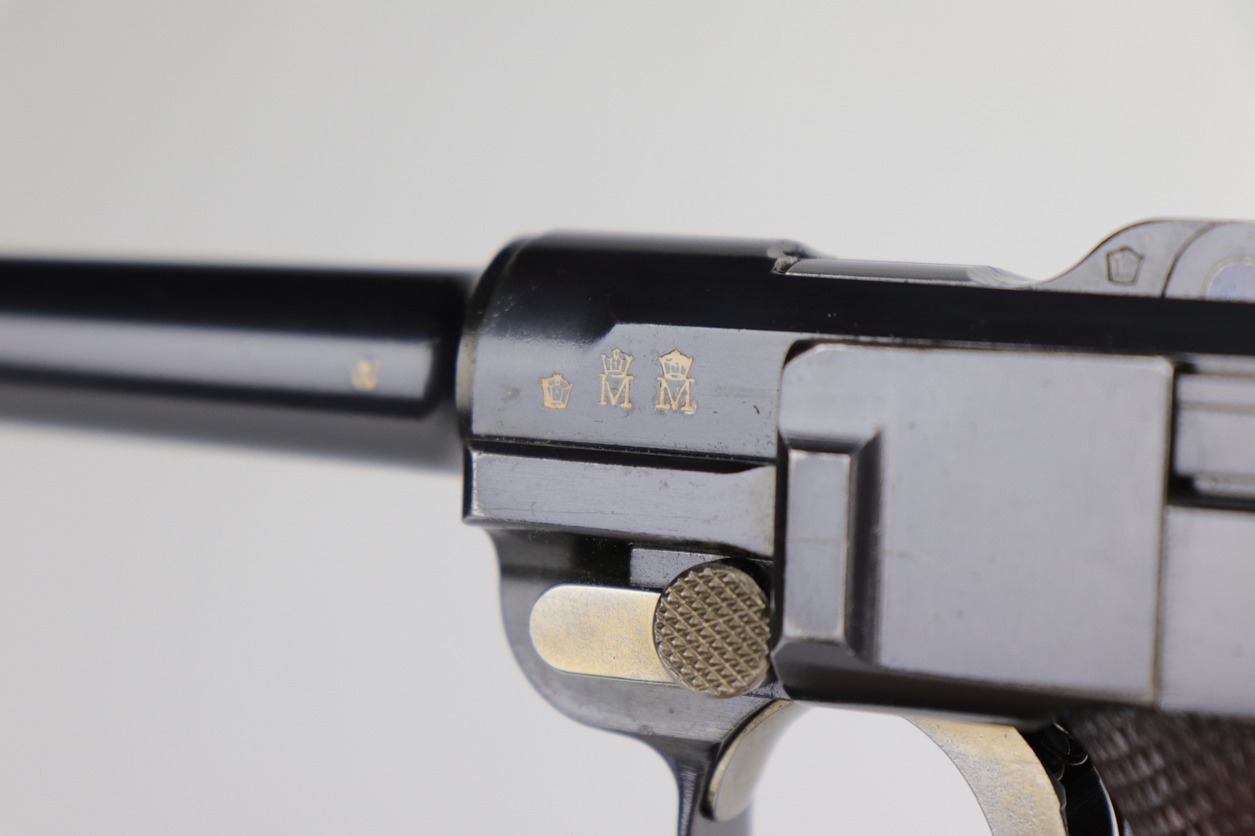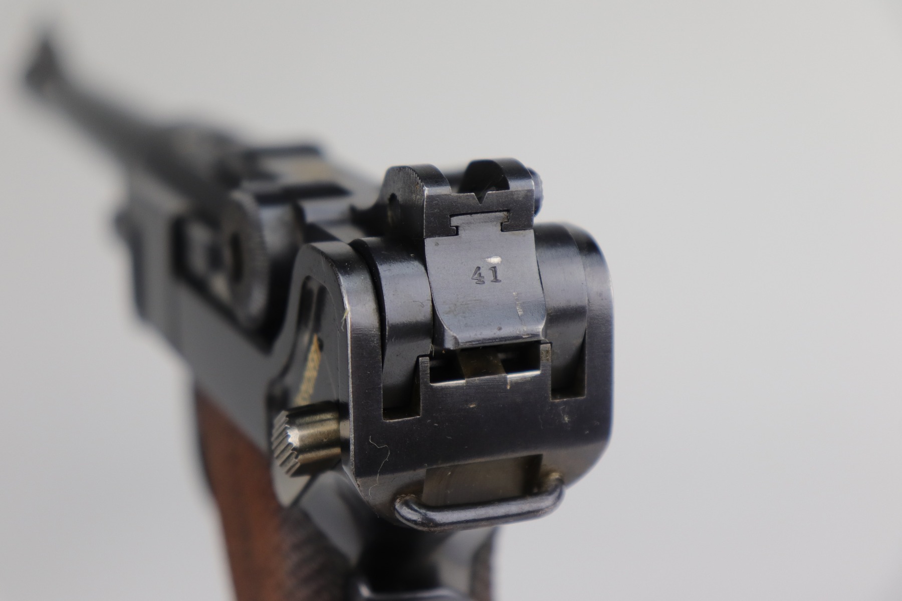10/6/20 – This is a gorgeous and highly desirable 1906 DWM Second Issue Navy Luger. Only about 2,000 of this particular variation were manufactured and fall into the 9000a – 998b serial range. The gun is all matching and has the correct Navy “M” markings on the left side of the slide. The chamber is blank, which is correct for this variation. The gun is in minty condition, having retained about 98% of its original bluing. There is very minor muzzle wear and on some of the high edges. There is also a spot of wear and a few marks on the front strap. Very light scratch on the side plate. Minty grips. Comes with a period-correct Navy magazine that does not match the gun. The bore is shiny and has strong rifling with just very light pin-pricking in the grooves.