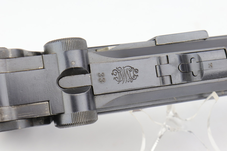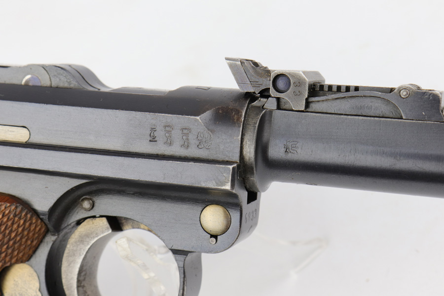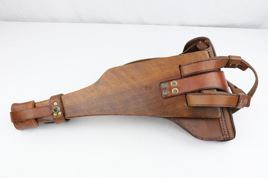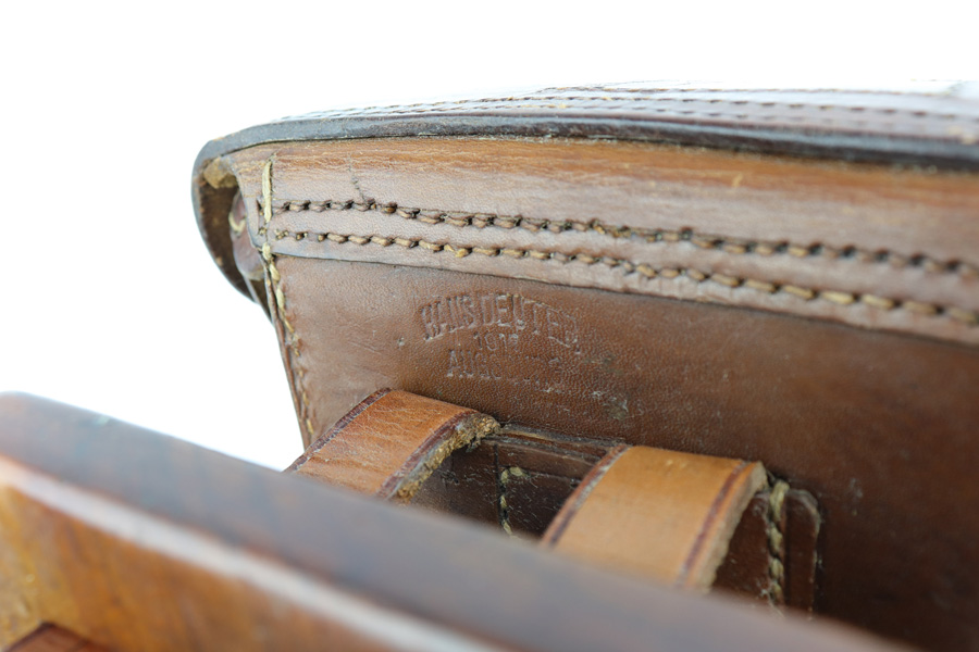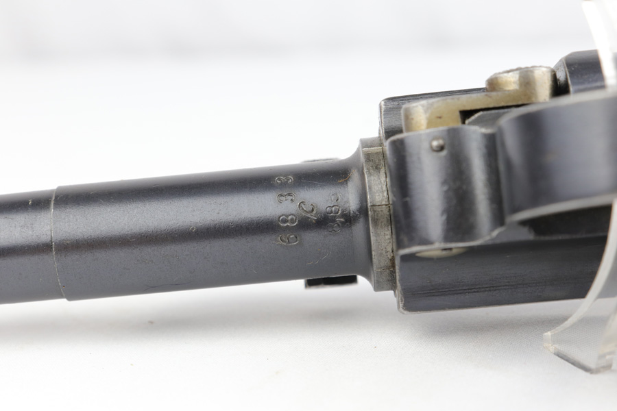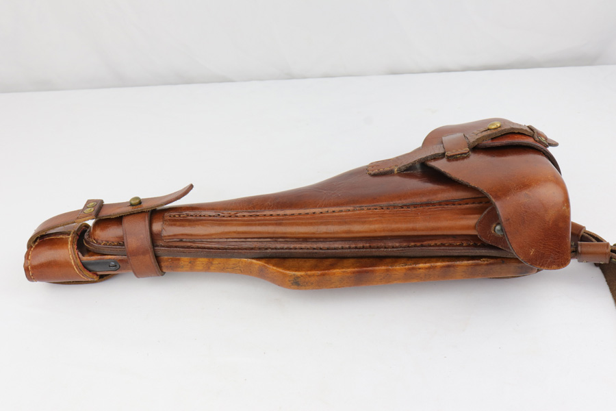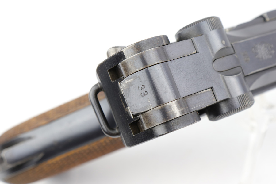 3/25/19 – This is a gorgeous example of a complete DWM Artillery Luger rig, made in 1917, with holster, tool, cleaning rod and stock included. The pistol is all matching and original with 98% blue remaining, showing only minor holster wear on the muzzle, side plate and bottom of the front strap. Matching, original grips and period correct but mismatched magazine. Small parts still show 50-75% straw. Minty bore. The pistol comes with an original but mismatched stock with sharp Crown/G proof. The holster is minty and all original with sharp maker mark and 1917 date on the back. The back is also stamped “GERMANY” as it was sent for export after WW1. Original tool and cleaning rod are present. The leather fittings to the stock, such as the straps and cup, are reproduction additions to complete the rig – they were made and affixed by professional holster worker, Jerry Burney.