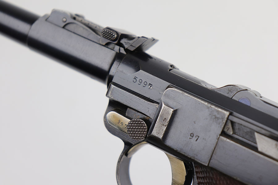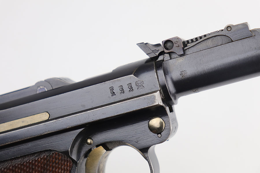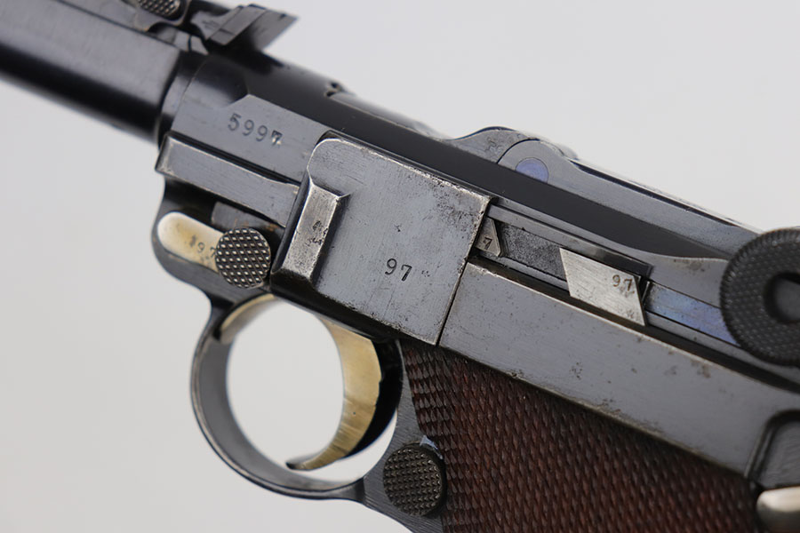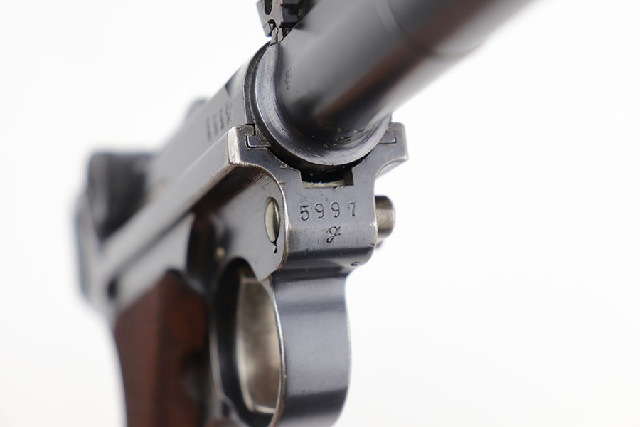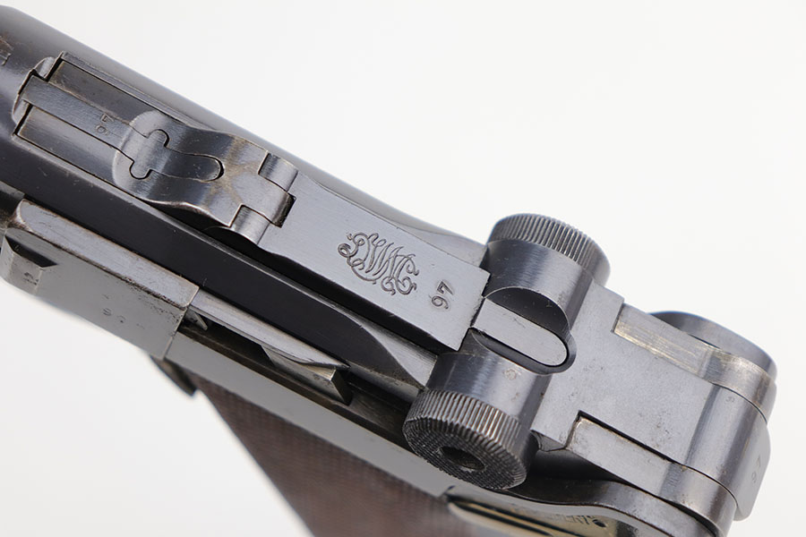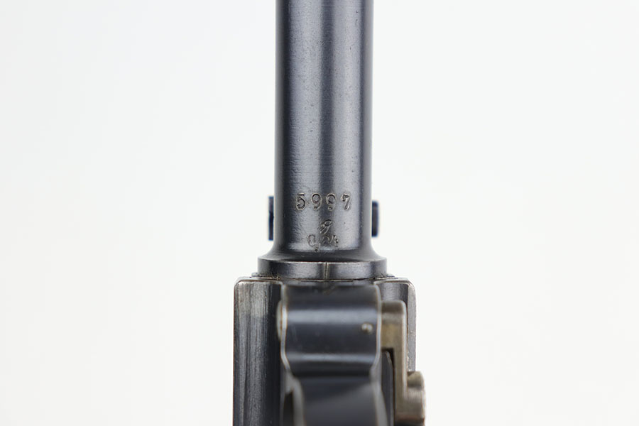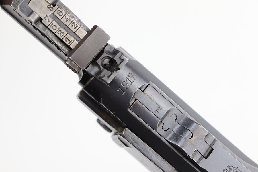8/27/20 – This is a terrific and all original DWM Artillery Luger from 1917 with mint holster. The gun is fully matching, all the way down to the grips and magazine. The blue rates at 96-97% with wear on the common high points from the holster, mainly the muzzle and sideplate. Straw parts rate at 80-90%. Bore is shiny with strong rifling, but a bit of frost in the grooves. The grips are finely checkered and without defect. The holster is one of the nicest you’ll see, with 1918 manufacture date and fairly sharp maker mark.