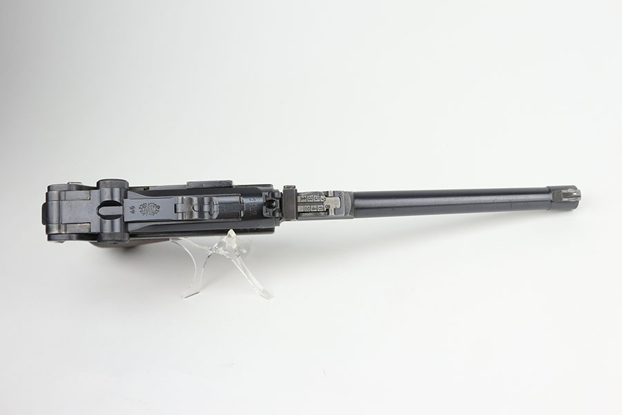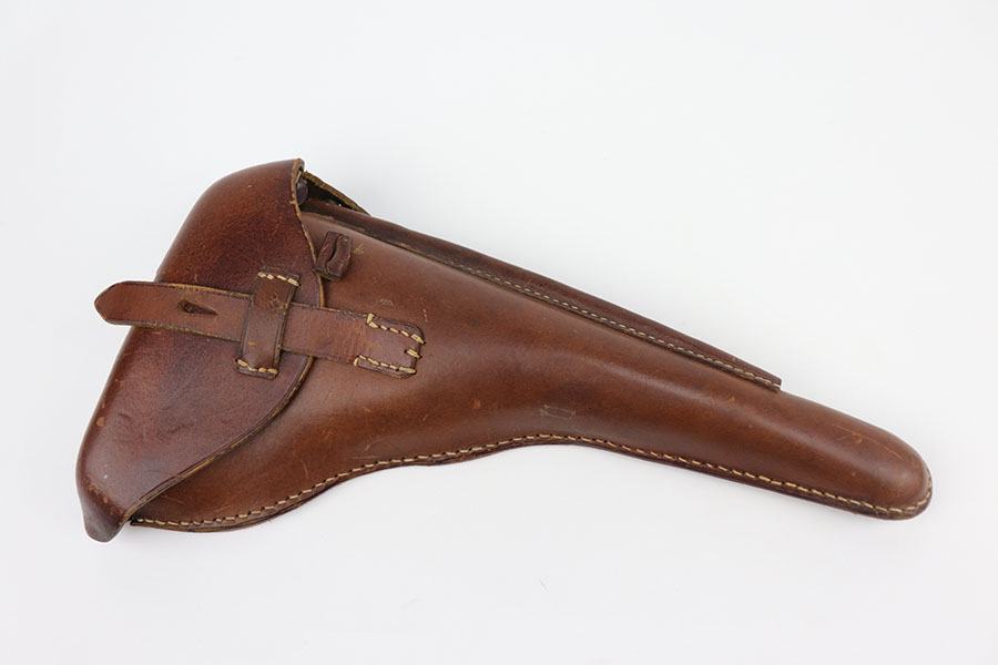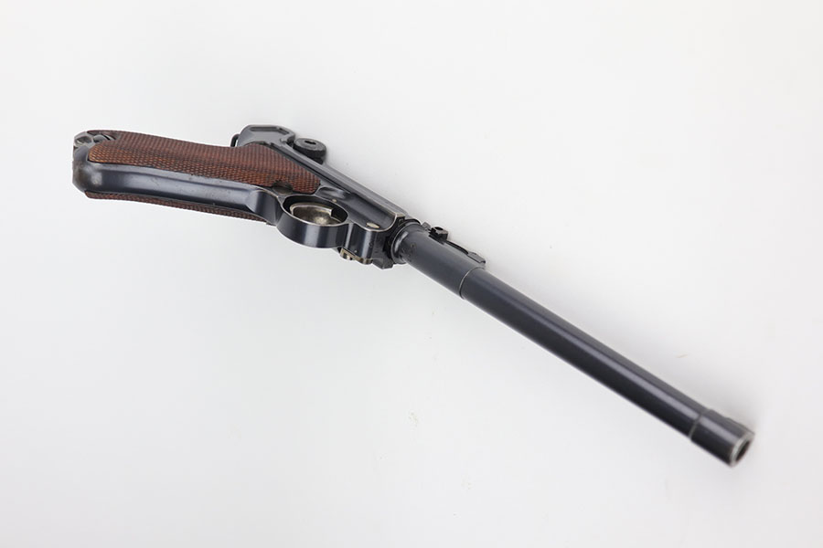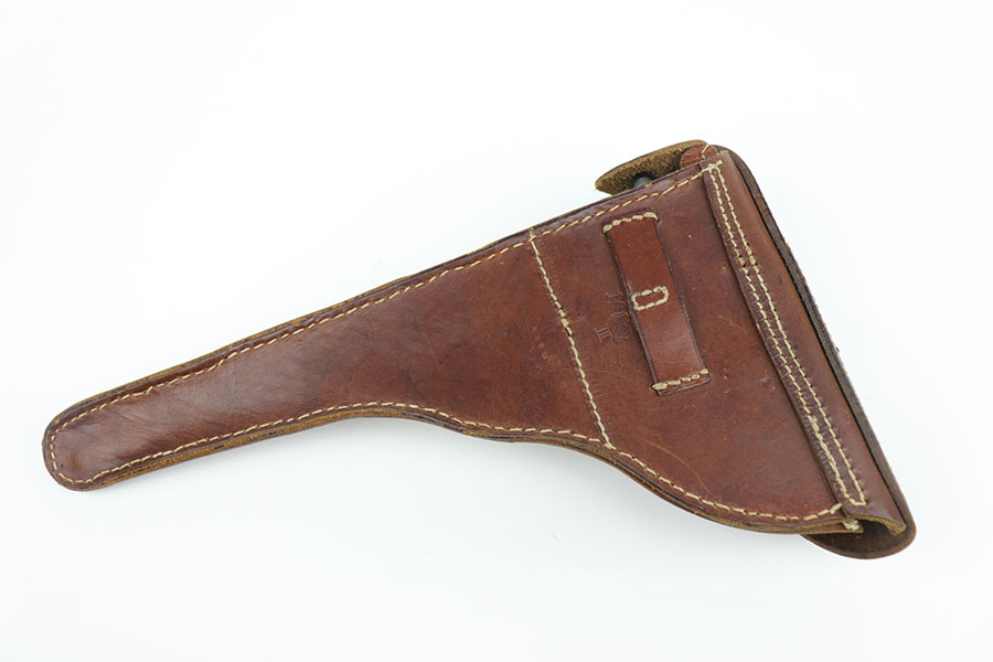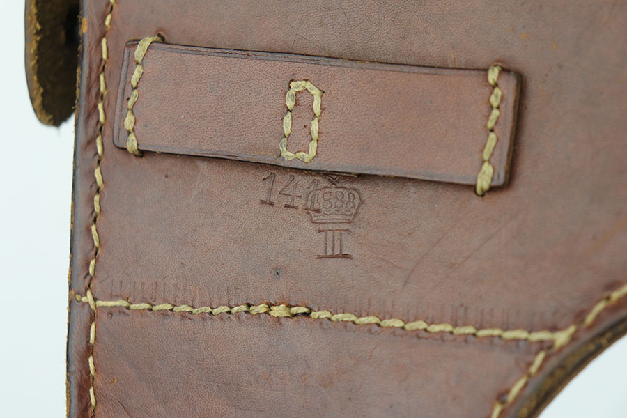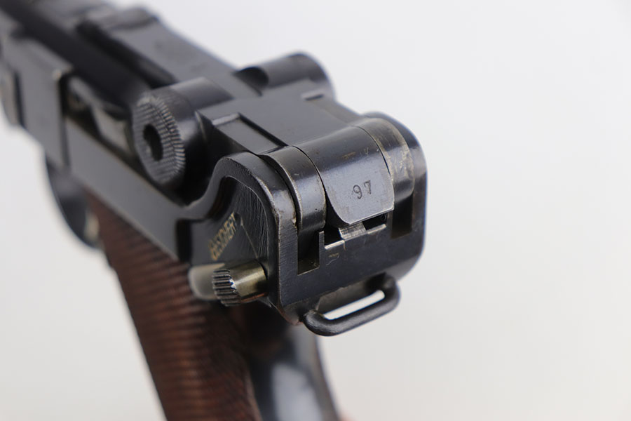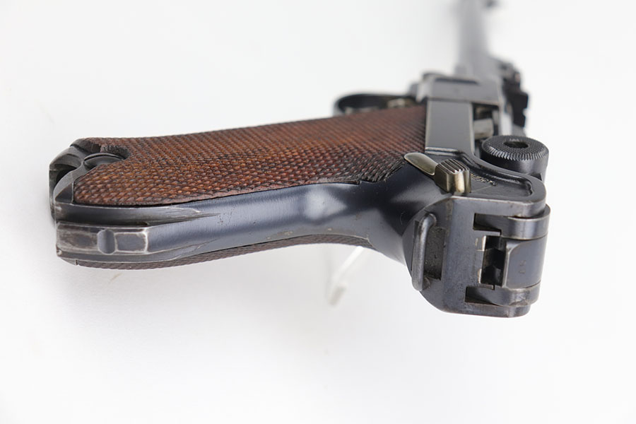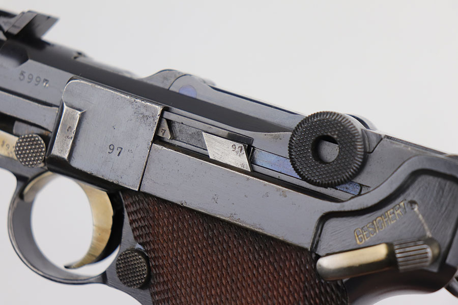 8/27/20 – This is a terrific and all original DWM Artillery Luger from 1917 with mint holster. The gun is fully matching, all the way down to the grips and magazine. The blue rates at 96-97% with wear on the common high points from the holster, mainly the muzzle and sideplate. Straw parts rate at 80-90%. Bore is shiny with strong rifling, but a bit of frost in the grooves. The grips are finely checkered and without defect. The holster is one of the nicest you’ll see, with 1918 manufacture date and fairly sharp maker mark.