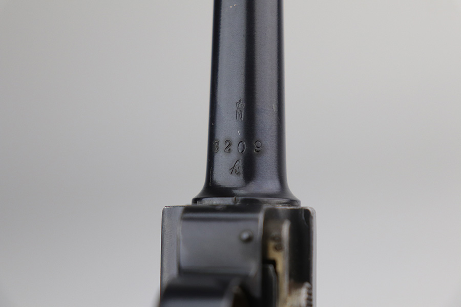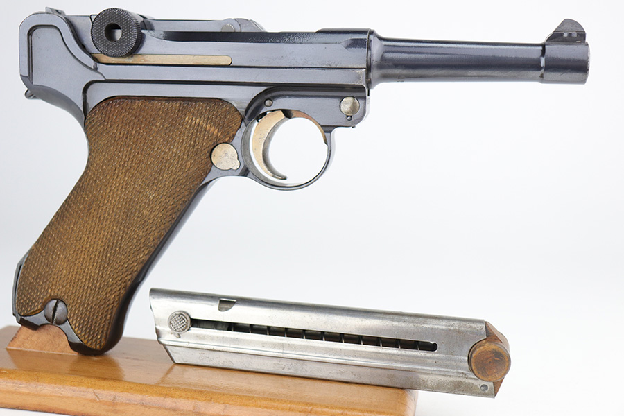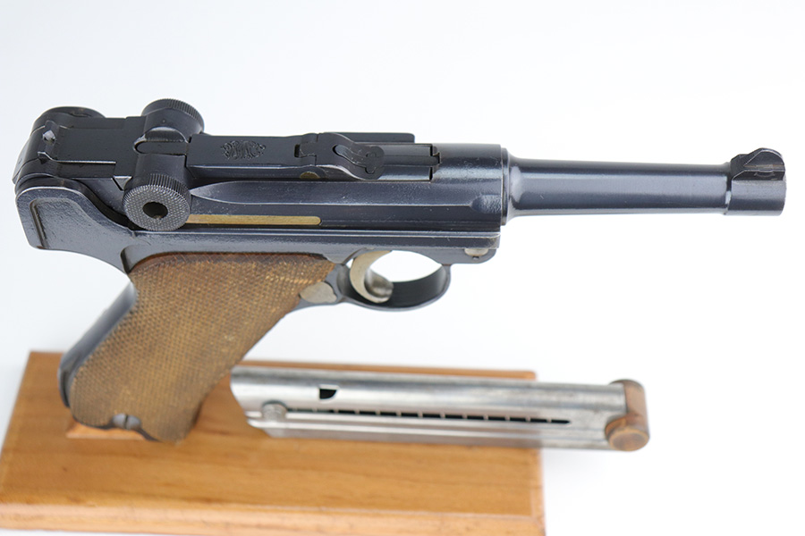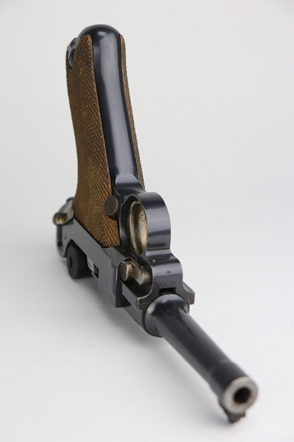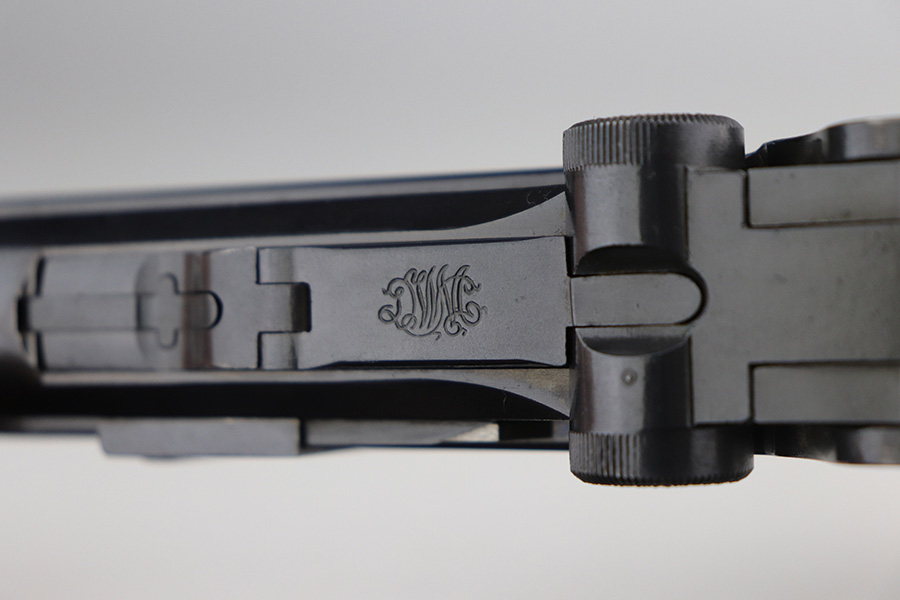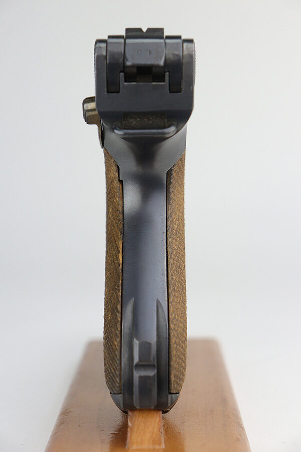 9/15/21 – This is a gorgeous, mint example of a DWM luger sold in the commercial market in the 1920’s. Chambered in .30 Luger. It is all matching and has the proper “Crown N” commercial proofs. No chamber date. It has retained more than 98% of its bluing with just a hint of wear on some of the high edges and around the muzzle. Some wear and tiny dots of oxidation on the straw small parts. Comes with minty wood grips and a period-correct blank-bottom commercial magazine. The rifling in the bore is a bit worn with frosting in the grooves.