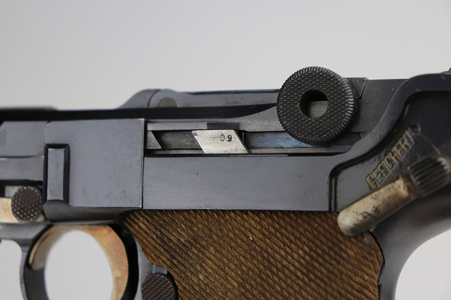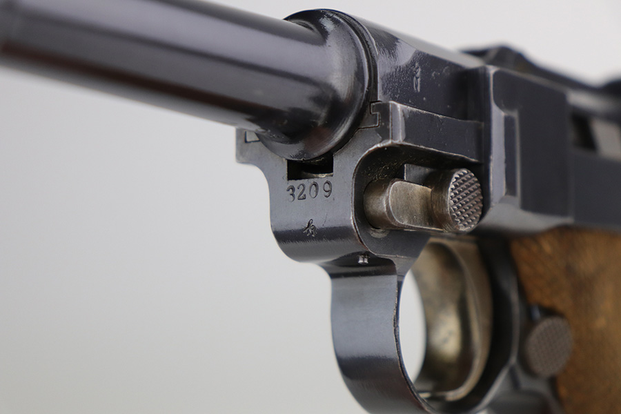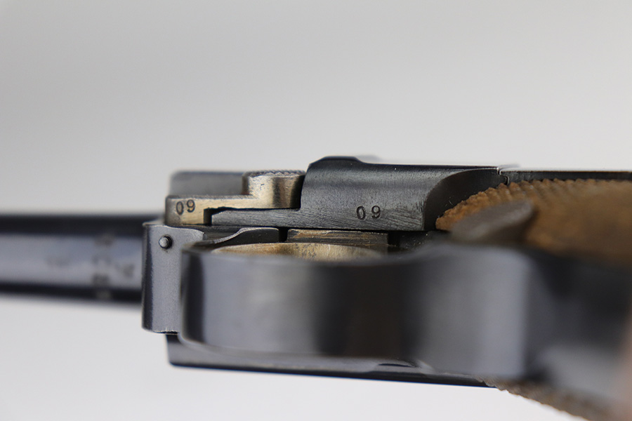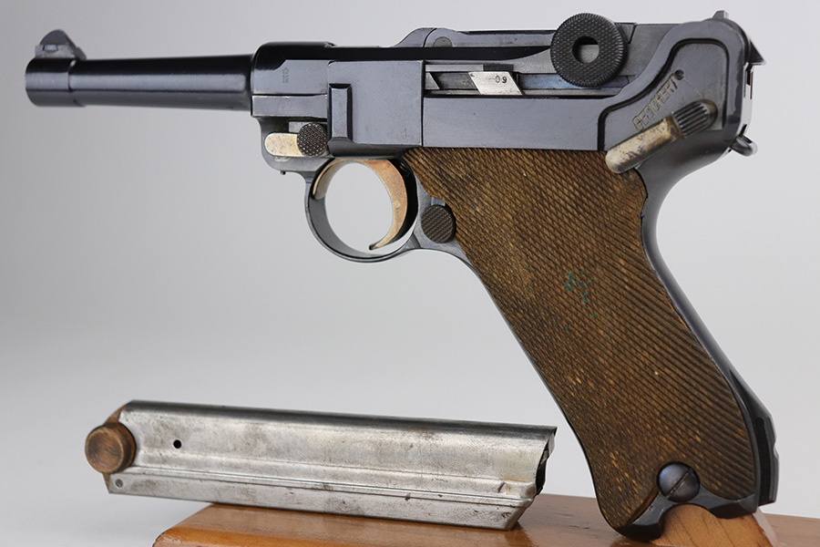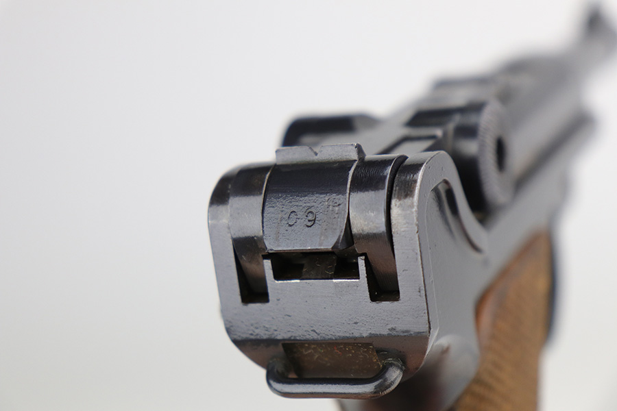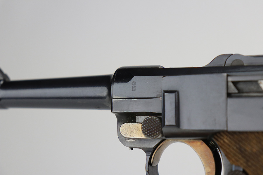 9/15/21 – This is a gorgeous, mint example of a DWM luger sold in the commercial market in the 1920’s. Chambered in .30 Luger. It is all matching and has the proper “Crown N” commercial proofs. No chamber date. It has retained more than 98% of its bluing with just a hint of wear on some of the high edges and around the muzzle. Some wear and tiny dots of oxidation on the straw small parts. Comes with minty wood grips and a period-correct blank-bottom commercial magazine. The rifling in the bore is a bit worn with frosting in the grooves.