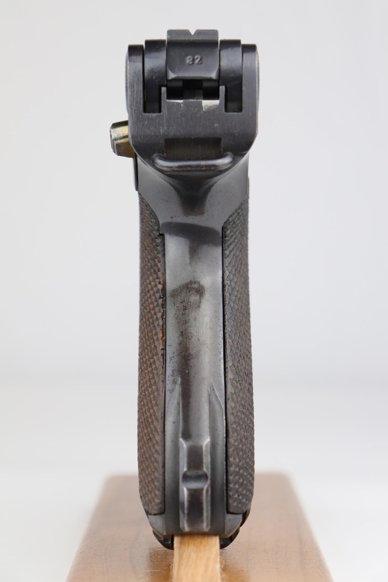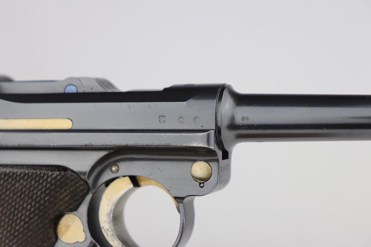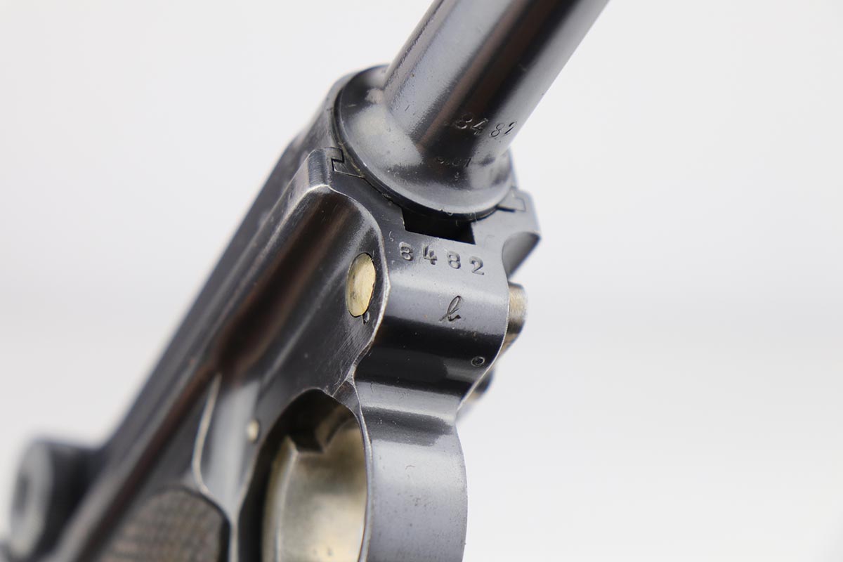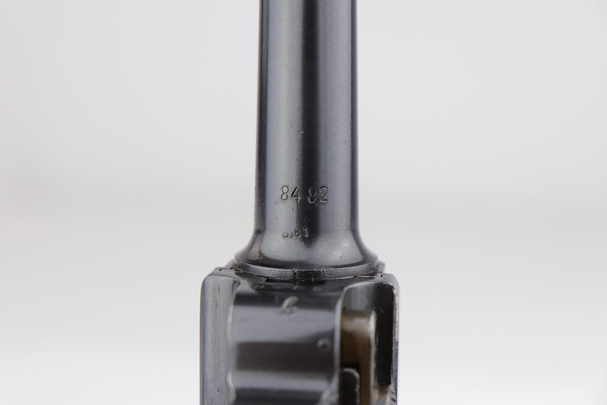 5/24/19 – This is a gorgeous example of a Mauser Luger from 1936, with its original matching magazine, as it would have been issued to the German Army. All matching and correct, the pistol has about 96-98% original blue remaining, with minor high edge wear and some thinning of the back strap. There’s also a couple areas of pinpricking on the sideplate. Sharp, original grips that are unmarked. Small parts still retain about 90% original straw. Bore has minor frost but is otherwise shiny with good rifling.