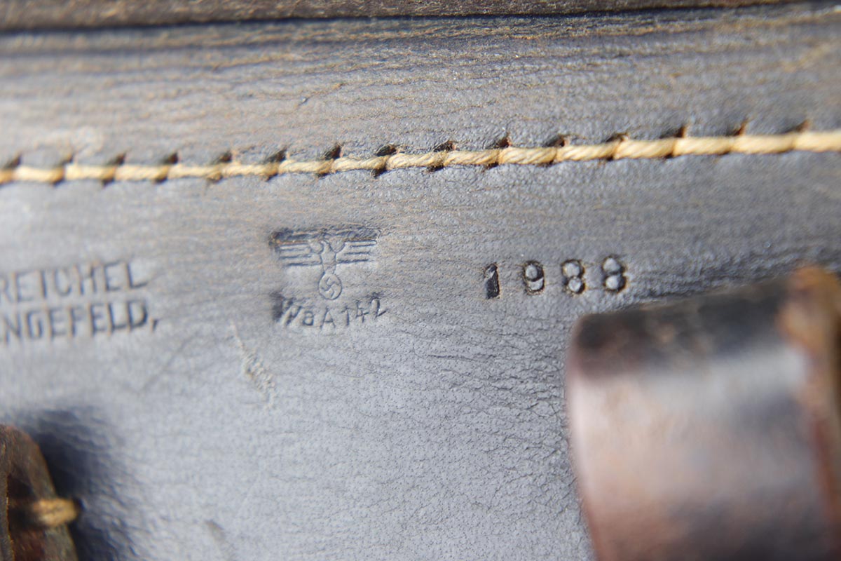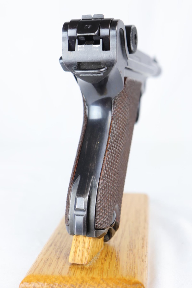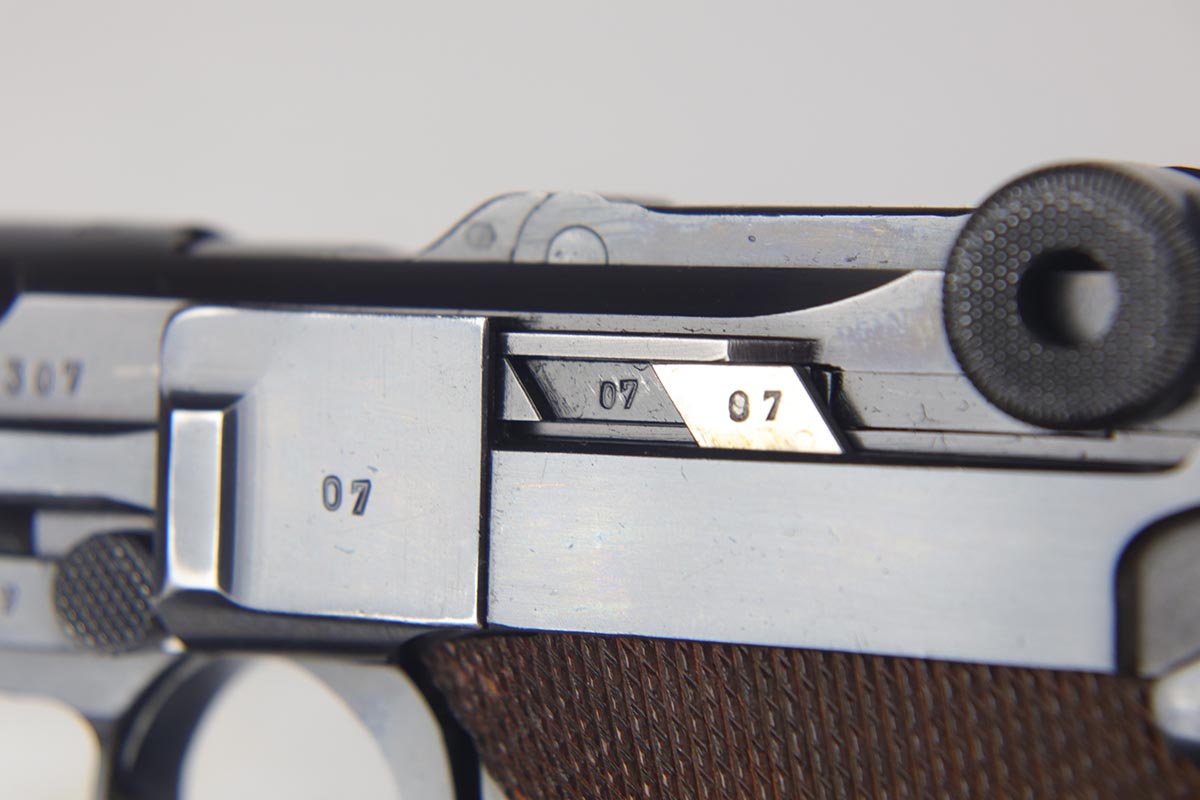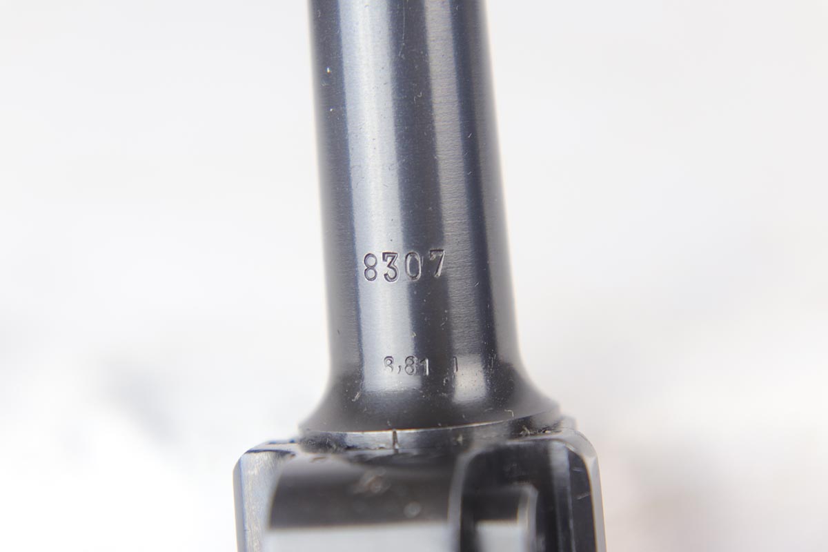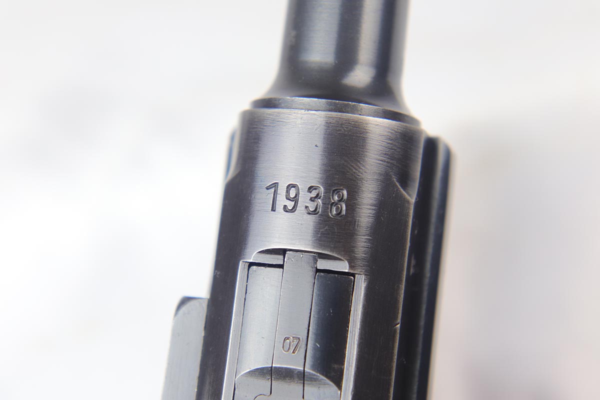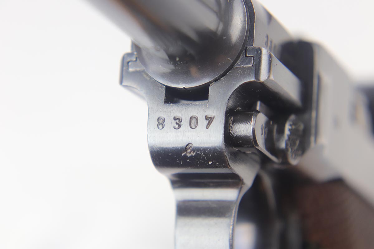 8/15/18 – This is a fantastic example of a completely matching and original Mauser Luger rig from 1938. The pistol comes with both original matching magazines, proper tool and a minty 1938 holster. The pistol retains 98% original blue with minor holster wear on the high points. Original matching numbered grips and a terrific bore. Holster shows little age or use with waffen mark, maker mark and 1938 manufacture date. Proper E/63 tool.