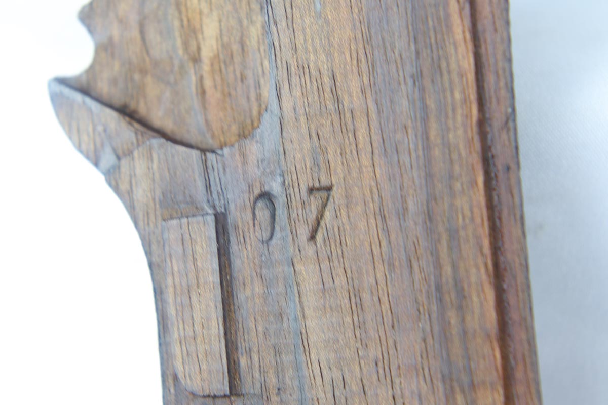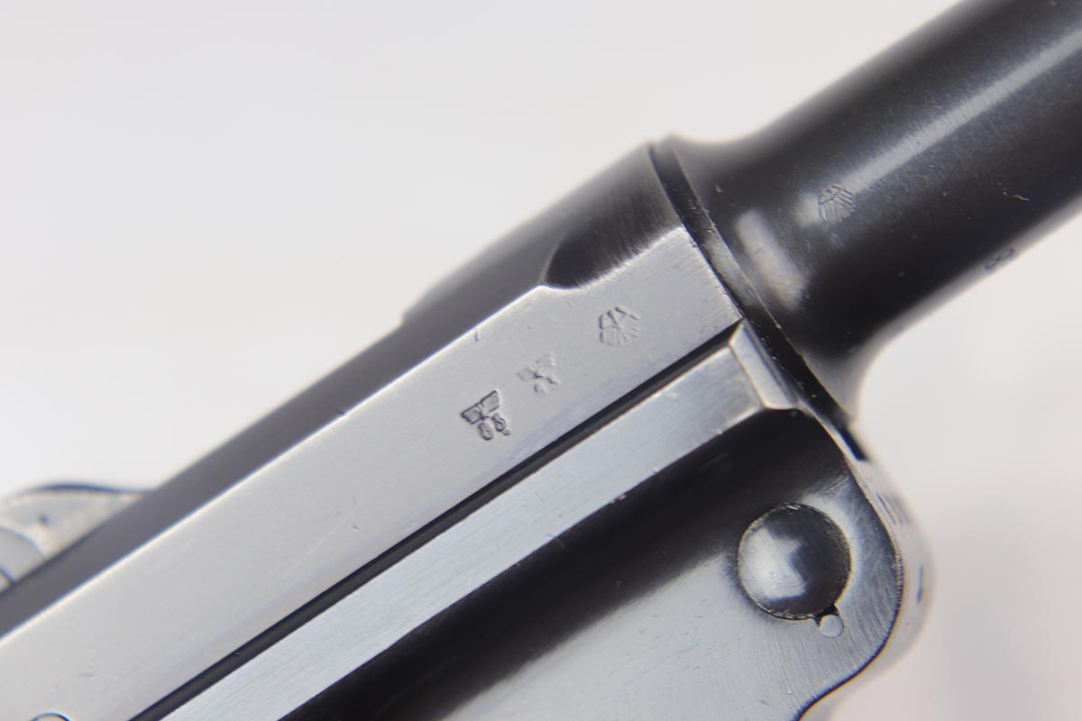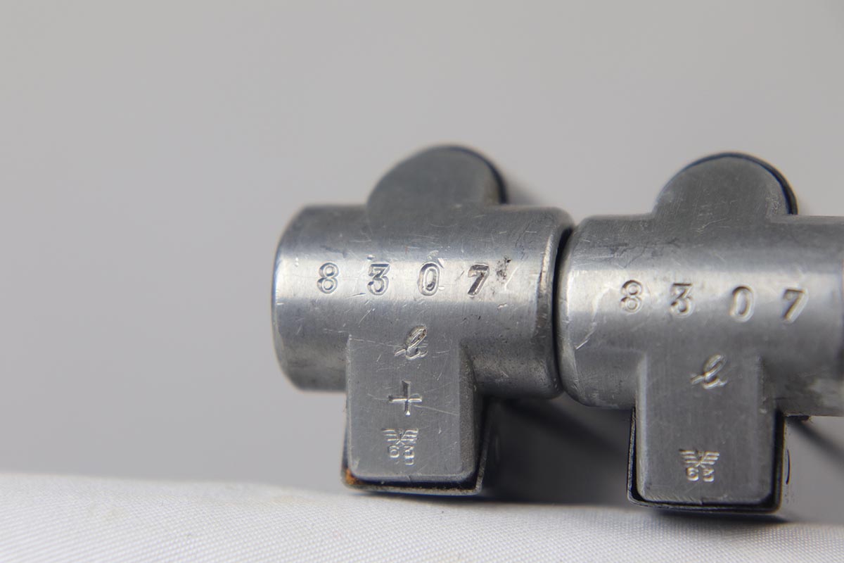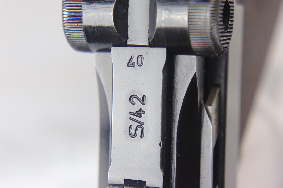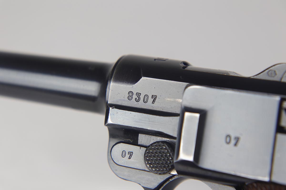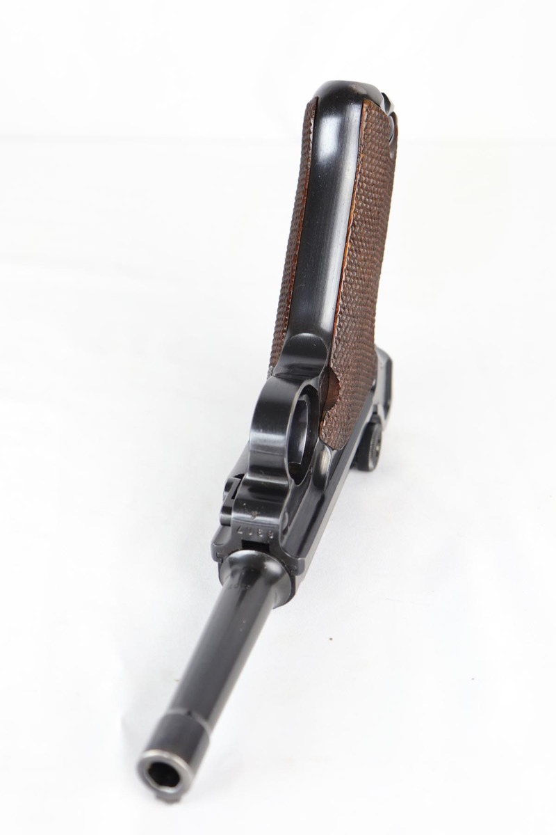 8/15/18 – This is a fantastic example of a completely matching and original Mauser Luger rig from 1938. The pistol comes with both original matching magazines, proper tool and a minty 1938 holster. The pistol retains 98% original blue with minor holster wear on the high points. Original matching numbered grips and a terrific bore. Holster shows little age or use with waffen mark, maker mark and 1938 manufacture date. Proper E/63 tool.