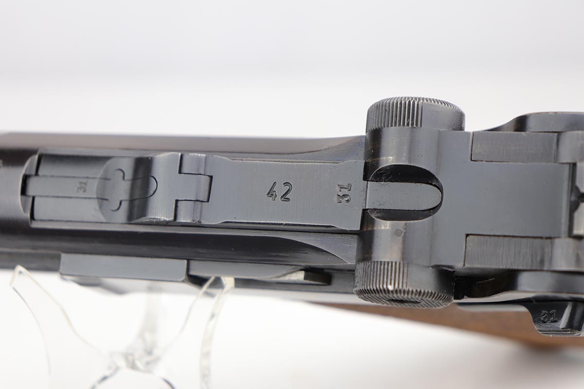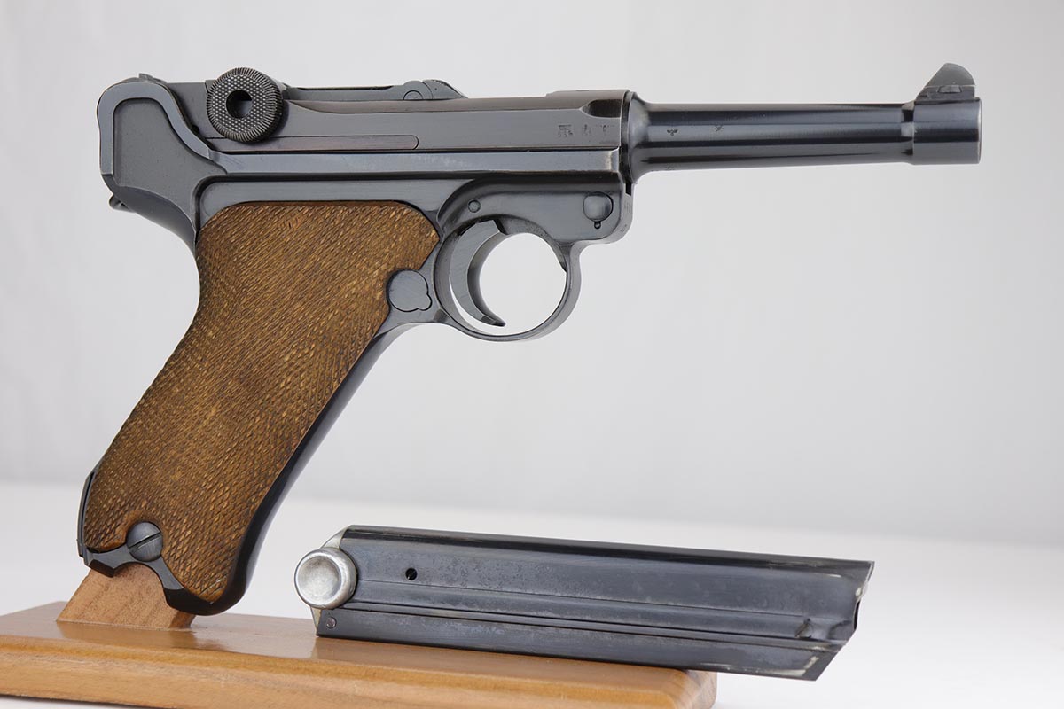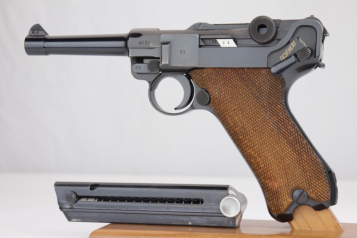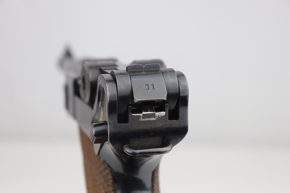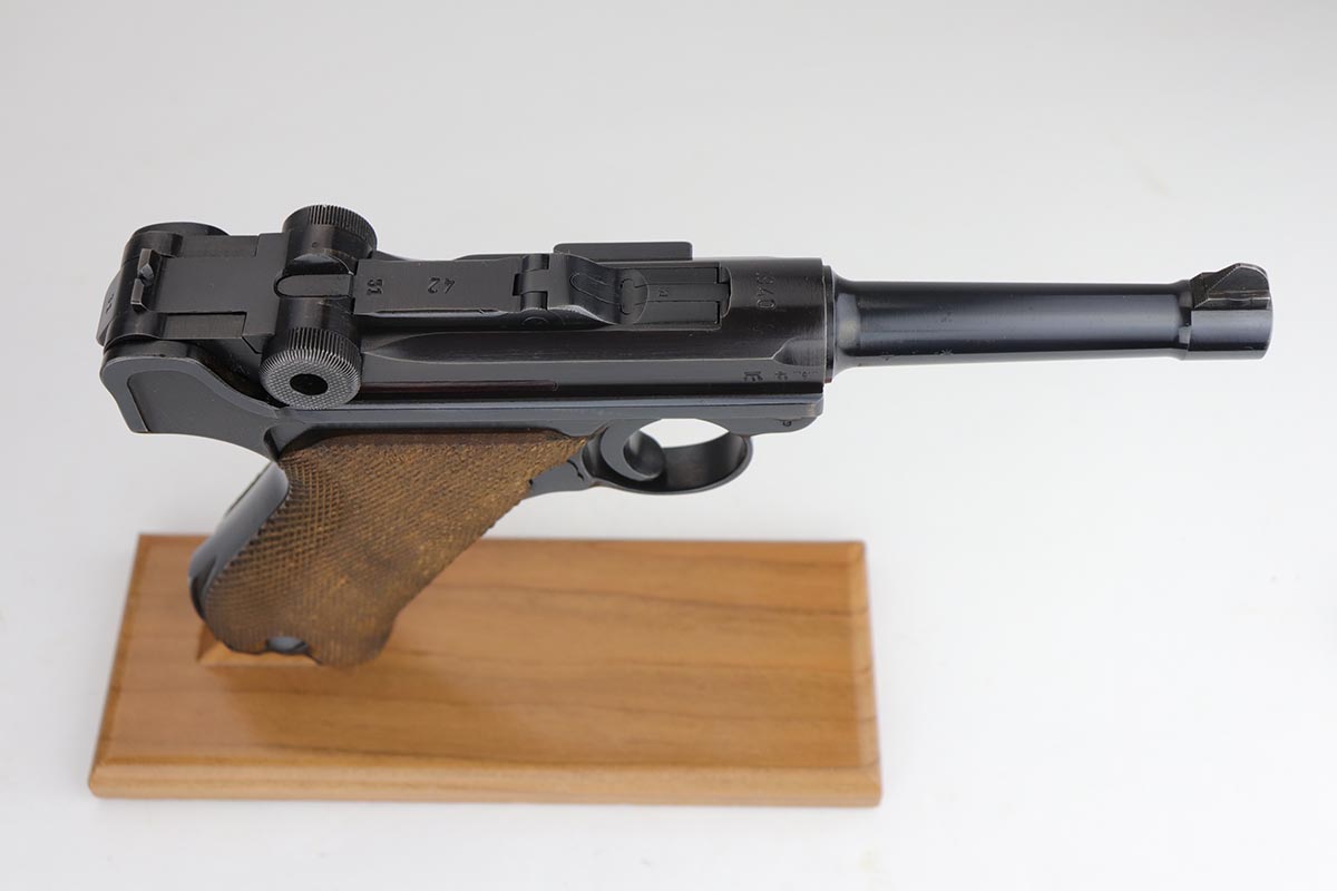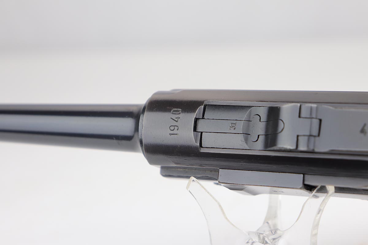9/18/19 – This is an absolute beauty of a Mauser Luger from 1940, with all matching numbers, including the grips. The blue rates at 98-99% with a hint of edge wear and a spot of finish loss on the grip strap. The grips are numbered to the pistol and sharply checkered, with just a minor chip in the bottom of the left panel. Mirror bore. The magazine is also numbered to the pistol but we do not believe the numbering is factory original.