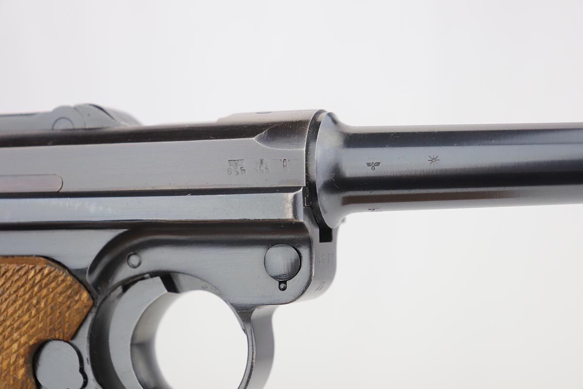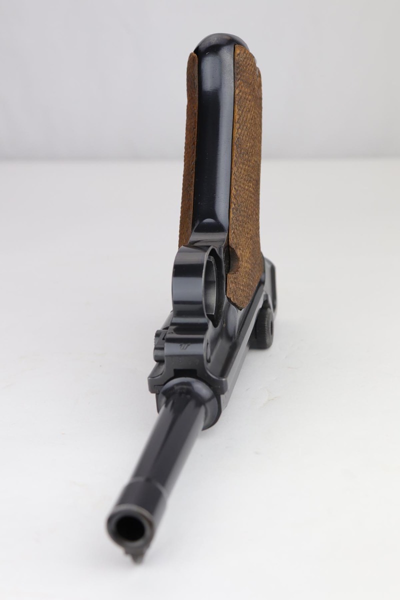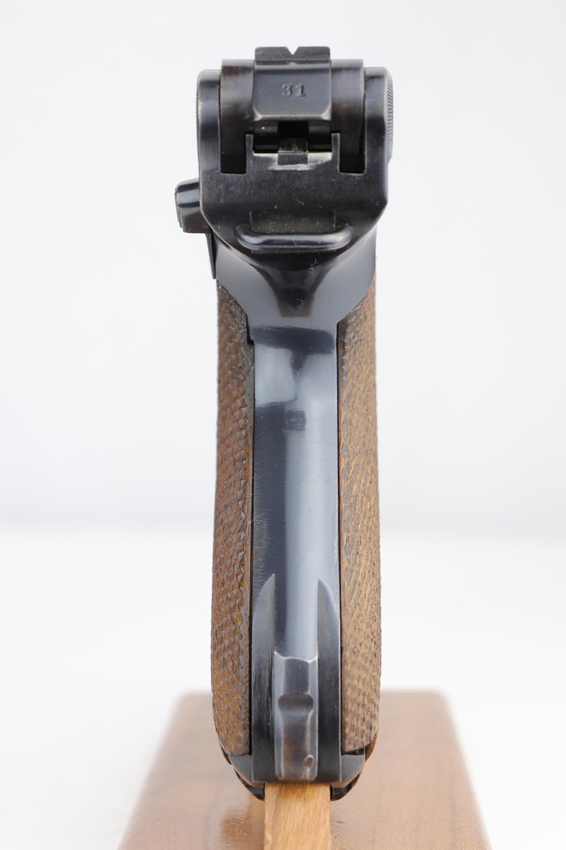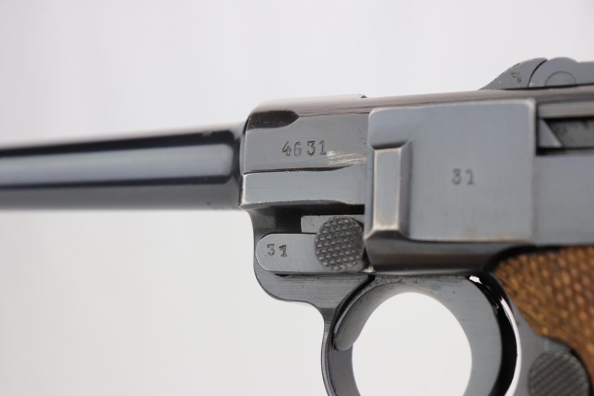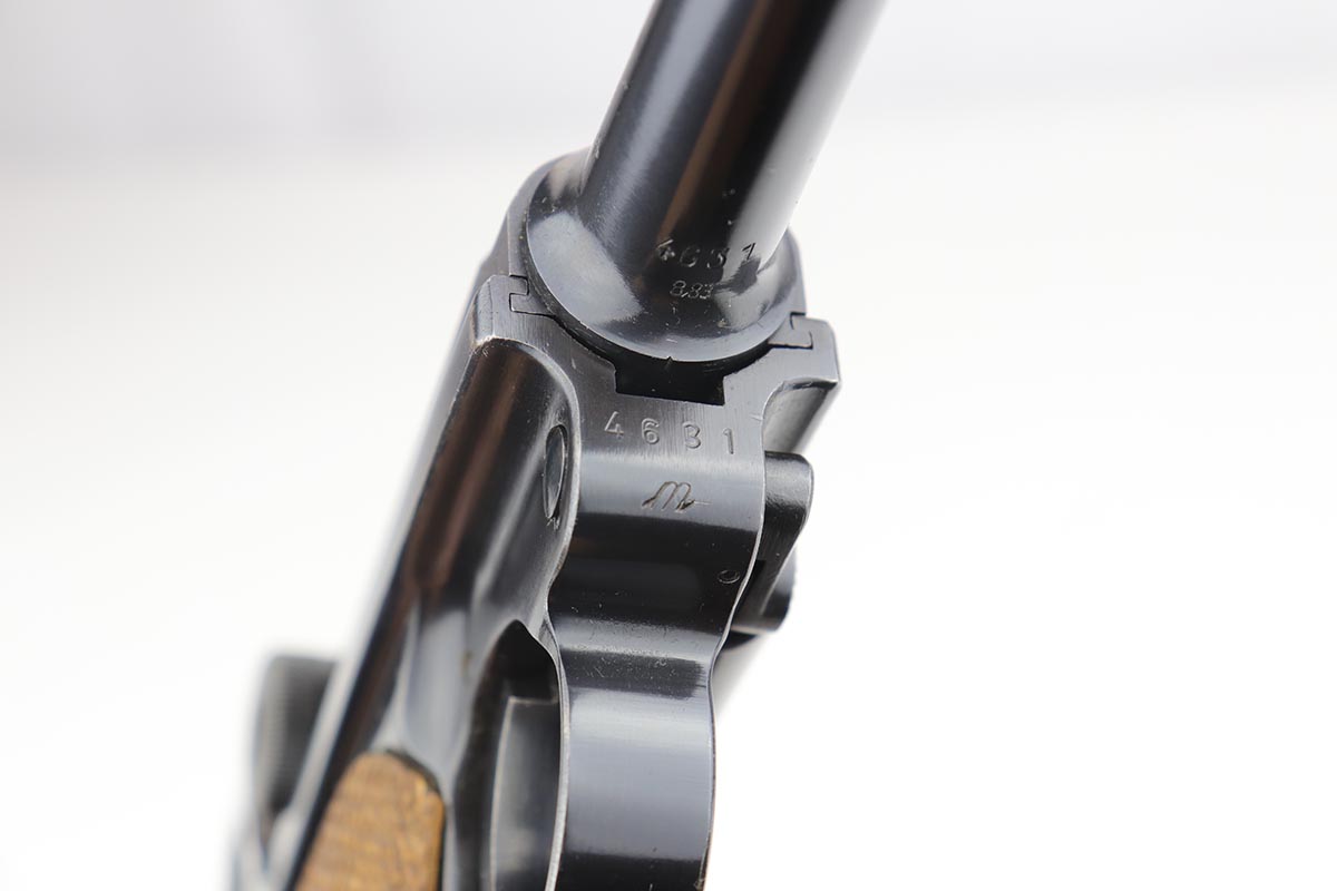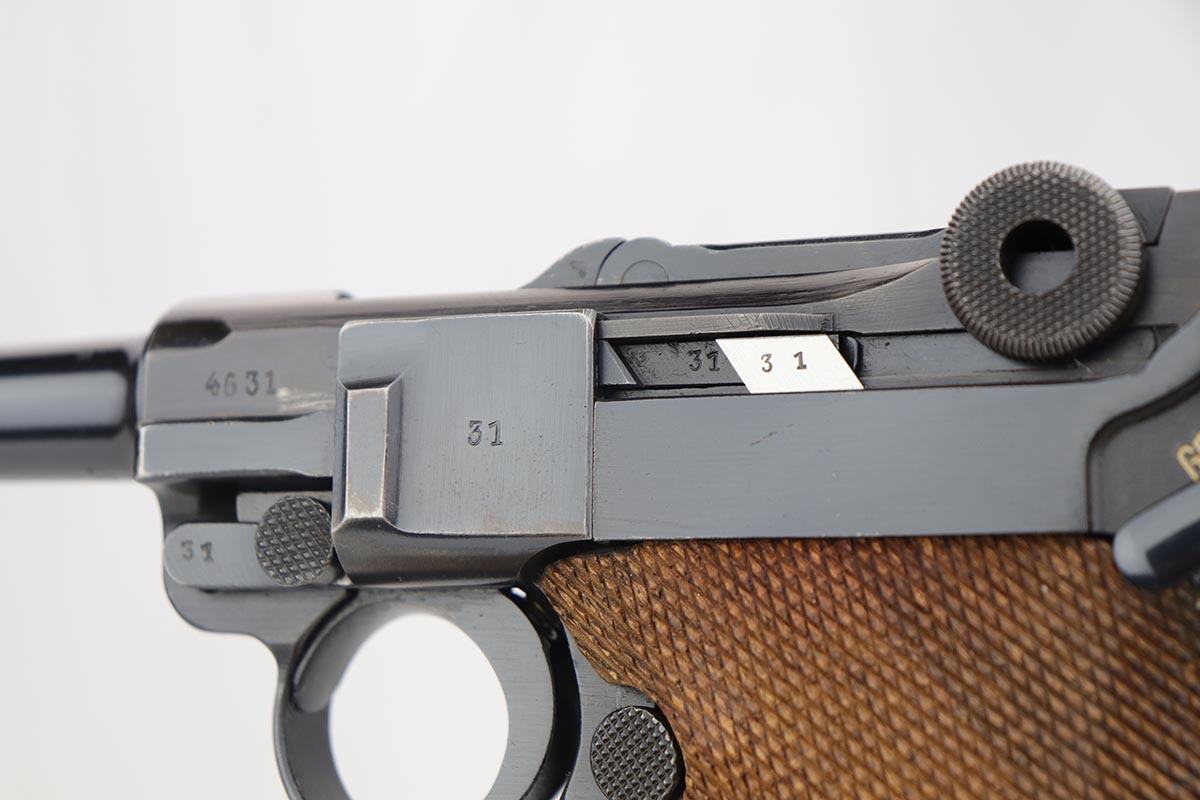 9/18/19 – This is an absolute beauty of a Mauser Luger from 1940, with all matching numbers, including the grips. The blue rates at 98-99% with a hint of edge wear and a spot of finish loss on the grip strap. The grips are numbered to the pistol and sharply checkered, with just a minor chip in the bottom of the left panel. Mirror bore. The magazine is also numbered to the pistol but we do not believe the numbering is factory original.