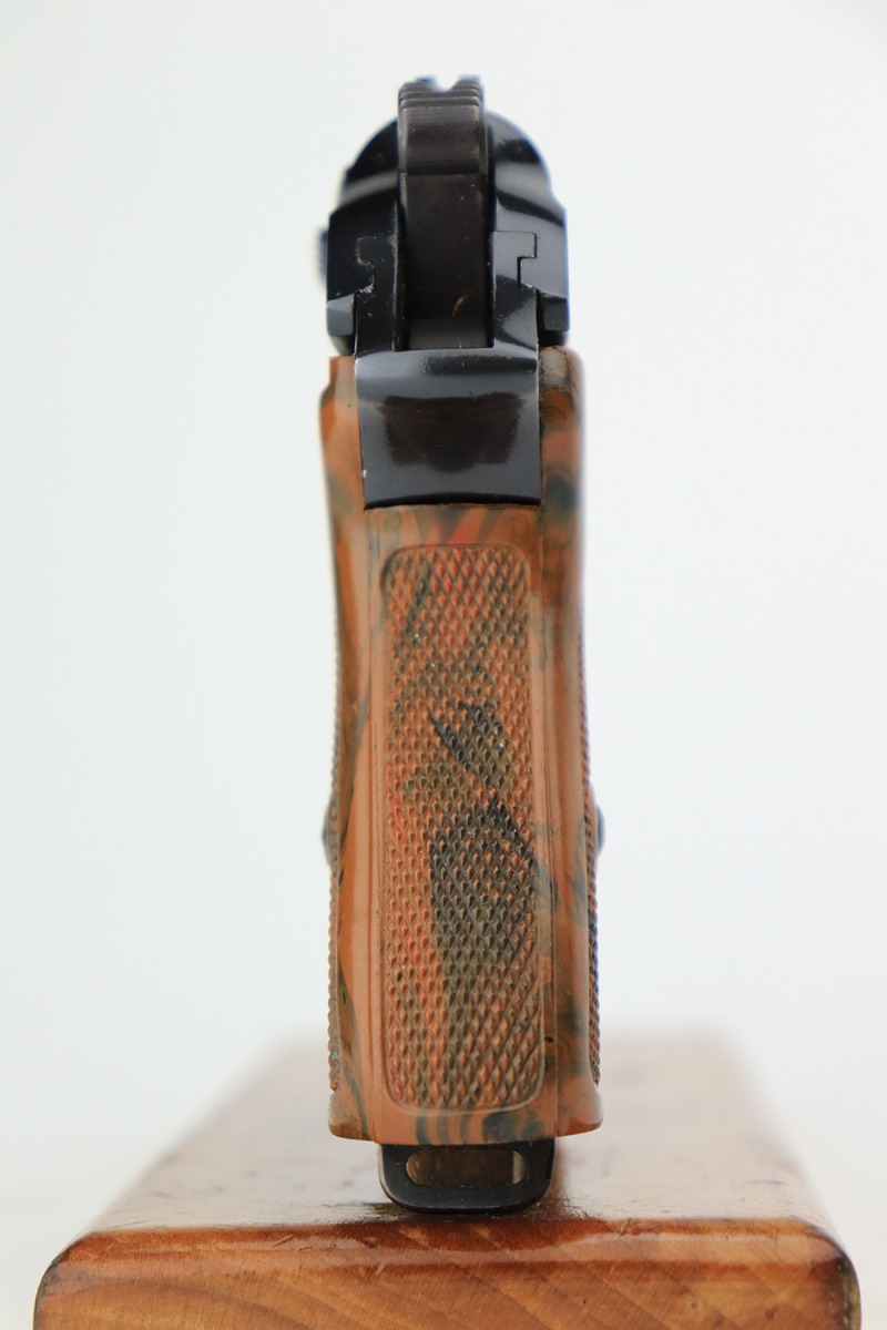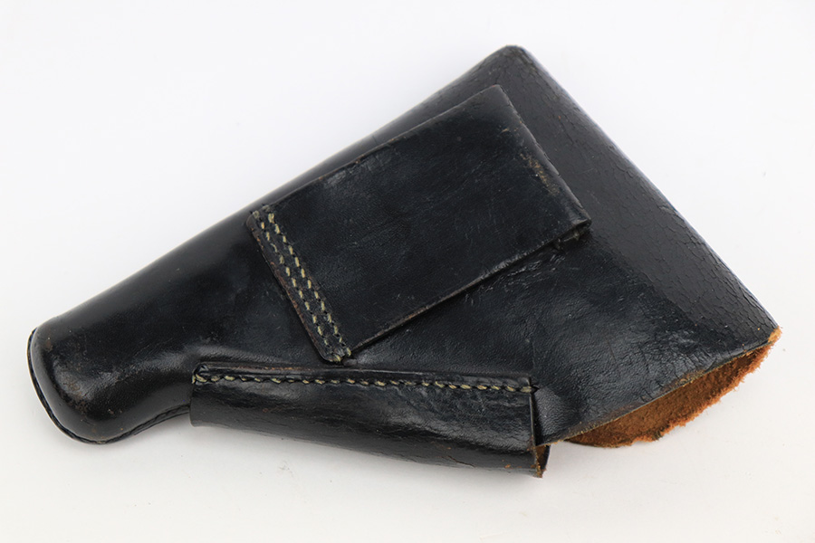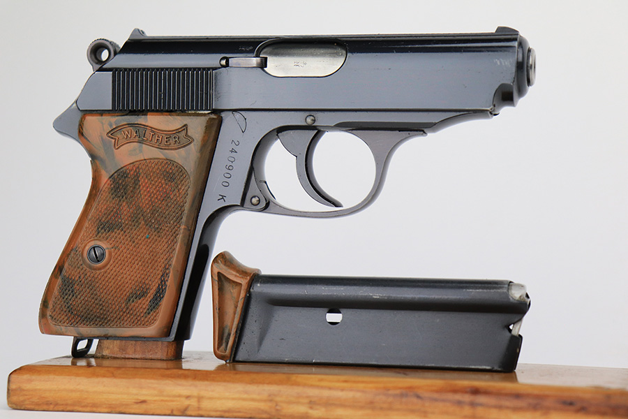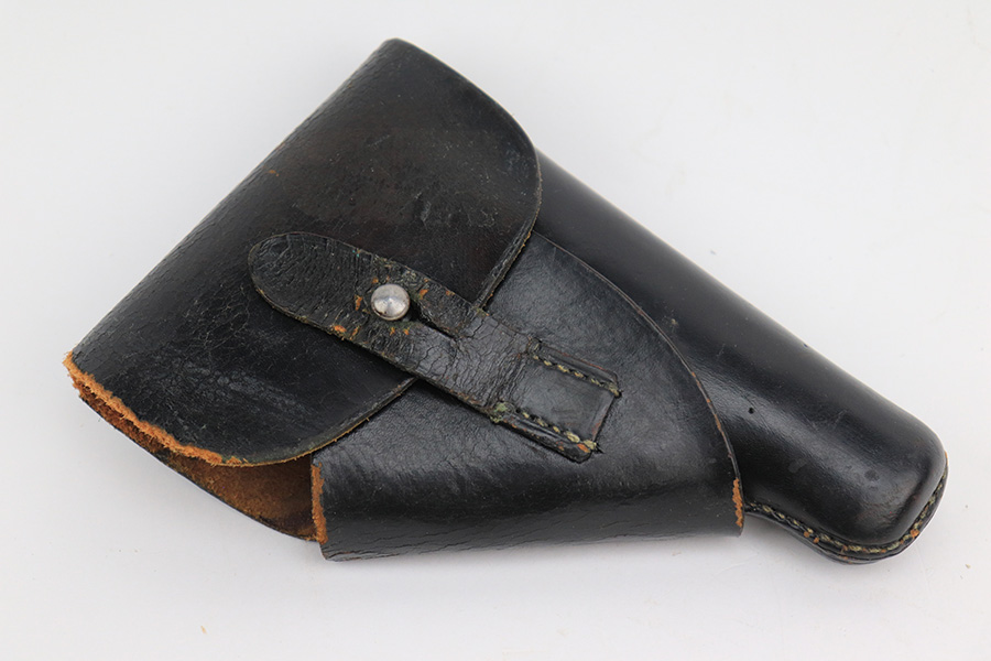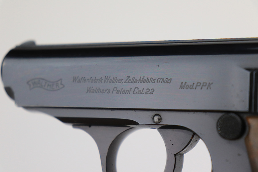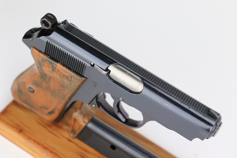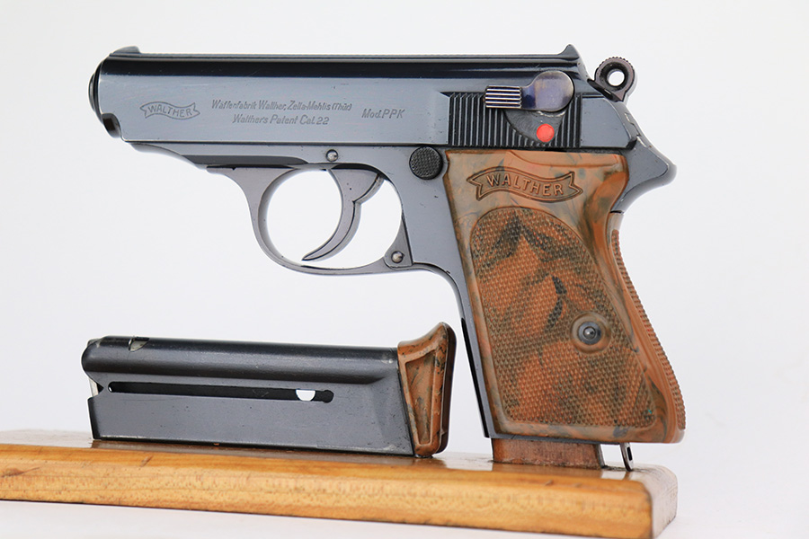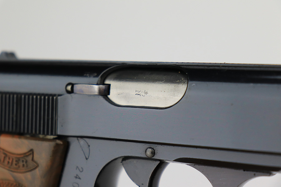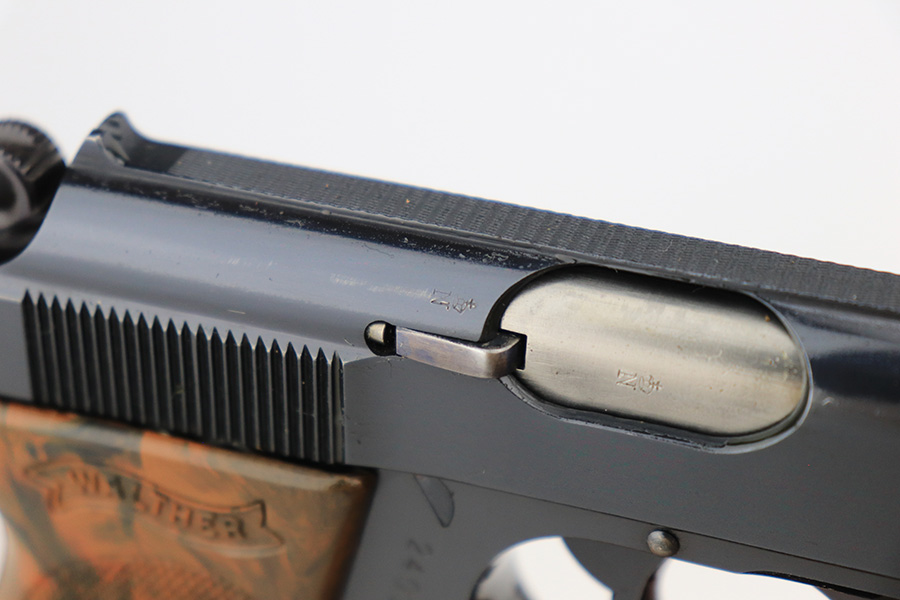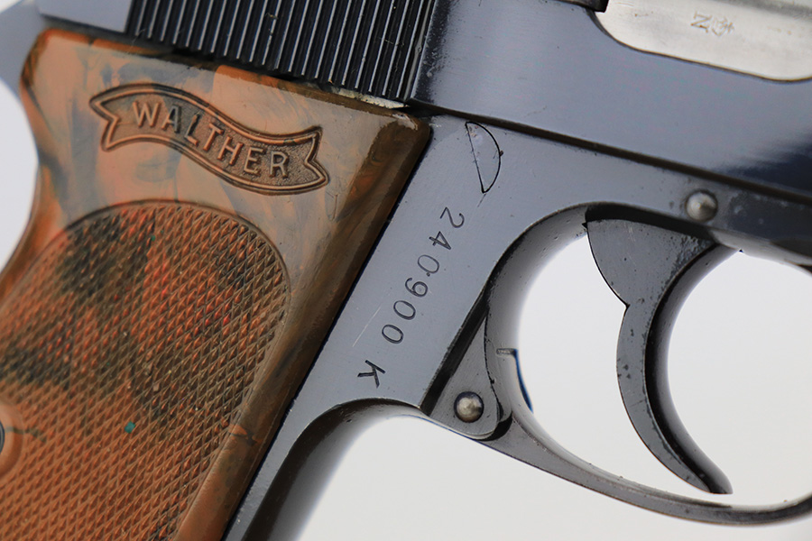 5/18/23 – This is a gorgeous example of a rare .22 Caliber Walther PPK sold in the commercial market in 1939. All matching with the proper “Crown N” commercial proofs. It comes as a rig with one period-correct finger extension magazine and a black leather Akah holster. The holster is interesting, because it has no magazine pouch, and there is no evidence it ever had one. The gun itself is beautiful, retained nearly all of its original high polish finish – just a hint of muzzle wear. Excellent brown Walther grip – no warping, cracks, or chips. Mint bore.