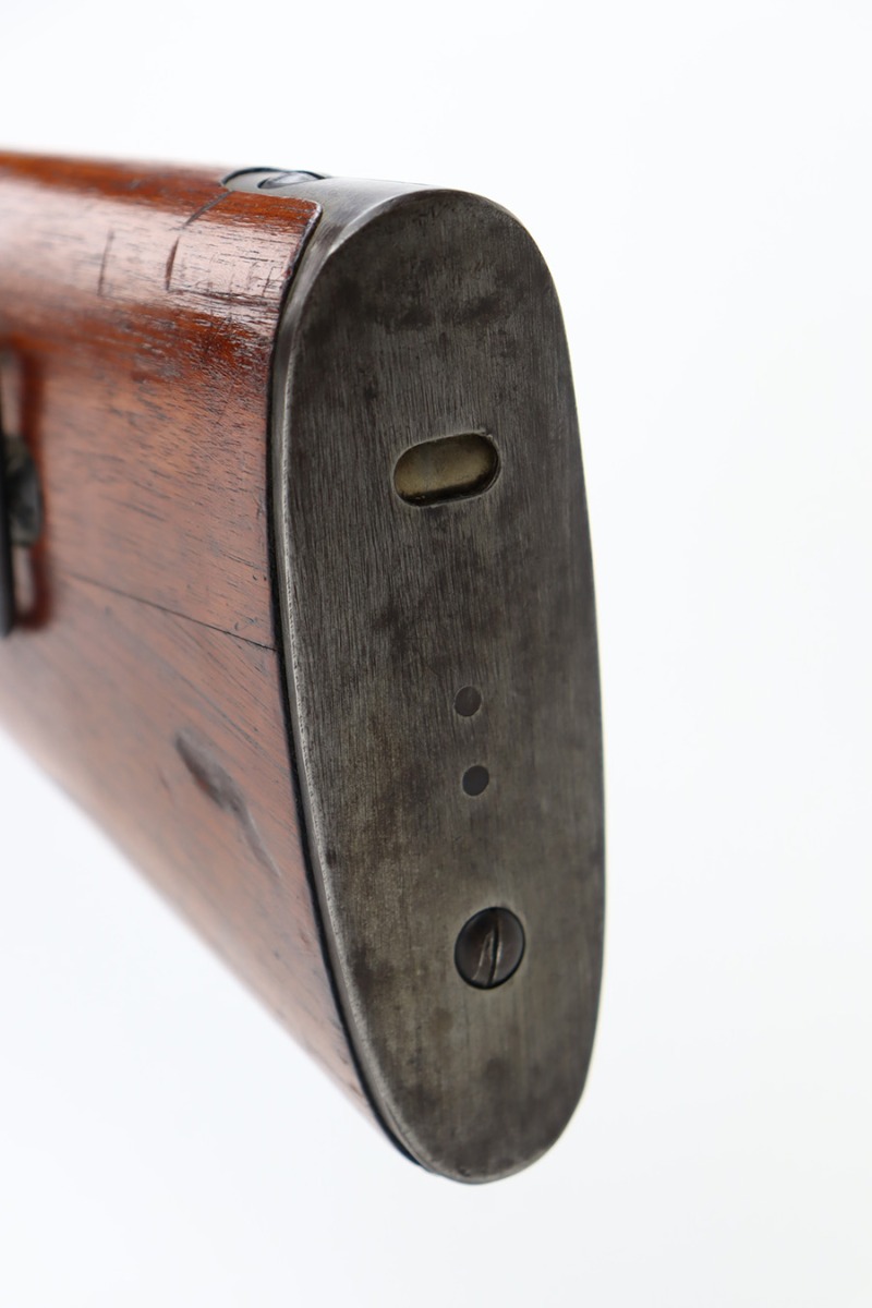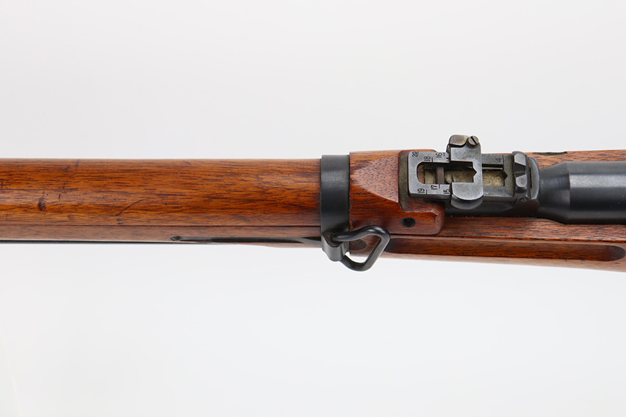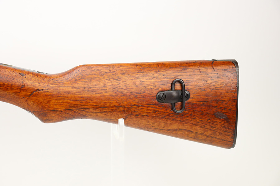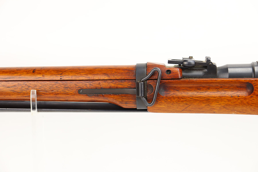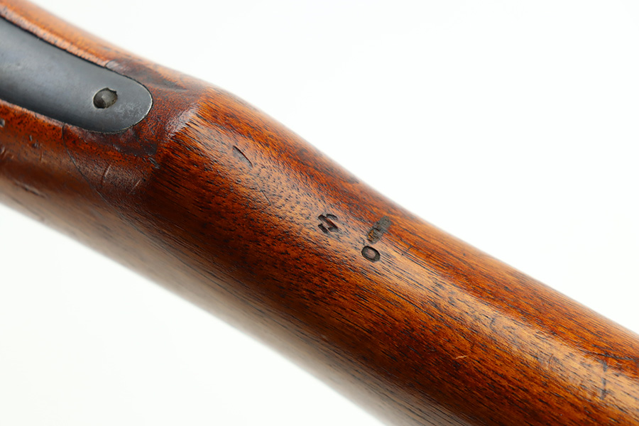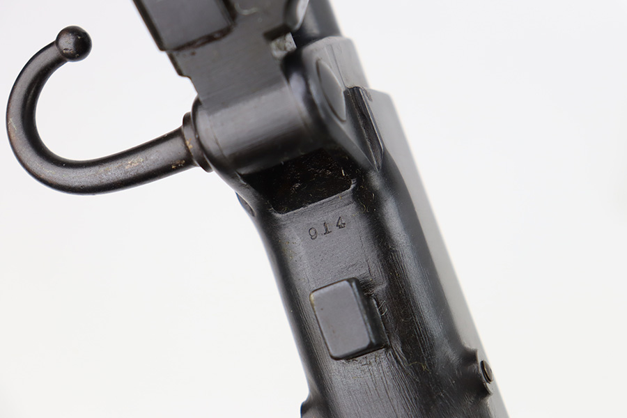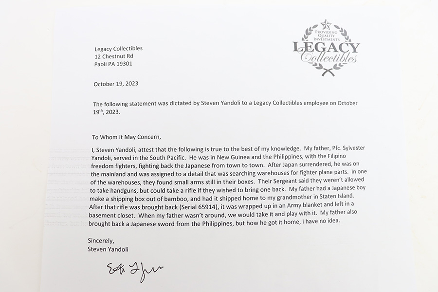 11/30/23 – This is an awesome vet bringback set that comes to us directly from the son of the veteran who captured these pieces. This Arisaka Type 44 Cavalry Carbine and Japanese Officer’s sword were obtained by Pfc. Sylvester Yandoli when he was serving in the South Pacific. His son had us transcribe what he knew of the background for each piece, and an image of that signed letter is shown in the photos of this listing. The rifle is one of the finest Type 44 Carbines we have ever encountered, with full mum intact and virtually zero bluing loss to mention. Minty bore and excellent wood stock with only minor handling wear. All numbers on the rifle match except for the extractor on the bolt. Pfc. Yandoli separately captured a Japanese Officer’s sword with original WW2 fittings. The sword is generally in very good condition with scabbard present, and the blade shows minor handling wear and a few small patches of corrosion.