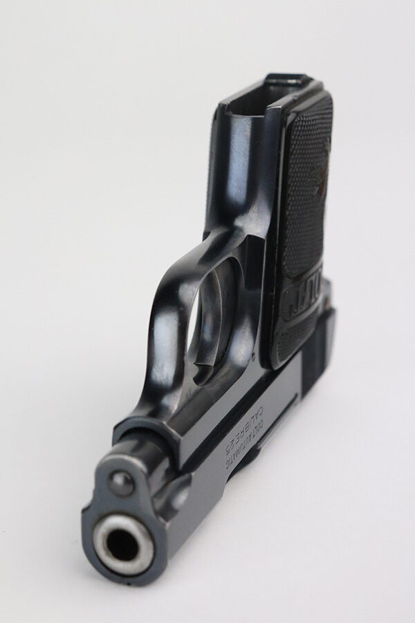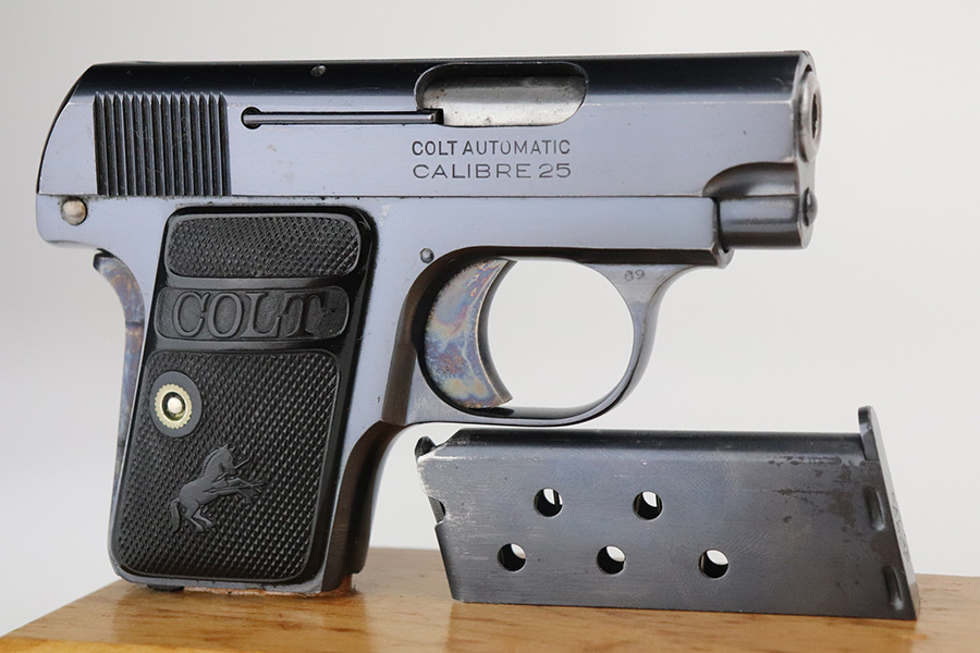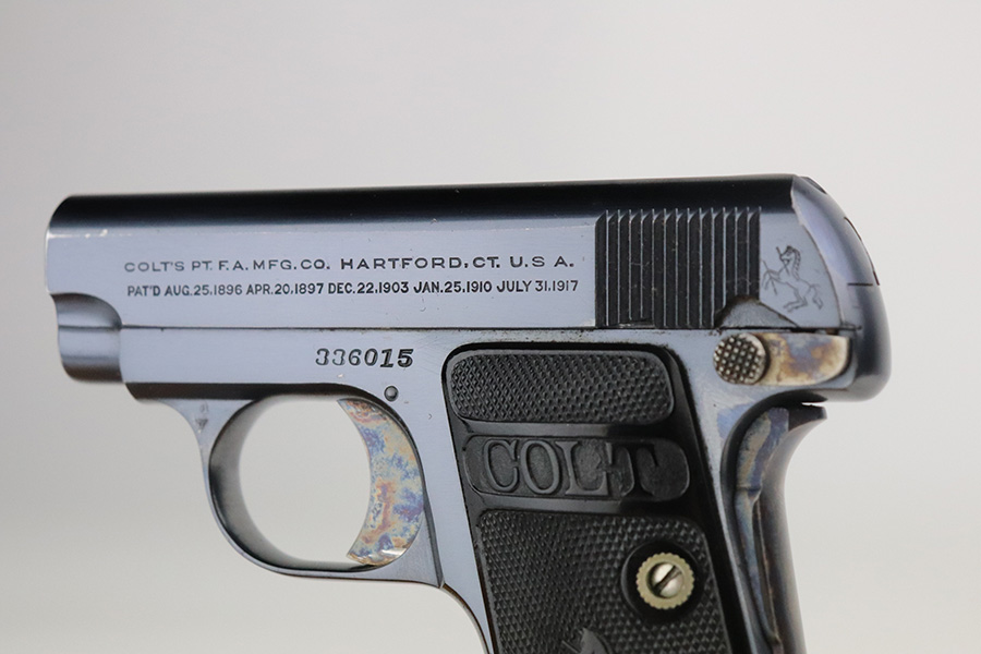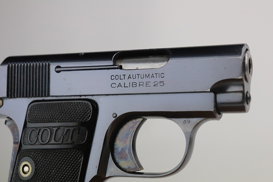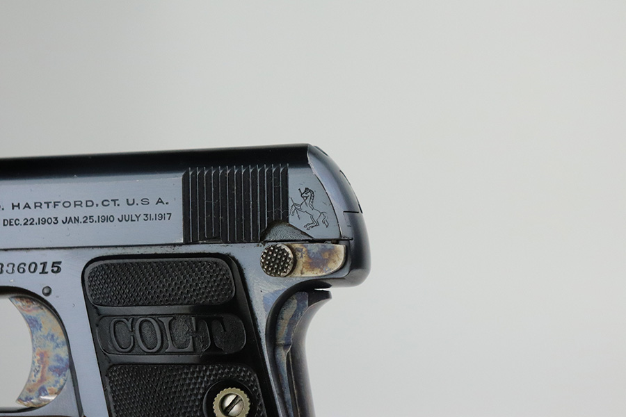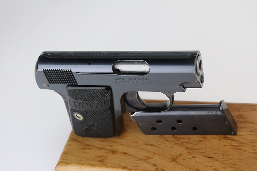 7/27/21 – This is a gorgeous, mint example of a Colt Model 1908 Vest Pocket pistol manufactured in 1924. The gun is all correct and comes with an original boxed that is hand-numbered to the gun and an original manual. The gun has retained about 99% of its original finish. The case-hardening on the small parts is beautiful. There are just some very small handling marks here and there, concentrated near the muzzle. Comes with excellent black bakelite grips and a proper magazine. Mint bore.