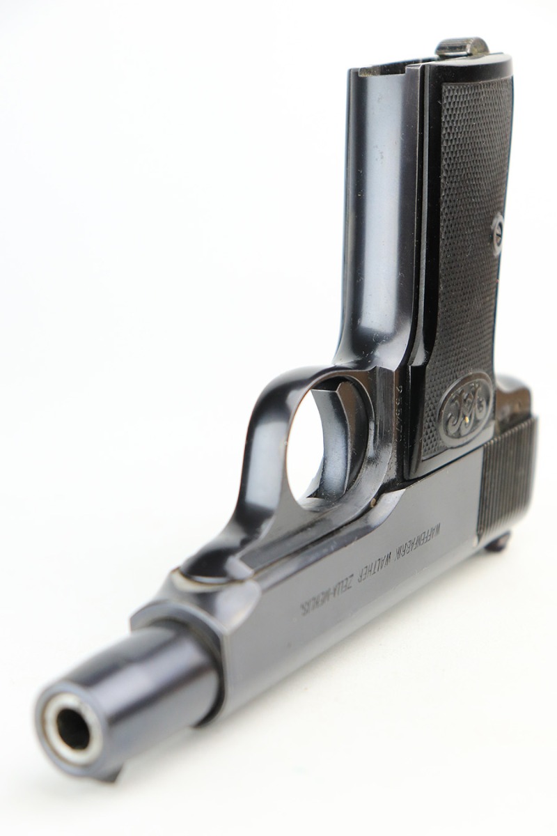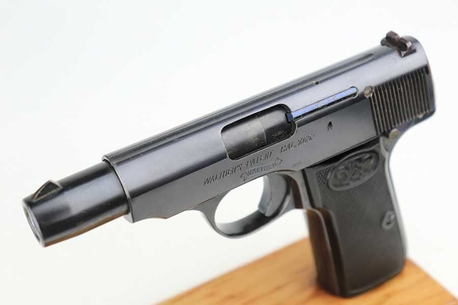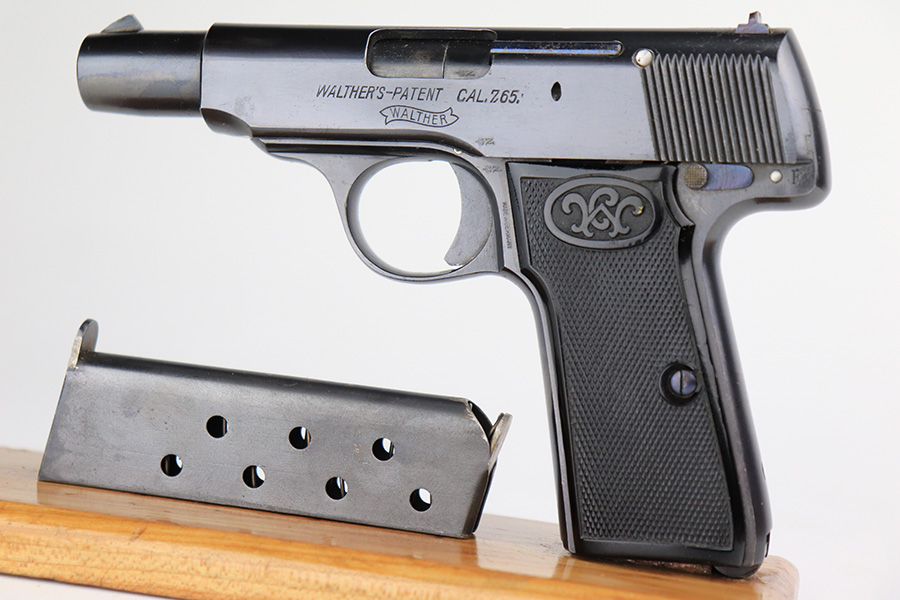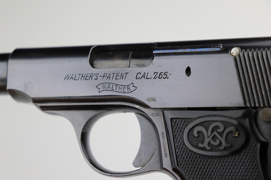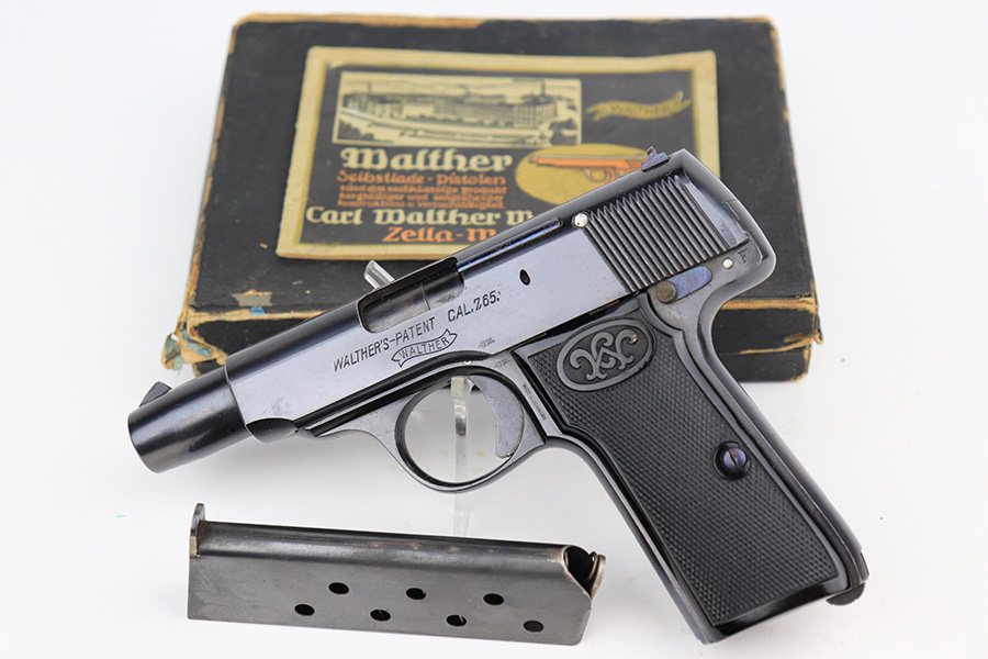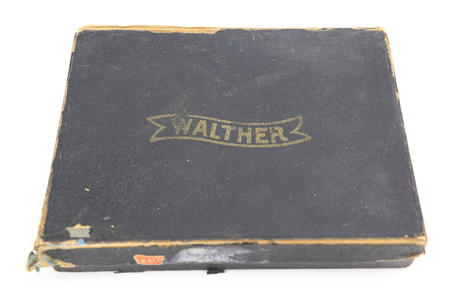6/1/22 – This is a gorgeous example of a Walther Model 4 sold in the commercial market in the 1920’s. It is all matching and has the proper “Crown N” commercial proofs. “Made in Germany” export marking on the left side of the frame. It comes with an original period-correct cardboard box, owners manual, and cleaning brush. The label is mostly torn away, so there is no legible serial number. The edges of the box are mostly worn and torn. The gun has retained nearly all of its original bluing with just hints of wear on some of the high edges and one tiny spot of wear on the left side of the slide. Comes with excellent period-correct black plastic grips and one proper magazine. Mint bore.