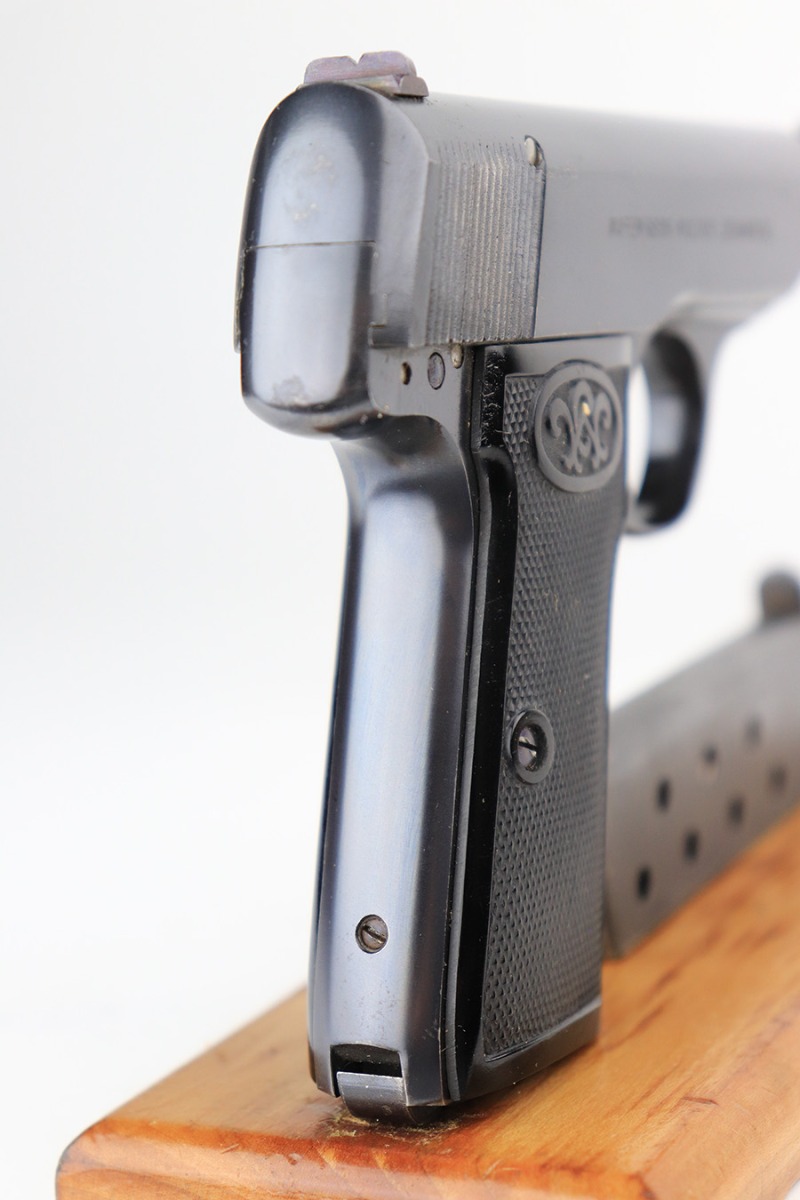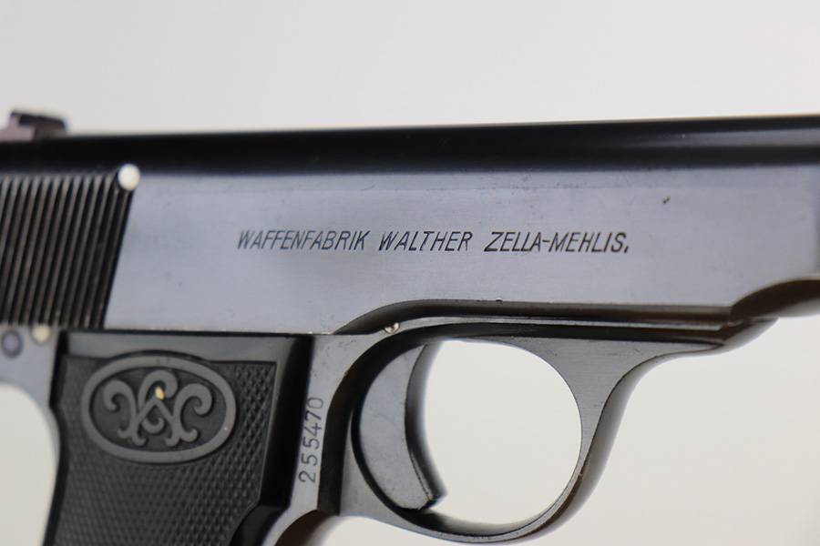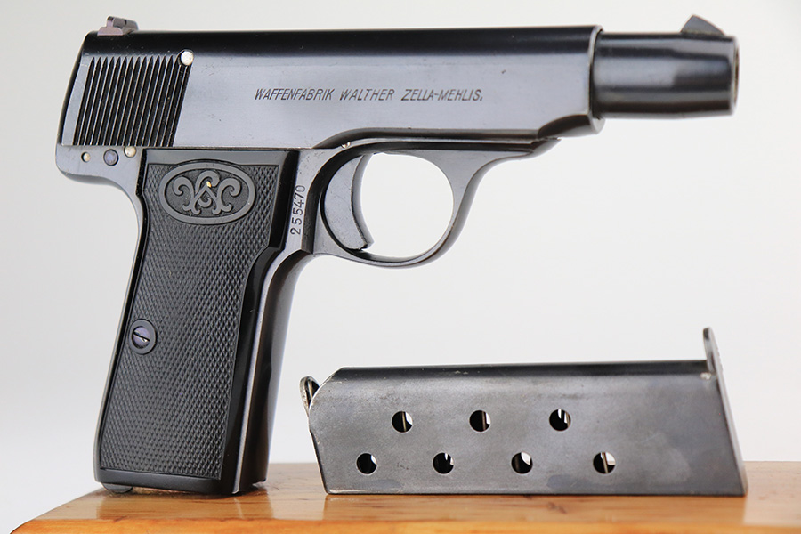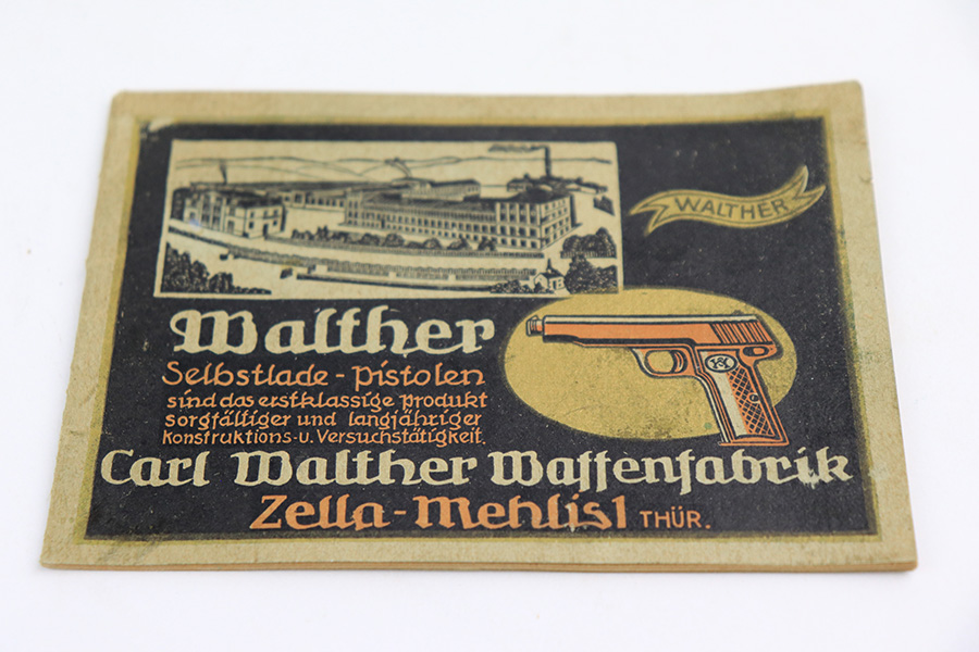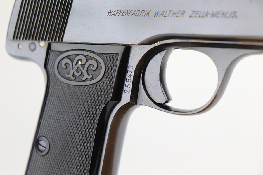 6/1/22 – This is a gorgeous example of a Walther Model 4 sold in the commercial market in the 1920’s. It is all matching and has the proper “Crown N” commercial proofs. “Made in Germany” export marking on the left side of the frame. It comes with an original period-correct cardboard box, owners manual, and cleaning brush. The label is mostly torn away, so there is no legible serial number. The edges of the box are mostly worn and torn. The gun has retained nearly all of its original bluing with just hints of wear on some of the high edges and one tiny spot of wear on the left side of the slide. Comes with excellent period-correct black plastic grips and one proper magazine. Mint bore.