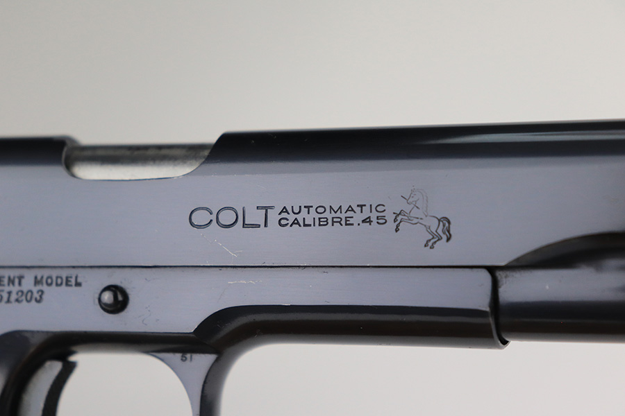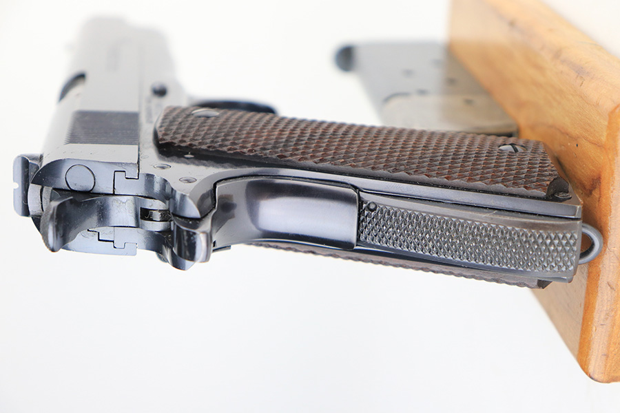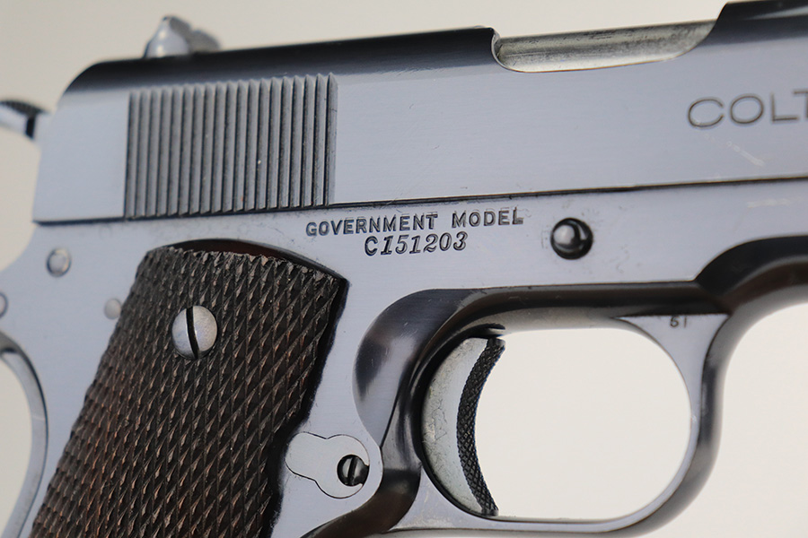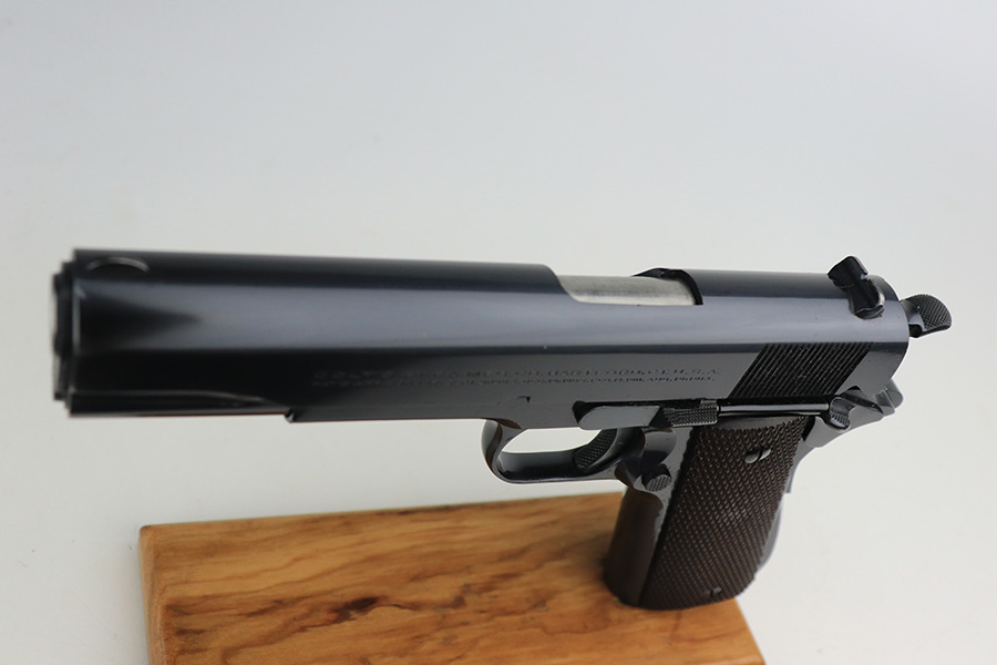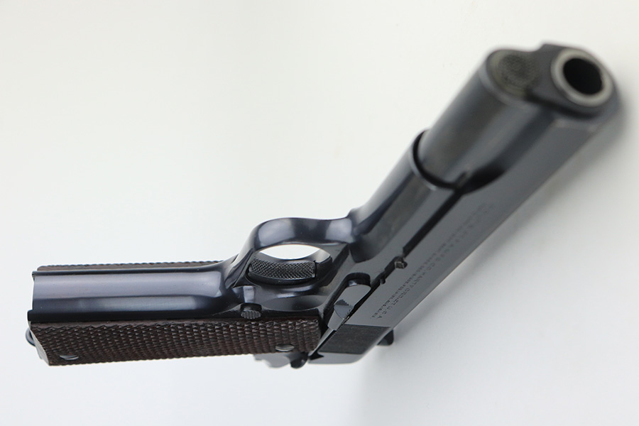 12/10/21 – This is a fantastic example of an original commercial Colt Government Model 1911A1 from 1926. It has 98-99% of the original Colt high-polish blue, with just a tiny bit of muzzle wear and a couple of very minor surface scratches on the right side of the pistol. Gorgeous grips with hardly any handling wear and a mint bore. Proper commercial two-tone magazine that’s marked ‘COLT .45 AUTO’ on the base.