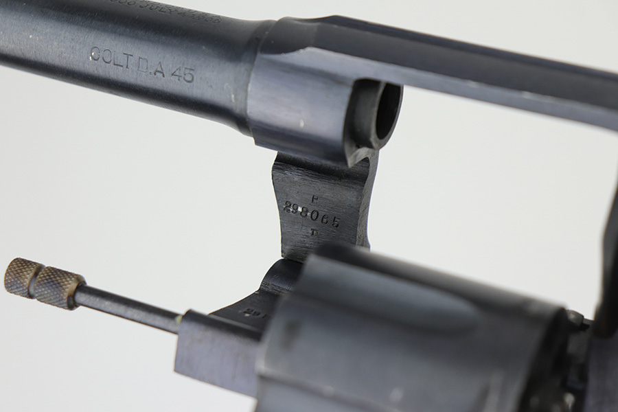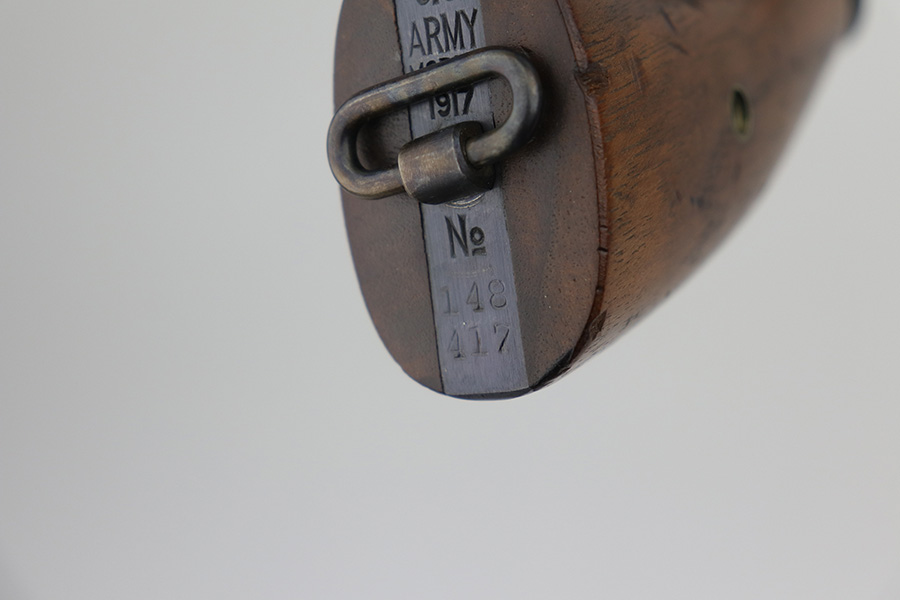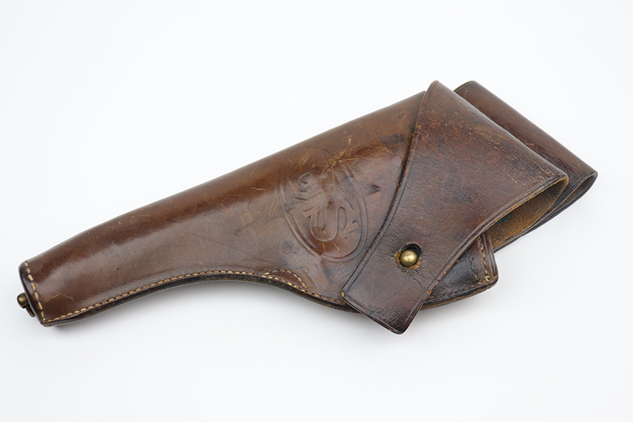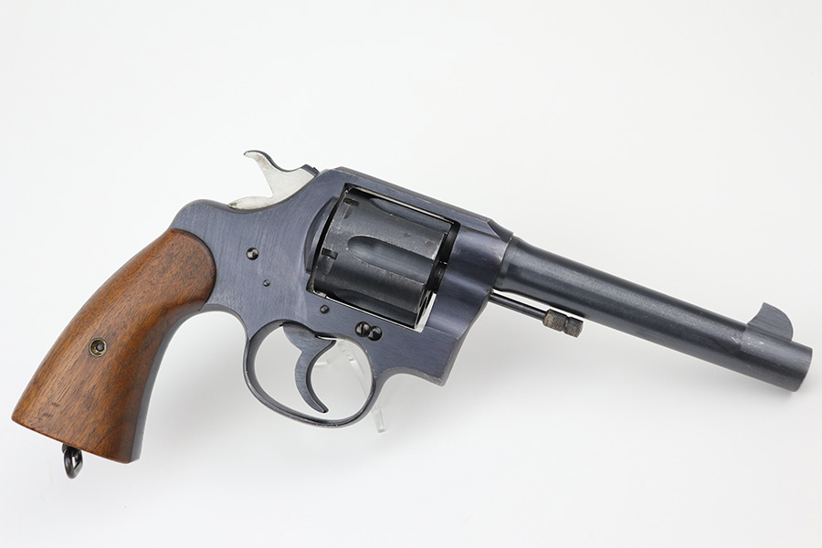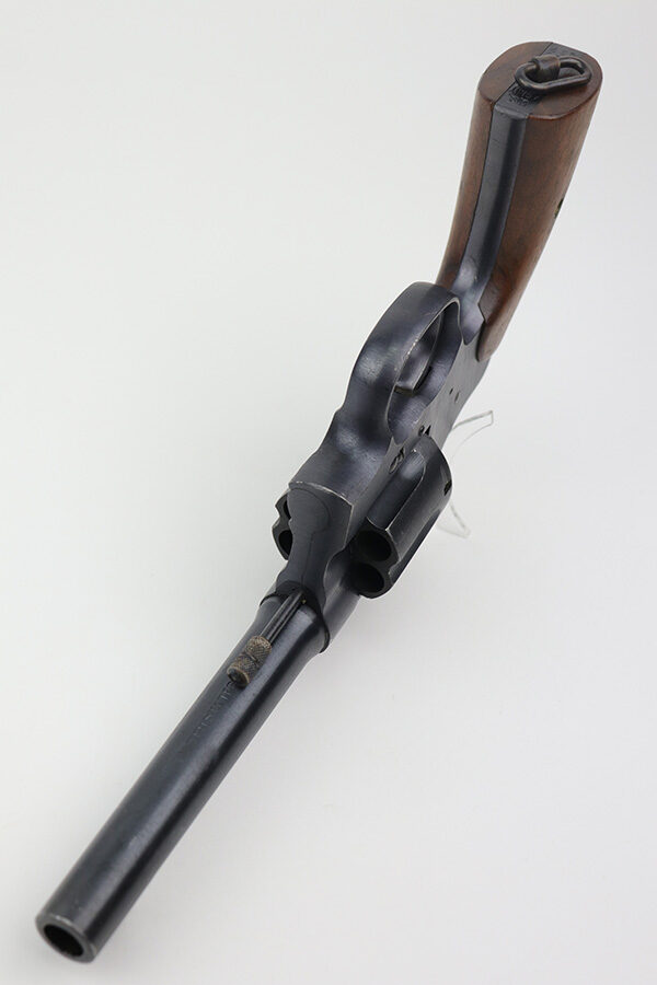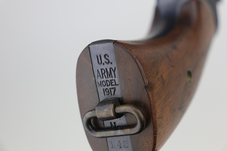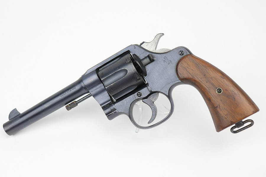 11/24/21 – This is a truly gorgeous example of a Colt Model 1917 revolver issued to the US military during WW1, in 1918. The gun is all matching, is “United States Property” marked, and has the proper “Eagle Head S15” military proof. The rig comes with an excellent 1917-dated leather holster. The gun is stunning, retaining more than 98% of its bluing. There are just hints of wear on the high edges and a very light roll mark on the cylinder. The cylinder is tight and the action is smooth. Lanyard loop on the frame is intact. Comes with excellent wood grips – just a few small bruises. The bore is like factory-new.