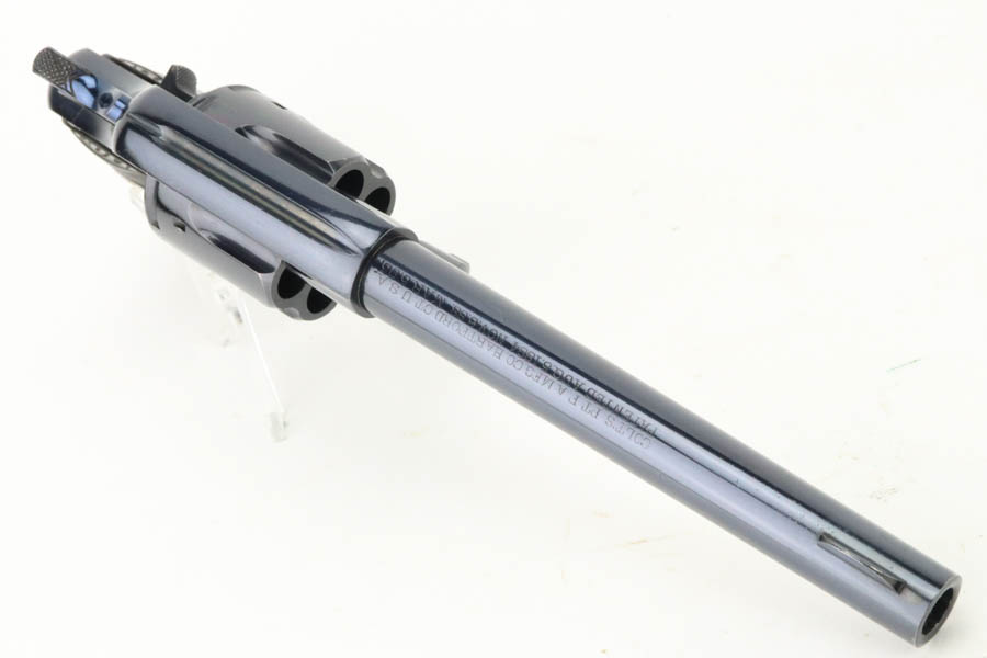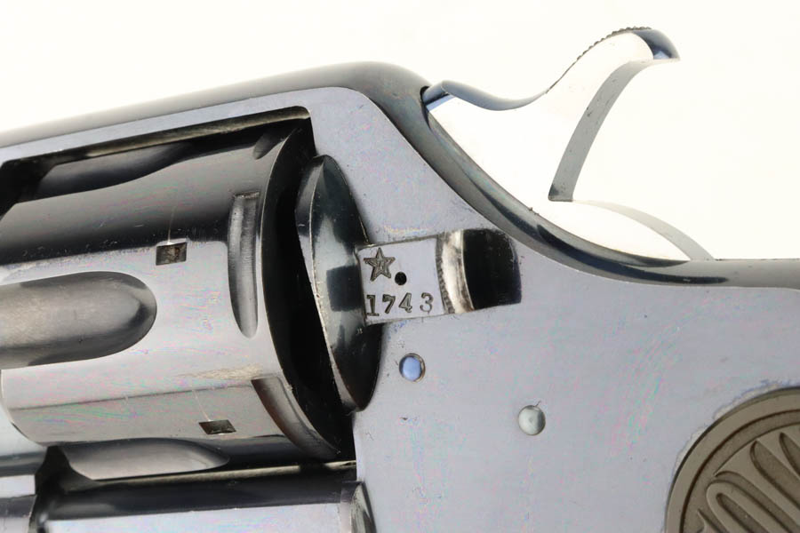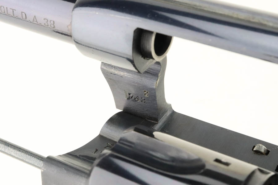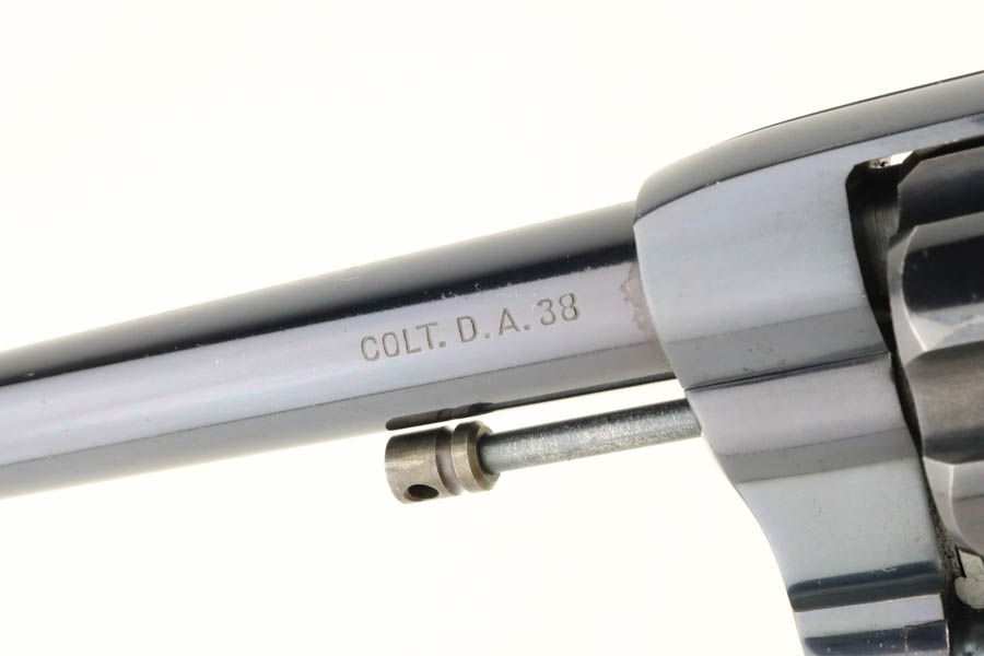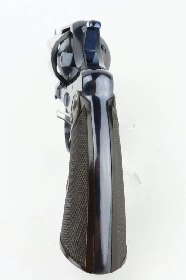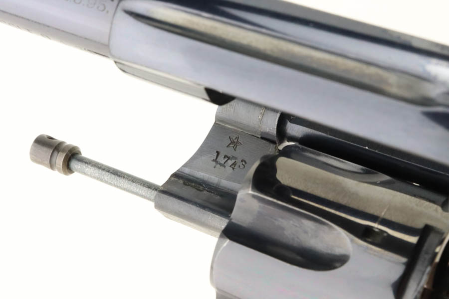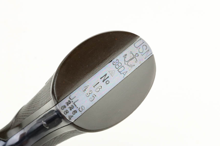 6/14/24 – This is an absolutely gorgeous example of a Colt Model 1895 double action revolver issued to the US Navy in 1904. The butt is marked U.S.N. over the Navy Anchor. Beneath this is the caliber designation “.38 D.A.”. It is all matching and has retained nearly all of its beautiful high polish Colt bluing. Really nice and bright fire bluing on the small parts. Fitted with hard rubber grips. Factory-new bore.