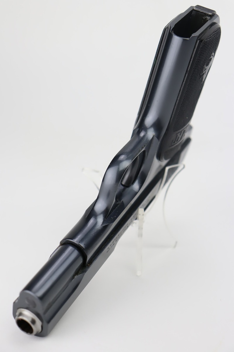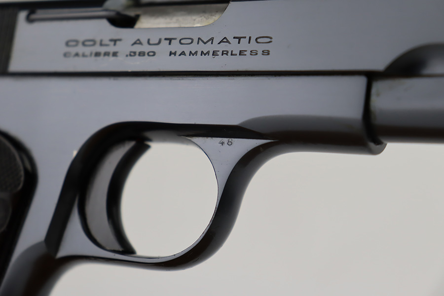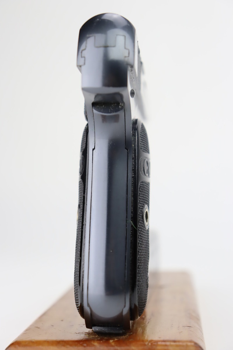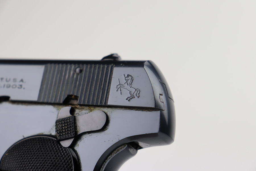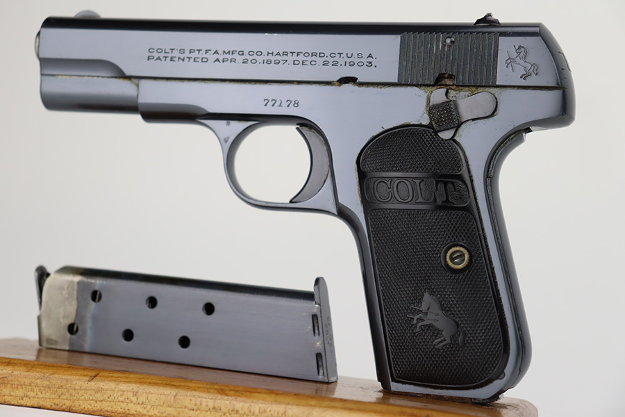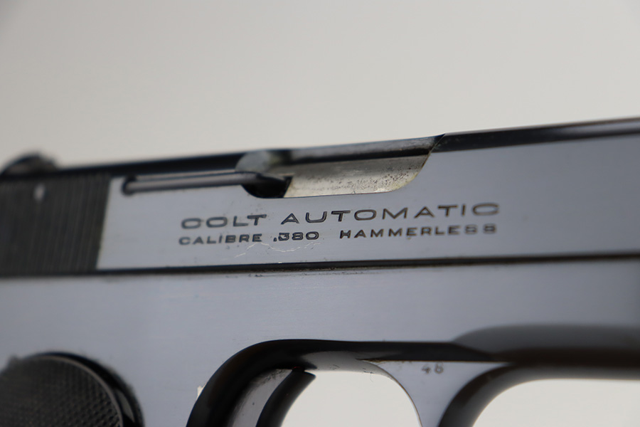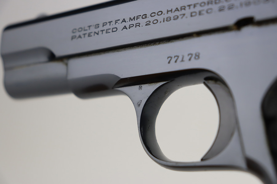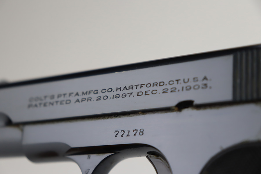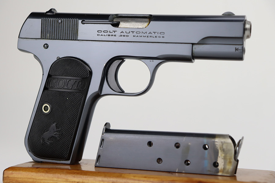 9/21/23 – This is a gorgeous example of a Colt Model 1908 Pocket Hammerless, manufactured in 1925 and chambered in .380 ACP. It is all matching and has retained virtually all of its original high polish Colt bluing. There are just a few tiny handling marks here and there. Fitted with excellent black hard rubber grips and comes with one proper magazine. The bore has good rifling, but there is minor pin-pricking in the grooves.
