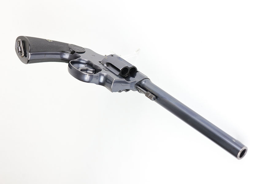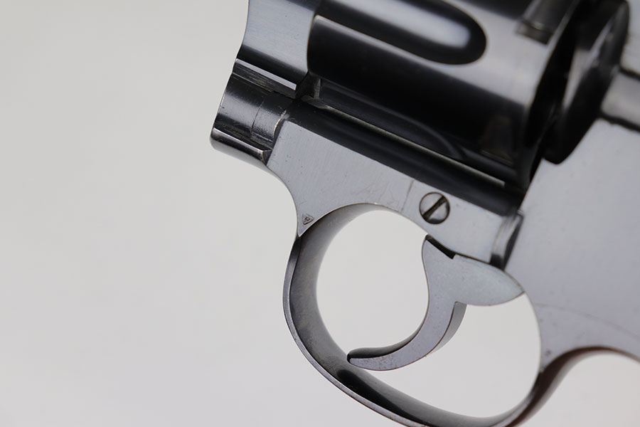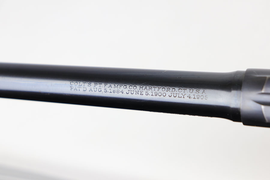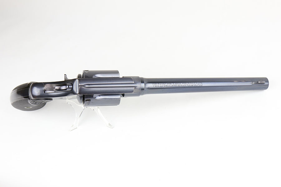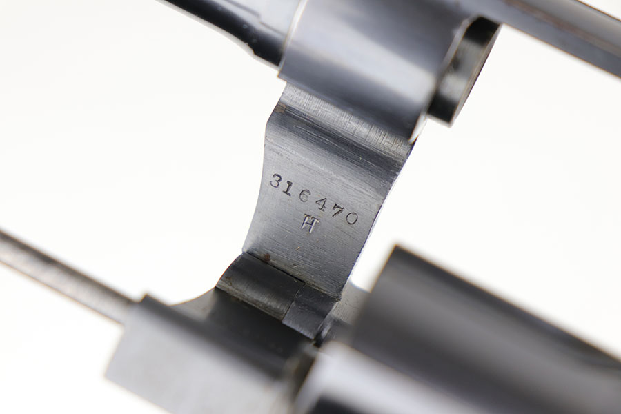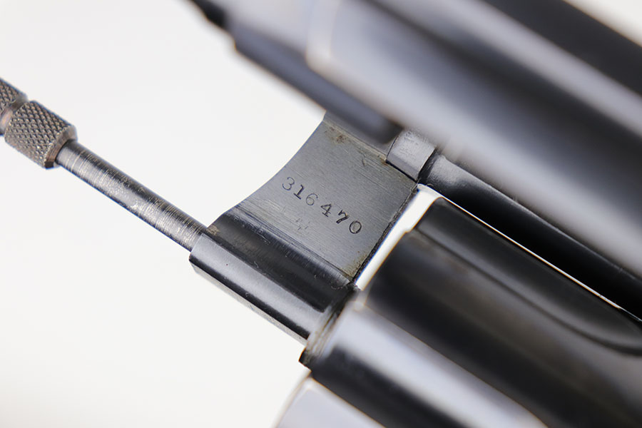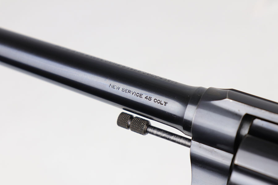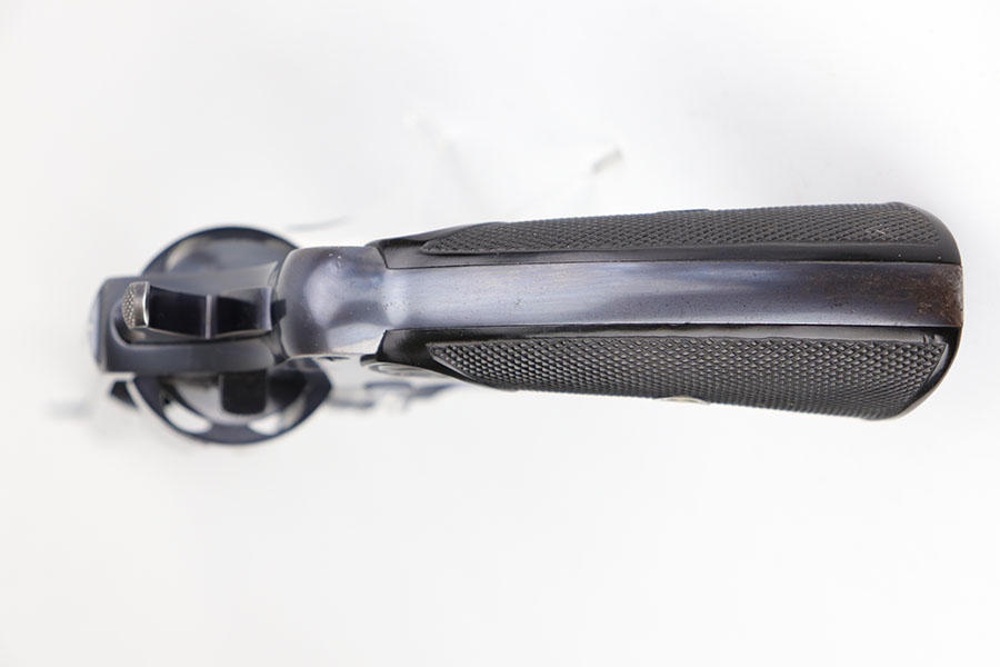6/23/20 – This is a gorgeous example of a commercial Colt New Service revolver that was made in 1922. It’s got a 7.5 inch barrel with mint bore and mechanics. The beautiful Colt polished blue rates at about 97% with standard muzzle wear and roll mark on cylinder, and a little bit of finish loss on the bottom of the grip frame. Correctly has the early hard rubber grips and they are in mint condition. Terrific example overall.