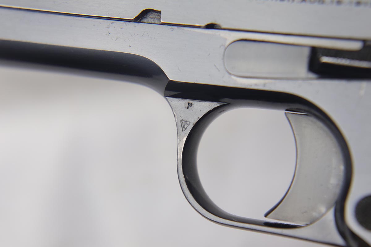 2/5/24 – This is a gorgeous early Colt M1911 Commercial model, with about 96% original polished blue finish remaining. Made in 1920, this pistol shows only minor thinning on the high edges and bottom of the back strap. Fantastic grips and excellent unmarked two-tone magazine. Bore shows minor use but is shiny with good rifling.