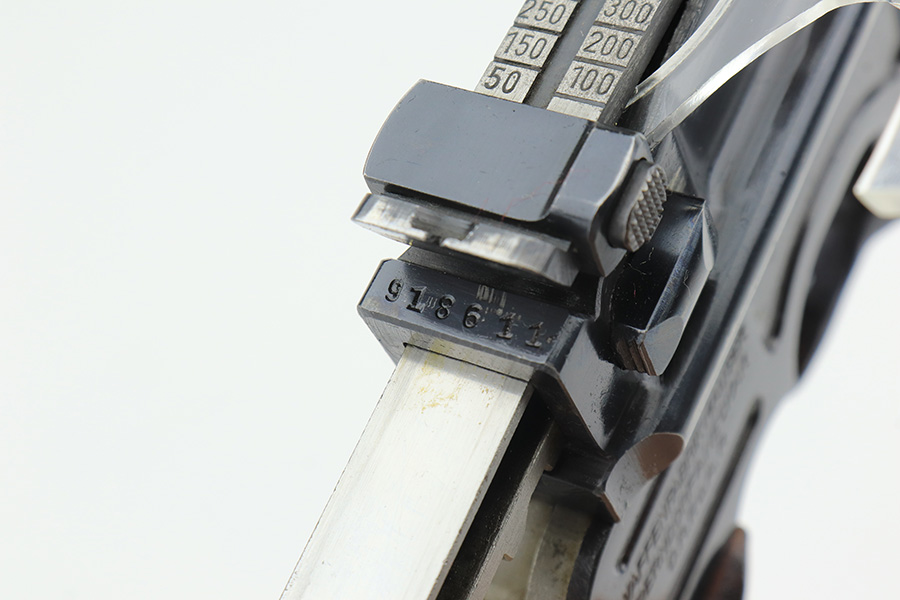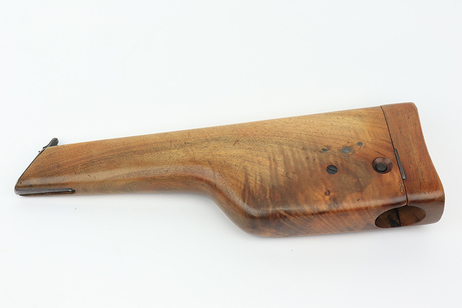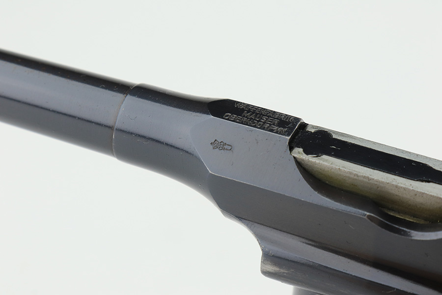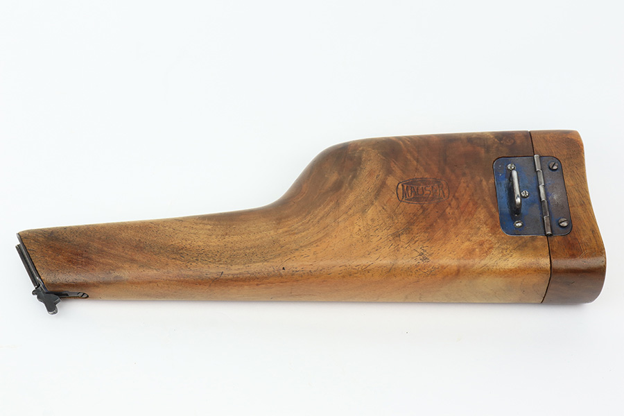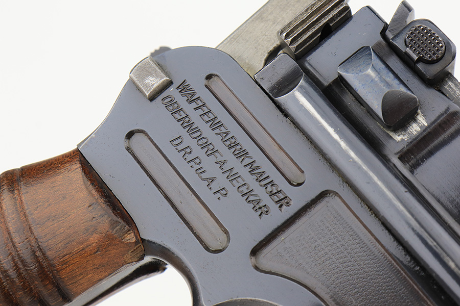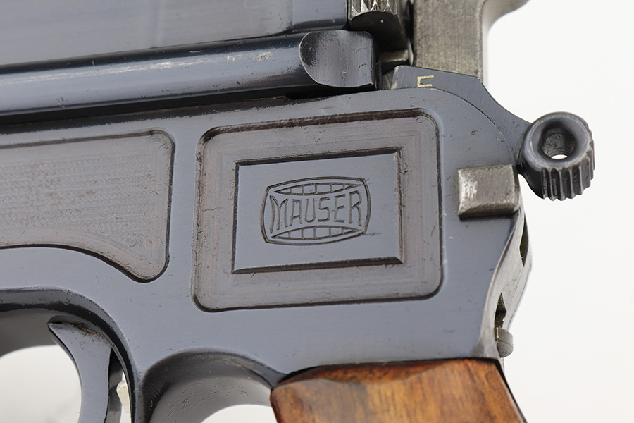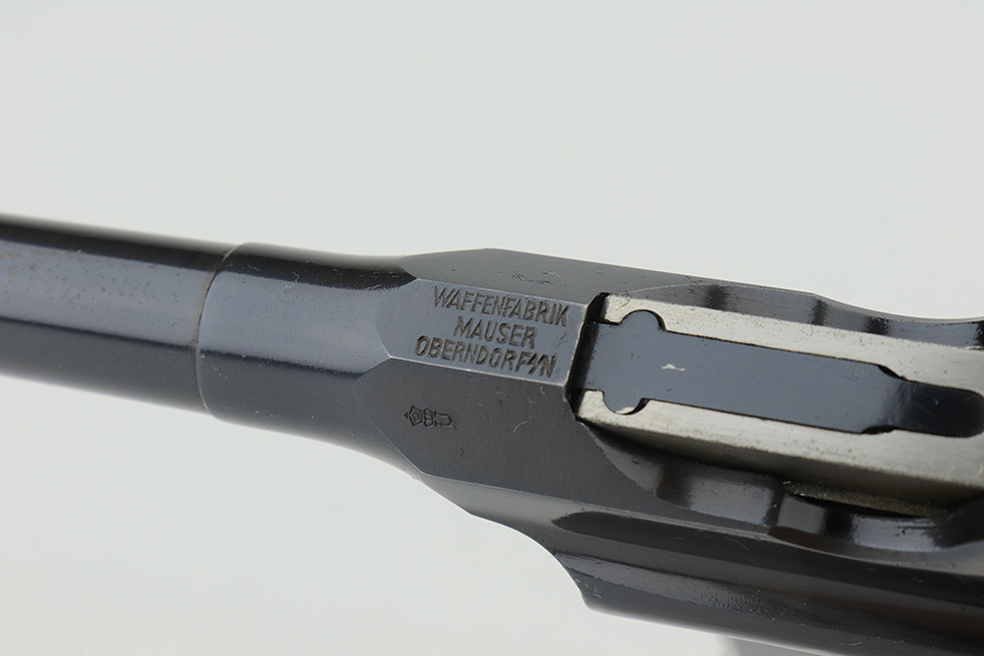 2/7/23 – This is a fantastic, original example of a commercial Mauser C96 Broomhandle from the late 1930’s. All matching numbers with 95+% of the high-polish commercial blue remaining. The wear on the pistol is in the common high-point areas from rubbing against the inside of the stock – rails, muzzle and edges of mag well. Mint bore. Excellent, unmarked grips. Comes with a scarce and original commercial Mauser stock with sharp Mauser maker-mark. No cracks or chips.