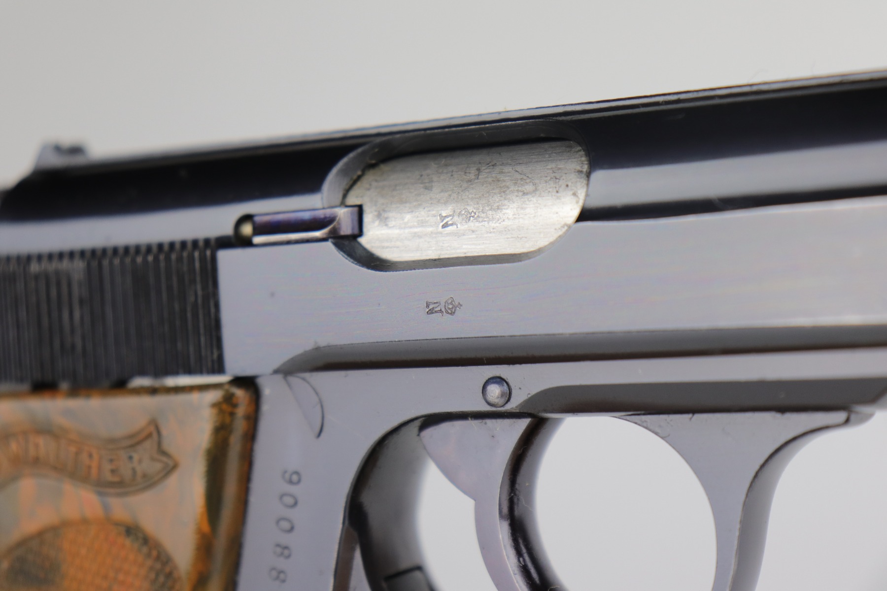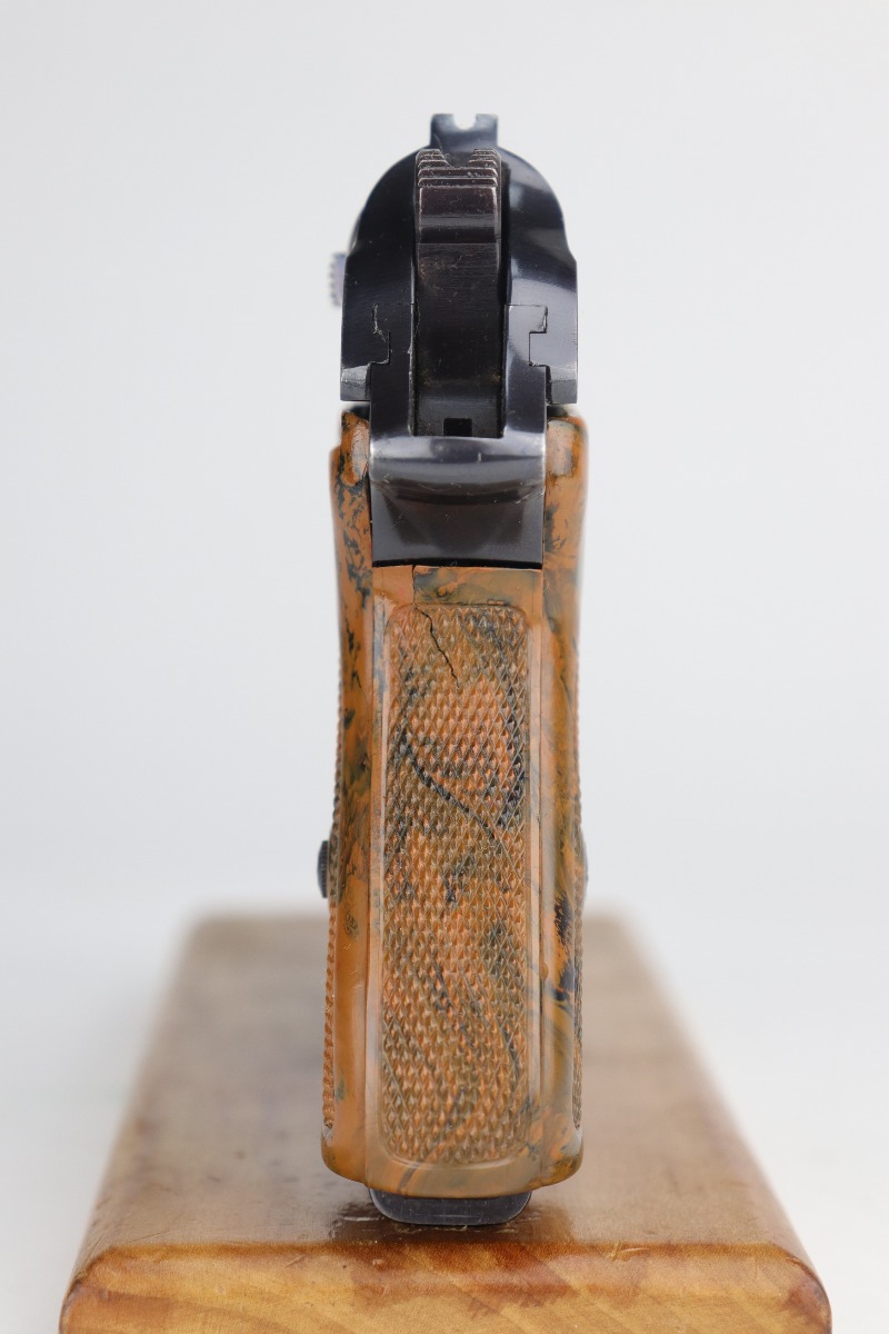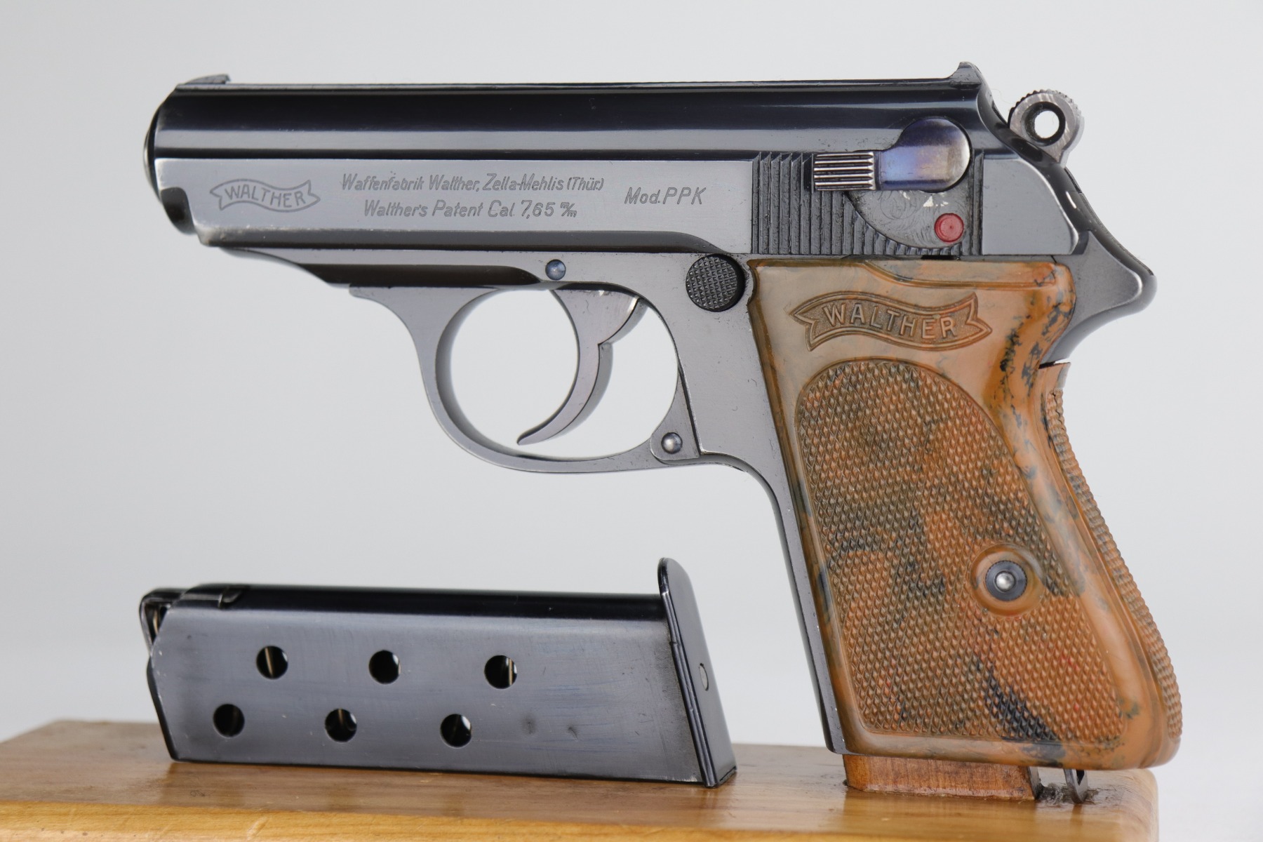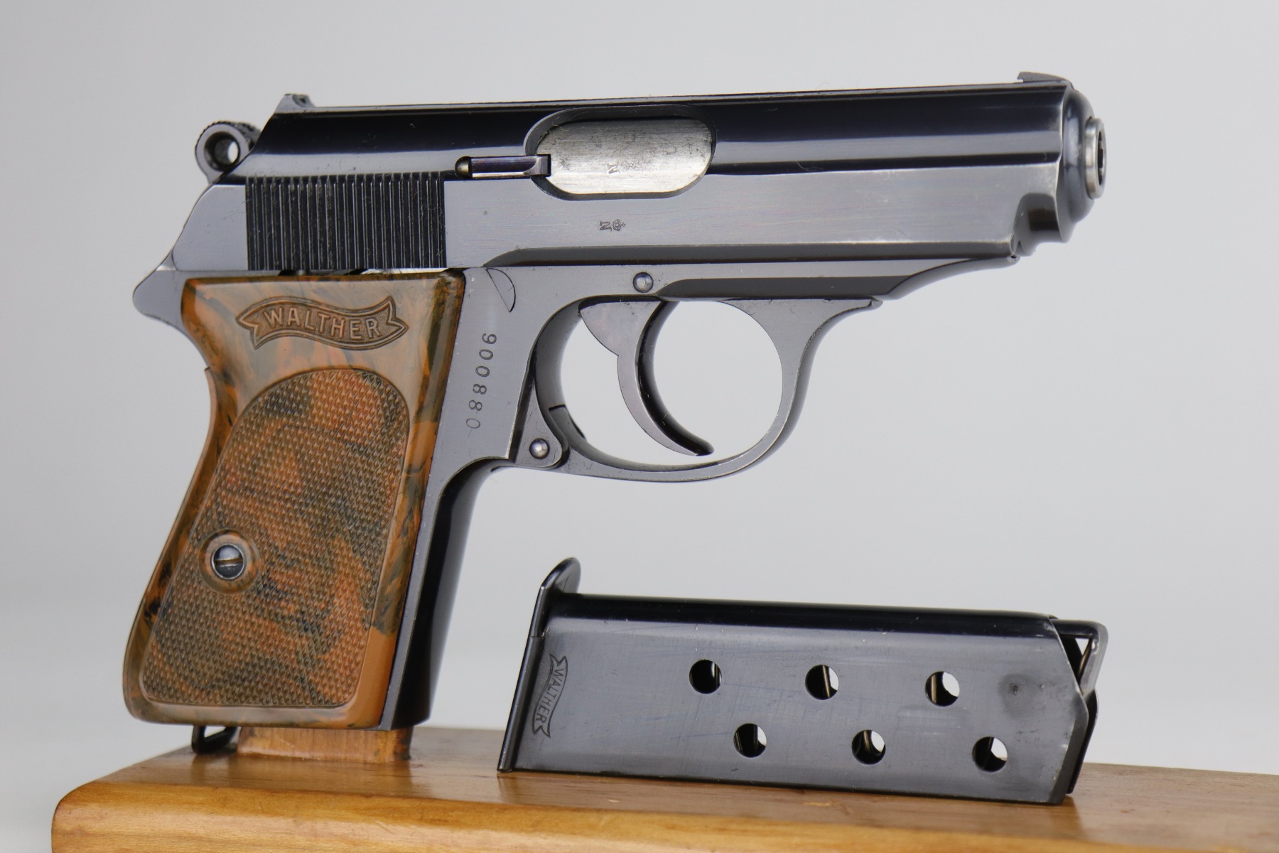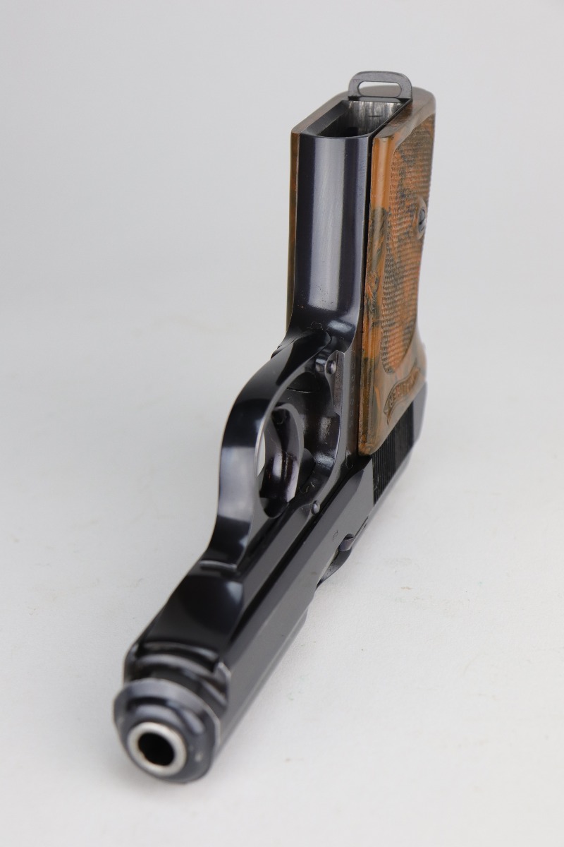 11/6/20 – This is a gorgeous example of a Walther PPK sold in the German commercial market in 1935. The gun is all matching and has the proper “Crown N” proofs. The gun is minty, retaining about 98% of its original bluing. There is only minor wear around the muzzle. It comes with an excellent brown grip – just a very small crack on the spine. It also comes with one period-correct magazine. The bore is near-mint, shiny with strong rifling.