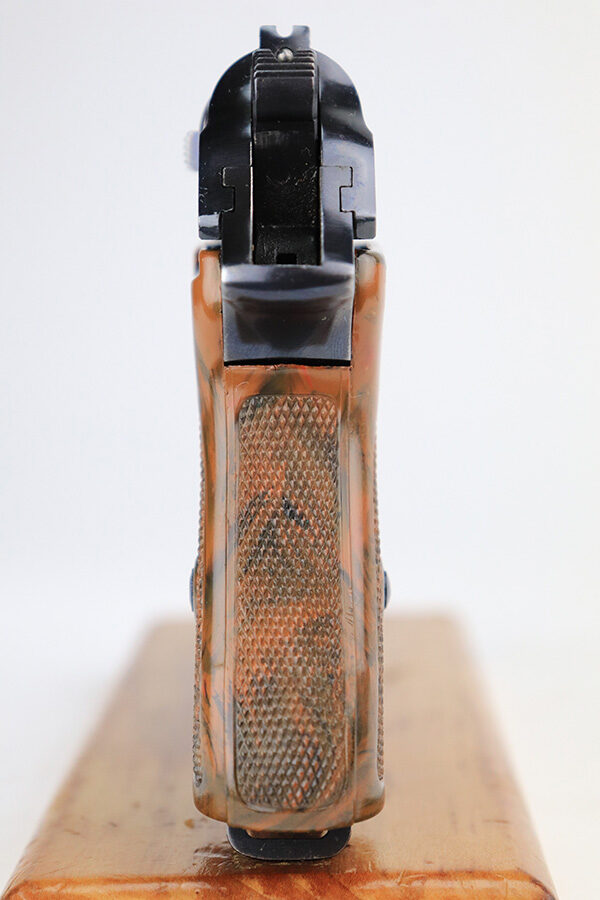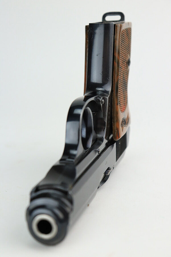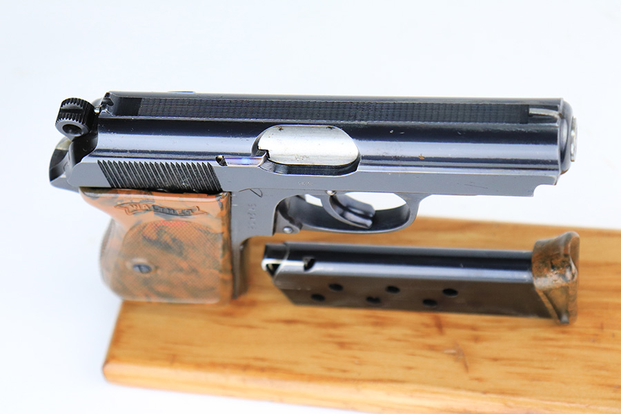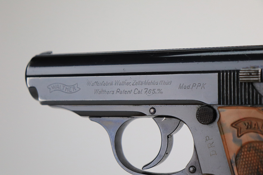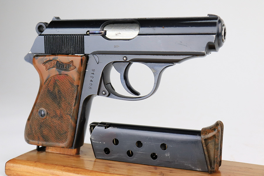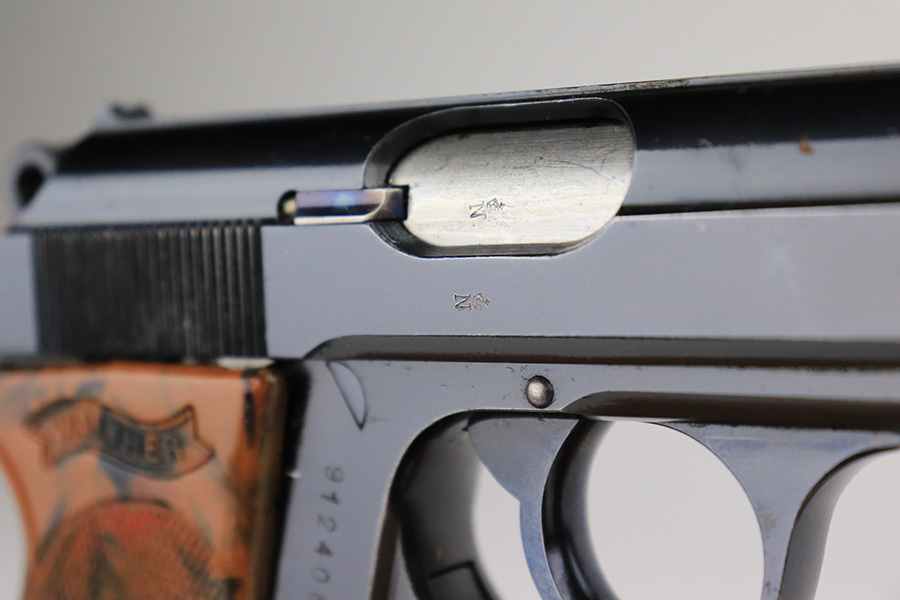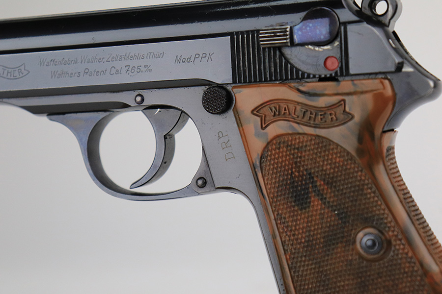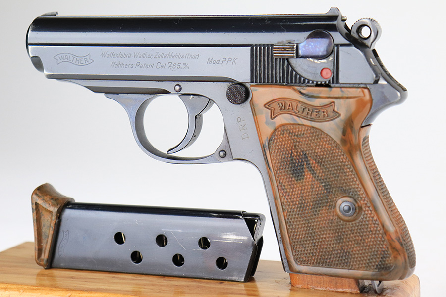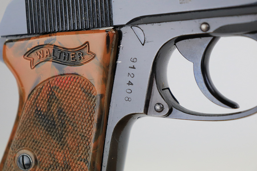 6/4/21 – This is a mint of a Walther PPK that was issued to the Third Reich Postal Service in 1935. The gun is matching and has the proper “DRP” Deutches Reichs Post marking. It has retained more than 98% of its original finish with just a hint of wear around the muzzle. Comes with an excellent brown grip and a Walther banner-only finger extension magazine. Mint bore.
