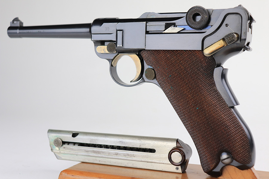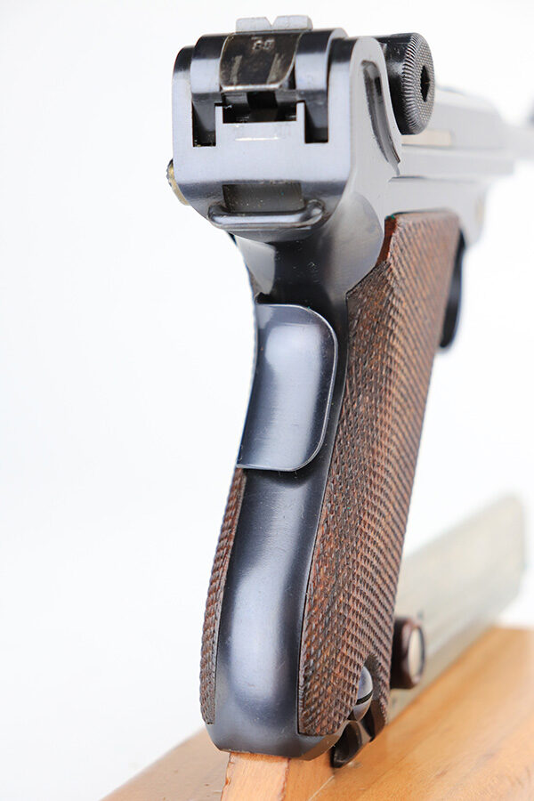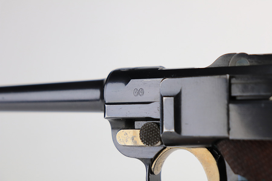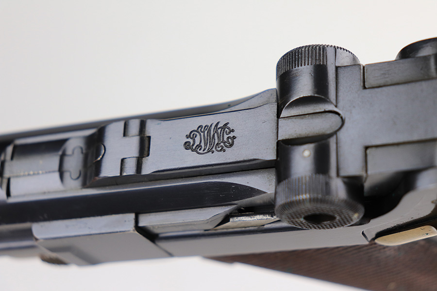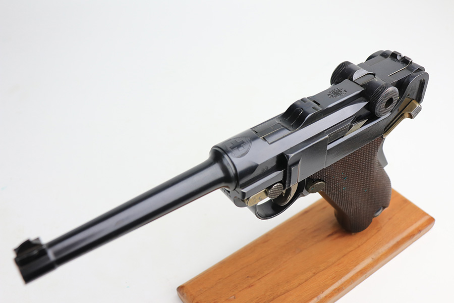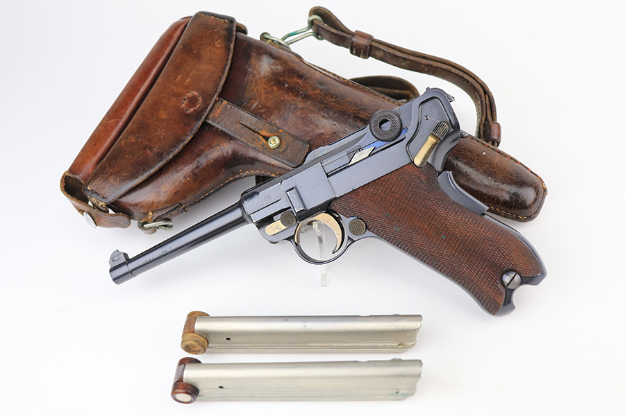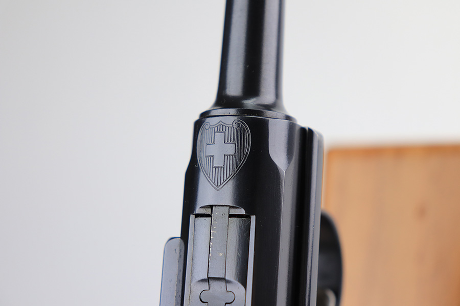 1/13/22 – This is a gorgeous example of a DWM Model 1906 Luger delivered to the Swiss in the early 1900’s. It is all matching, has the proper Swiss “Cross in Shield” logo on the chamber, and has the proper “Cross M” Swiss proofs on the left side of the slide. The gun comes as a rig with a rare, period-correct Swiss holster (with shoulder strap), one proper Swiss magazine, and one mismatched wood bottom magazine. There are a few stitches missing along the left edge of the top flap. The gun is in mint condition, retaining about 99% of its original finish. There are just hints of wear on some of the high edges. The small parts have retained most of their original straw finish. Comes with minty wood grips. The bore is stone-mint.