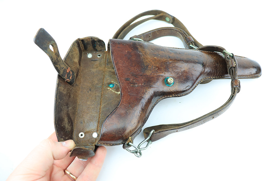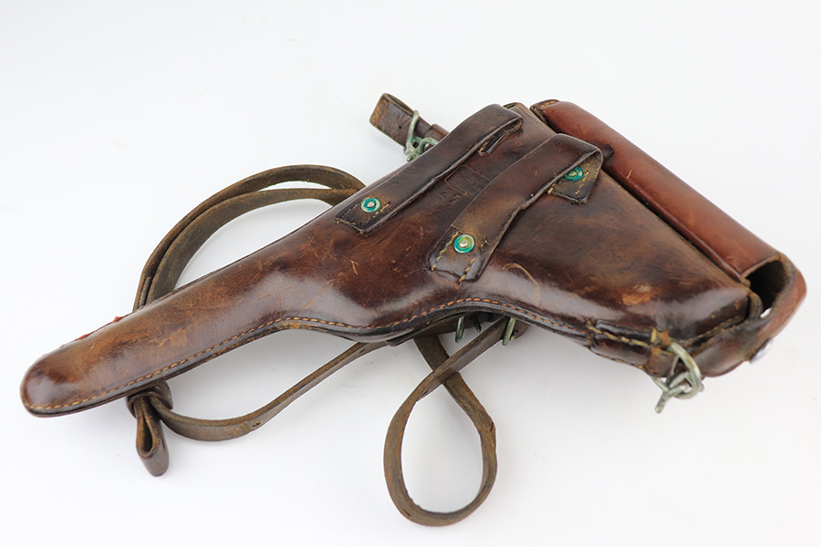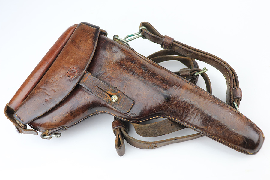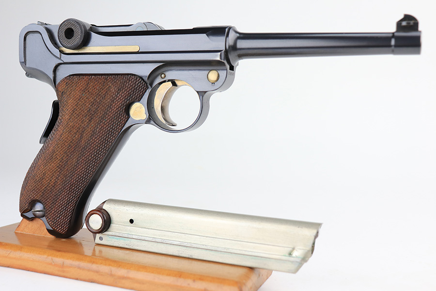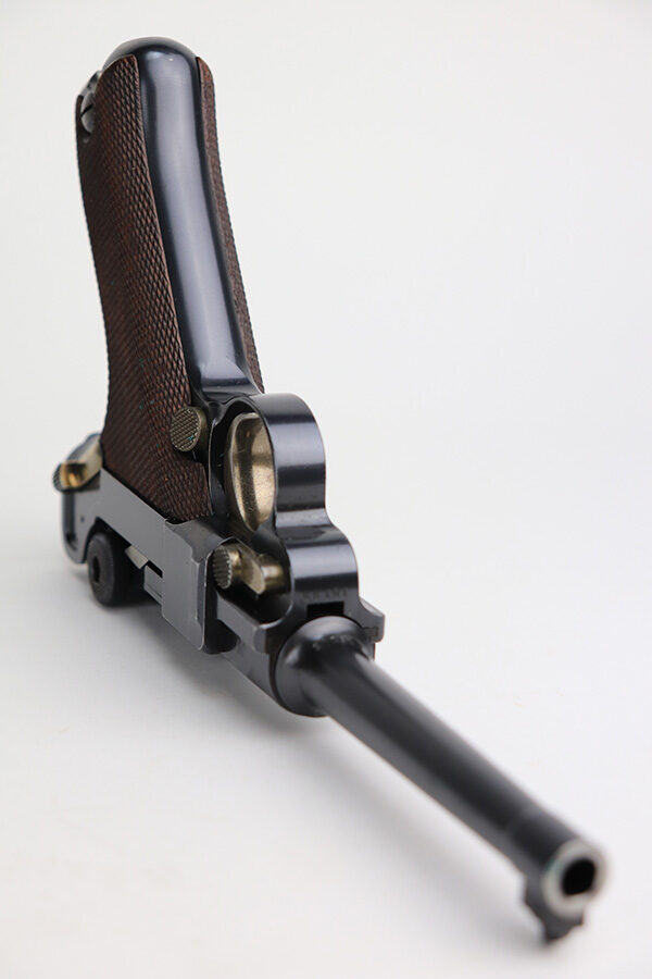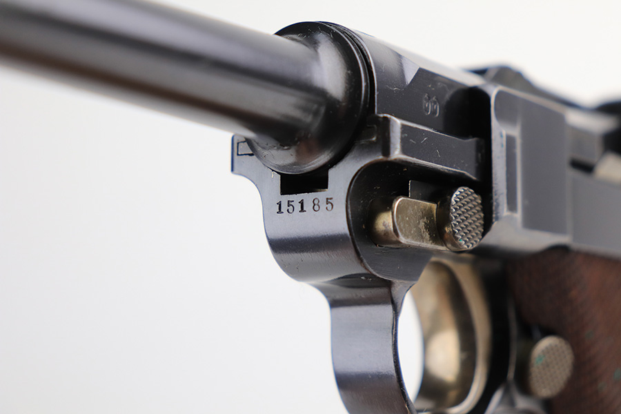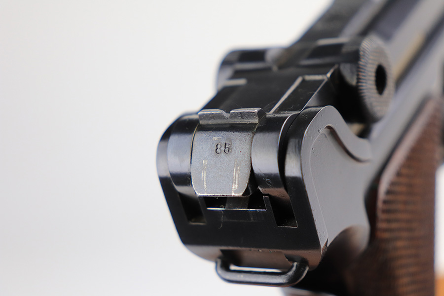 1/13/22 – This is a gorgeous example of a DWM Model 1906 Luger delivered to the Swiss in the early 1900’s. It is all matching, has the proper Swiss “Cross in Shield” logo on the chamber, and has the proper “Cross M” Swiss proofs on the left side of the slide. The gun comes as a rig with a rare, period-correct Swiss holster (with shoulder strap), one proper Swiss magazine, and one mismatched wood bottom magazine. There are a few stitches missing along the left edge of the top flap. The gun is in mint condition, retaining about 99% of its original finish. There are just hints of wear on some of the high edges. The small parts have retained most of their original straw finish. Comes with minty wood grips. The bore is stone-mint.