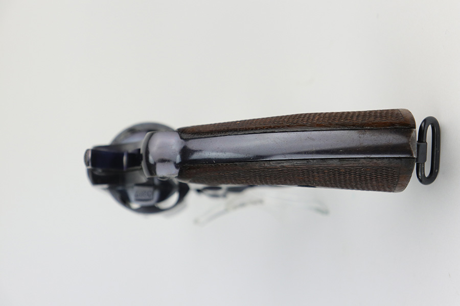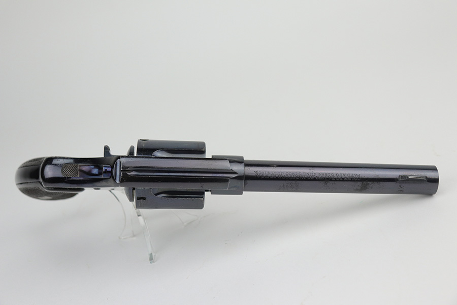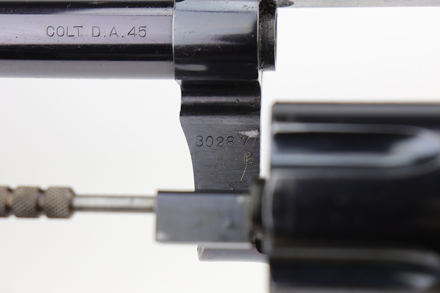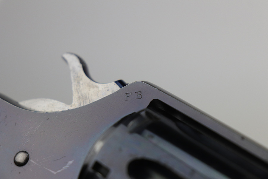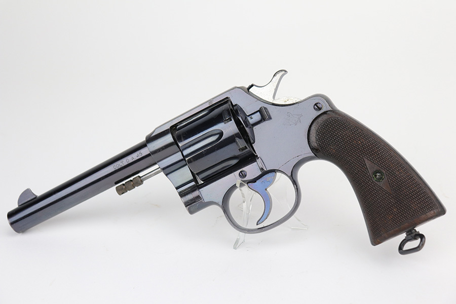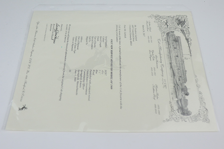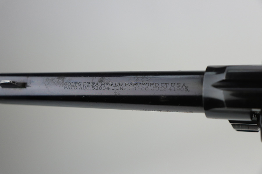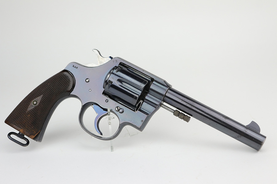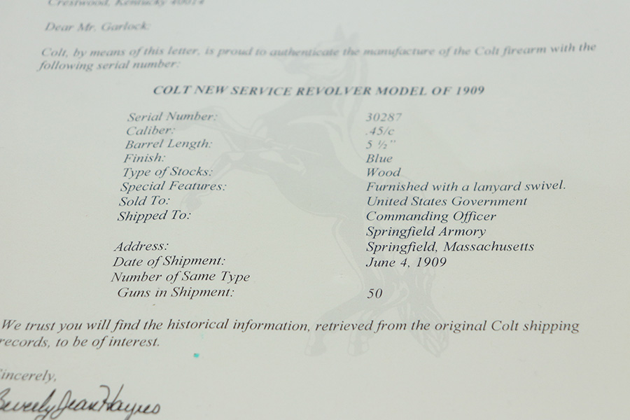 10/22/21 – This is a gorgeous example of an early Colt Model 1909 revolver that was issued to the army that same year. This model featured as the service revolver for the U.S. military for a short period of time, as soldiers complained that the M1892 lacked stopping power and the double-action capability was preferred over the SAA. This particular firearm was shipped to the commanding officer at Springfield Armory in June of 1909, and this listing includes the Colt archive letter. It’s all matching and original with about 95% of the original, lustrous Colt blue remaining. Standing high edge wear and turn mark on cylinder, as well as some thinning and patina on the grip frame. There are also a few small dings or surface scratches on the left side of the frame. Minty bore, hardly looks used. Beautiful fire blue on trigger. Right side of frame features both R.A.C. inspector mark and F.B. inspector mark. Grips appear original to the gun but right panel is chipped along the bottom.