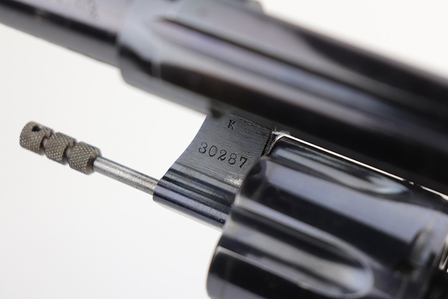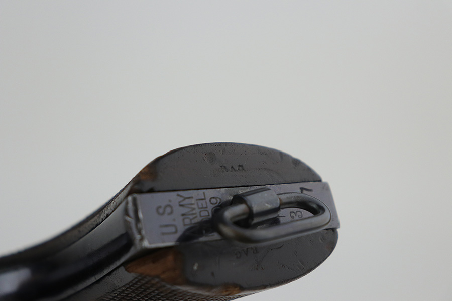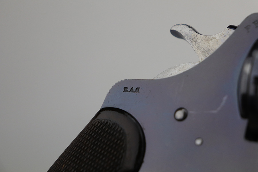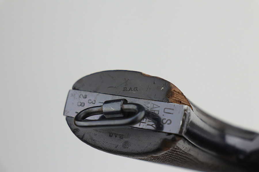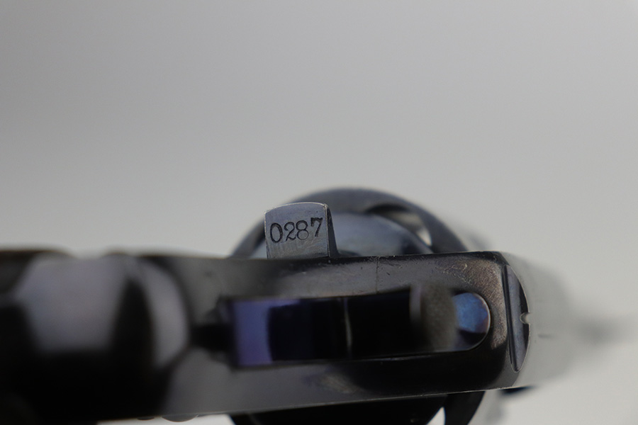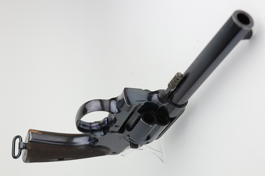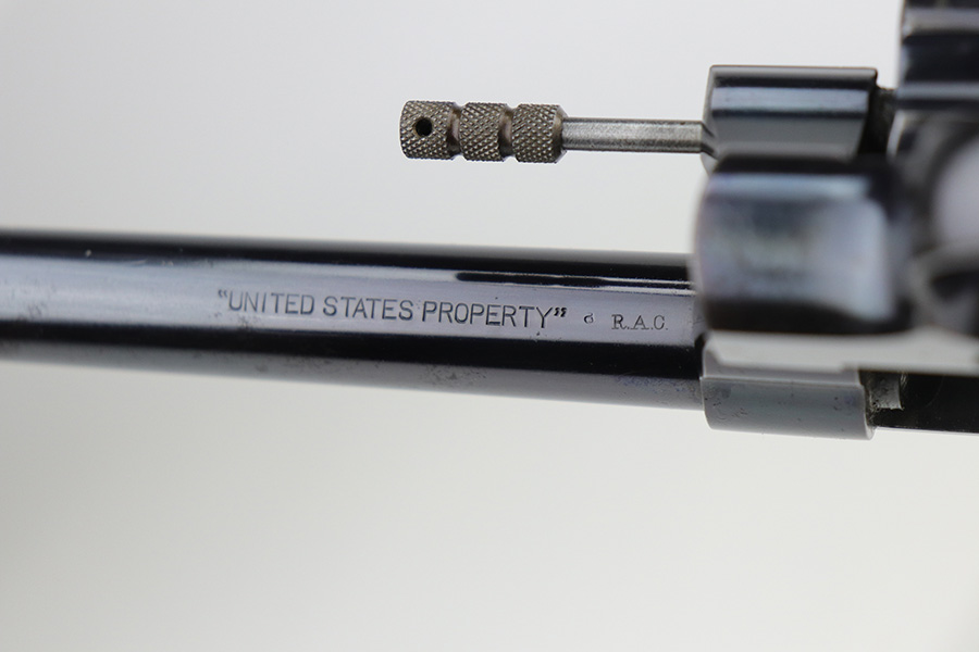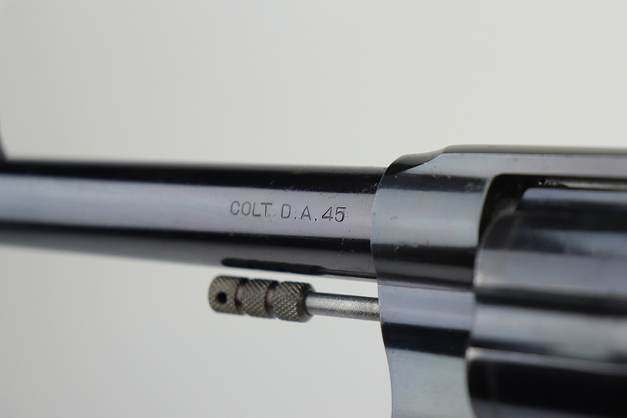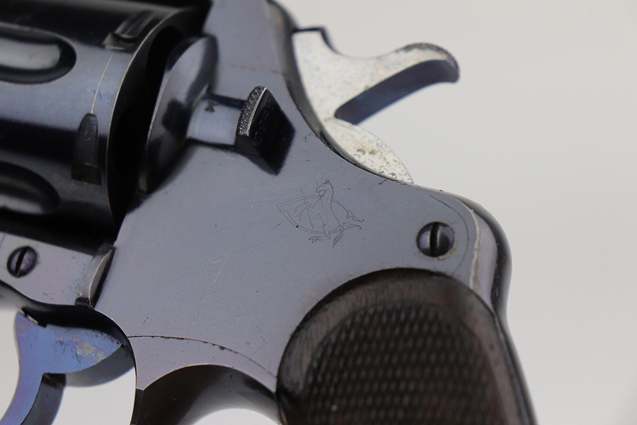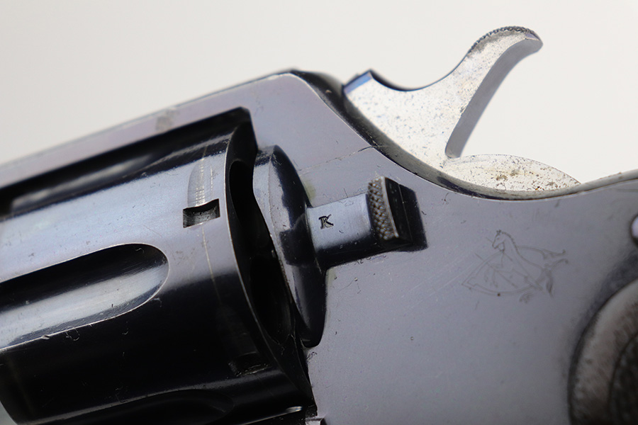 10/22/21 – This is a gorgeous example of an early Colt Model 1909 revolver that was issued to the army that same year. This model featured as the service revolver for the U.S. military for a short period of time, as soldiers complained that the M1892 lacked stopping power and the double-action capability was preferred over the SAA. This particular firearm was shipped to the commanding officer at Springfield Armory in June of 1909, and this listing includes the Colt archive letter. It’s all matching and original with about 95% of the original, lustrous Colt blue remaining. Standing high edge wear and turn mark on cylinder, as well as some thinning and patina on the grip frame. There are also a few small dings or surface scratches on the left side of the frame. Minty bore, hardly looks used. Beautiful fire blue on trigger. Right side of frame features both R.A.C. inspector mark and F.B. inspector mark. Grips appear original to the gun but right panel is chipped along the bottom.