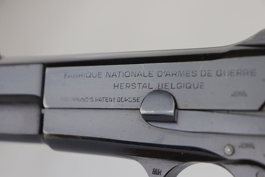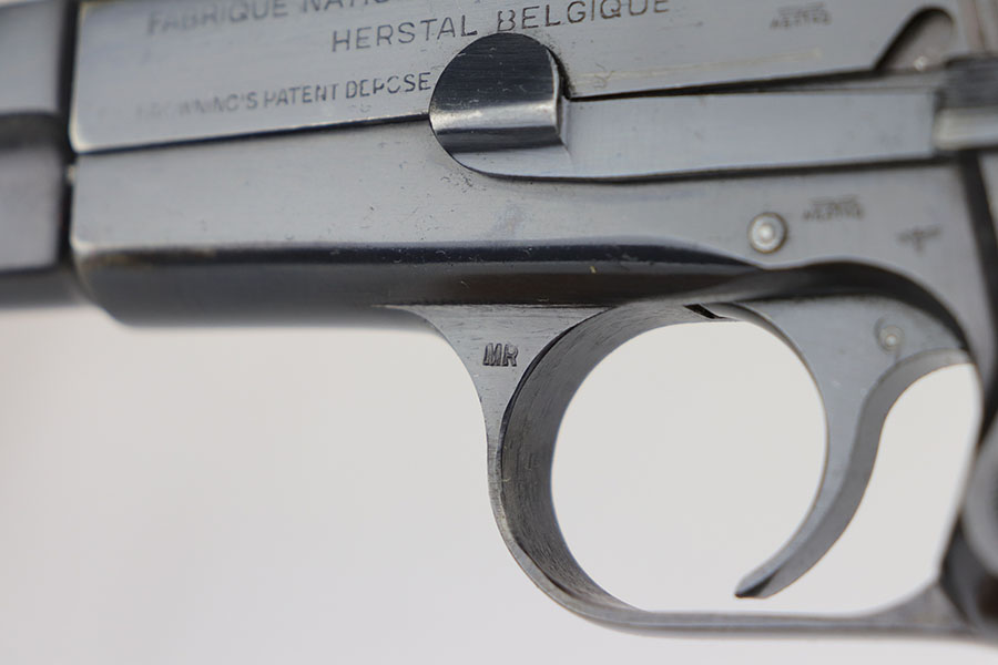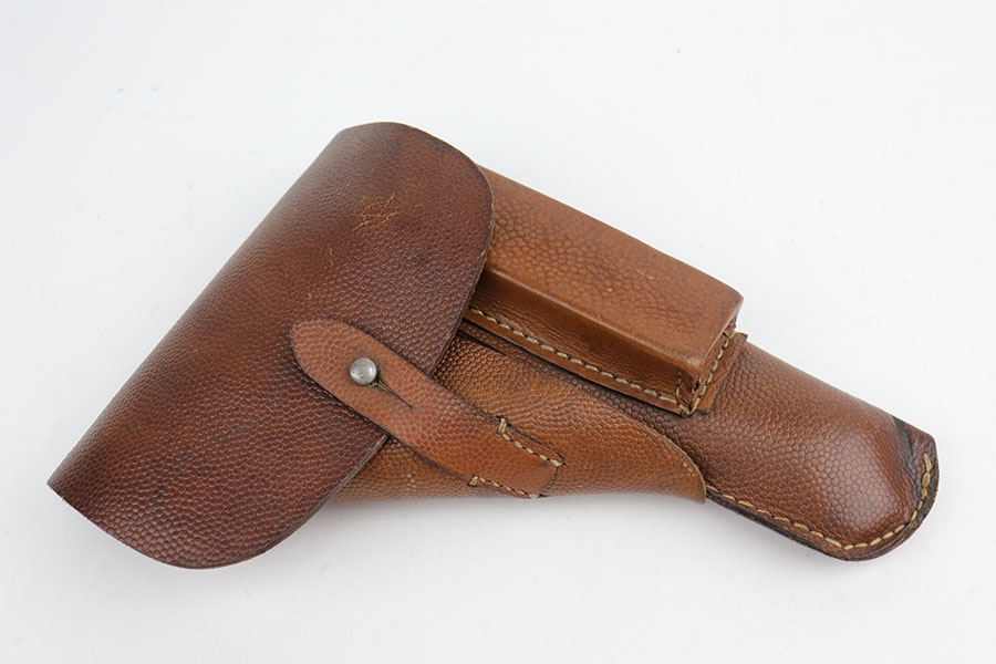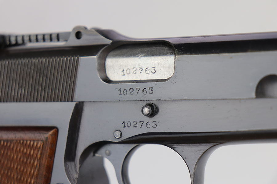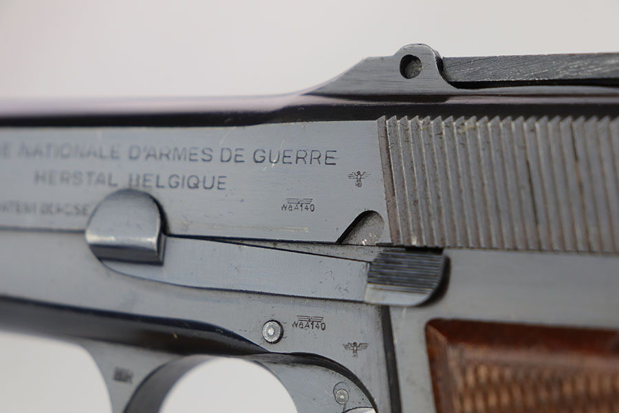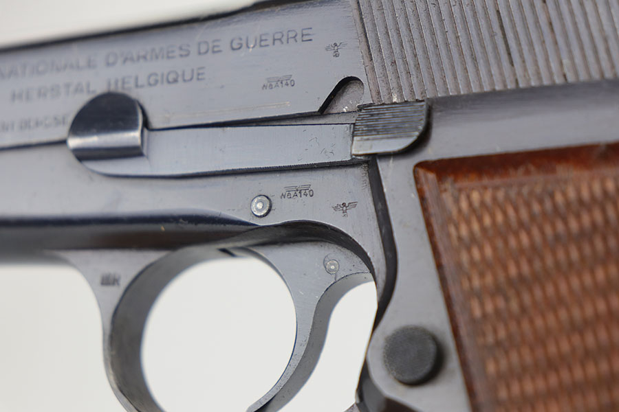 12/8/20 – This is a fantastic Nazi FN Browning High Power rig with spare magazine and holster. It’s an early example with tangent rear sight. WaA140 proofs on slide, frame and one magazine. Spare magazine is WaA103 proofed. The pistol is all matching and original with 97-98% blue, a beautiful example. Minor muzzle wear on the left side of the slide, a small area of rub wear on front strap and a little more on the bottom of the back strap. Minty bore and grips. The rig is completed by a scarce and desirable pebble grain holster. It’s maker marked ‘jkh’ and dated to 1944. It’s in great condition with just a tiny bit of cracking on the back, near the toe.