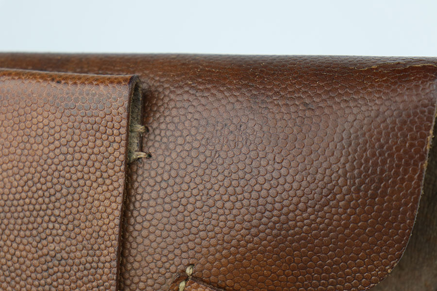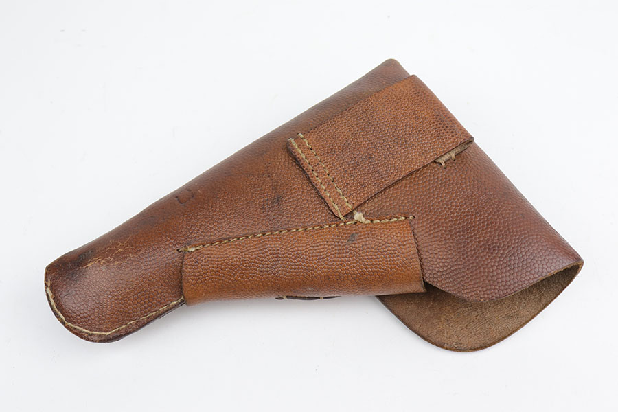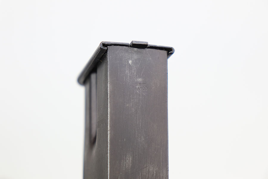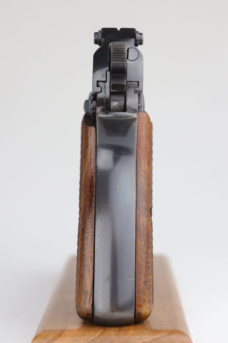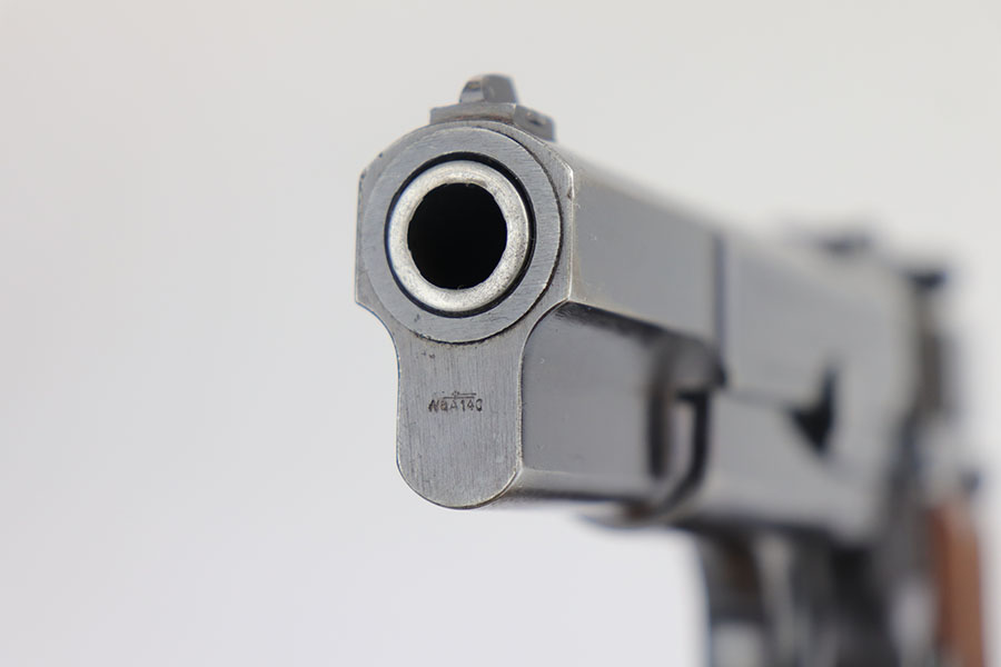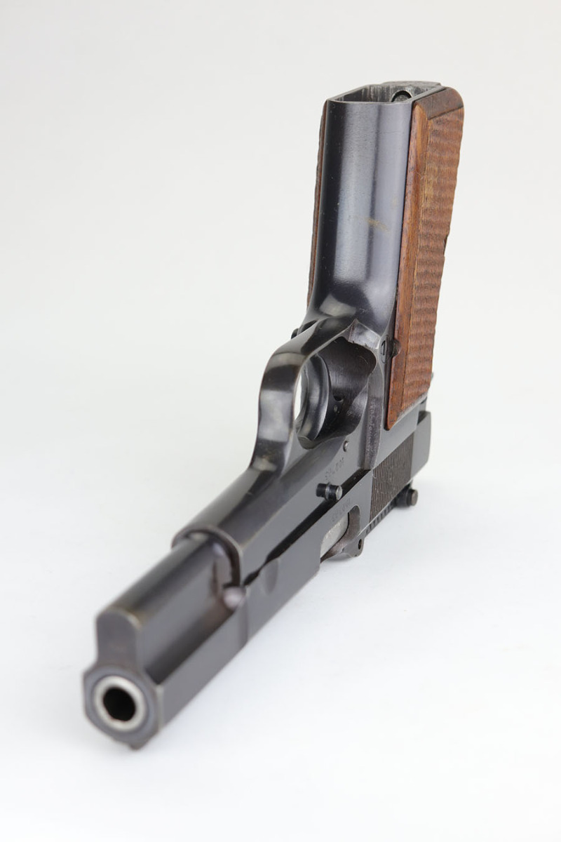 12/8/20 – This is a fantastic Nazi FN Browning High Power rig with spare magazine and holster. It’s an early example with tangent rear sight. WaA140 proofs on slide, frame and one magazine. Spare magazine is WaA103 proofed. The pistol is all matching and original with 97-98% blue, a beautiful example. Minor muzzle wear on the left side of the slide, a small area of rub wear on front strap and a little more on the bottom of the back strap. Minty bore and grips. The rig is completed by a scarce and desirable pebble grain holster. It’s maker marked ‘jkh’ and dated to 1944. It’s in great condition with just a tiny bit of cracking on the back, near the toe.