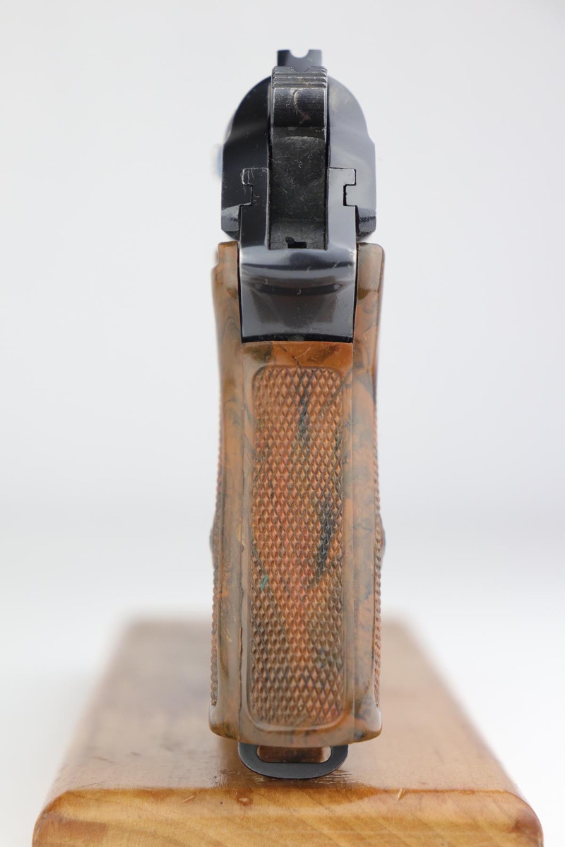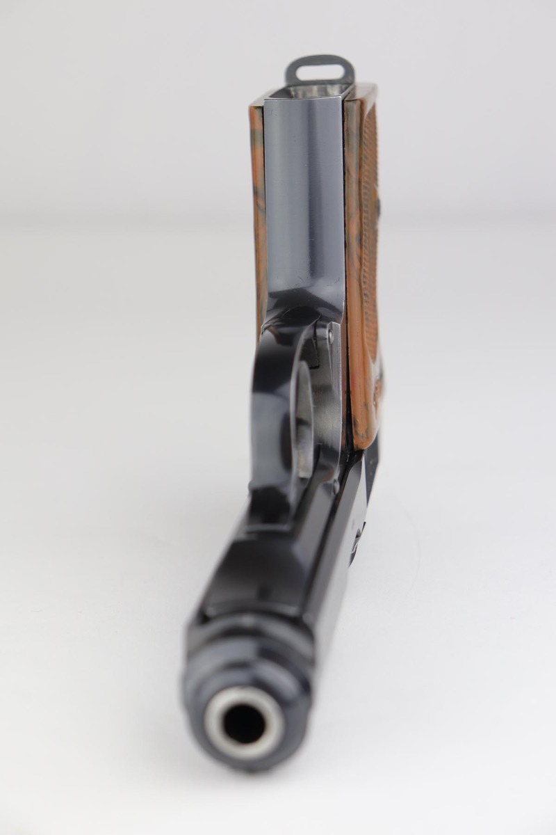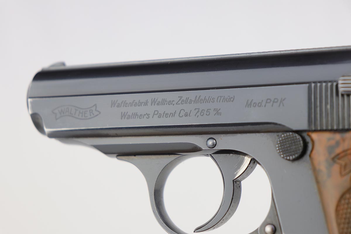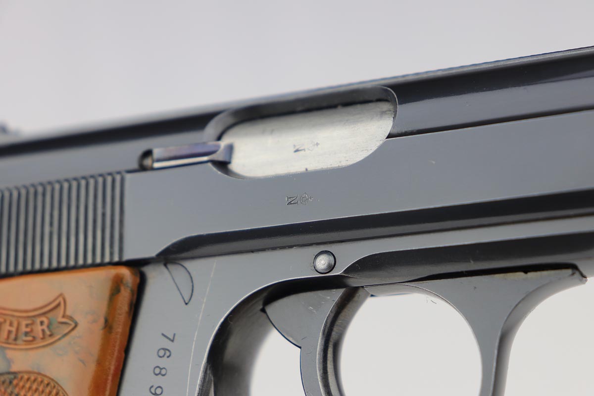 9/5/19 – This is a super early Walther PPK from the pre-Nazi era, in original, near-mint condition. Made in 1930, this pistol is all matching with 98-99% high-polish blue remaining. There is minor muzzle wear on the left side, as well as a scratch on the right side of the frame (near the serial). Early 90 degree safety with decent fire blue remaining. Terrific grip and finger extension magazine, both with no cracks or chips. Terrific bore.