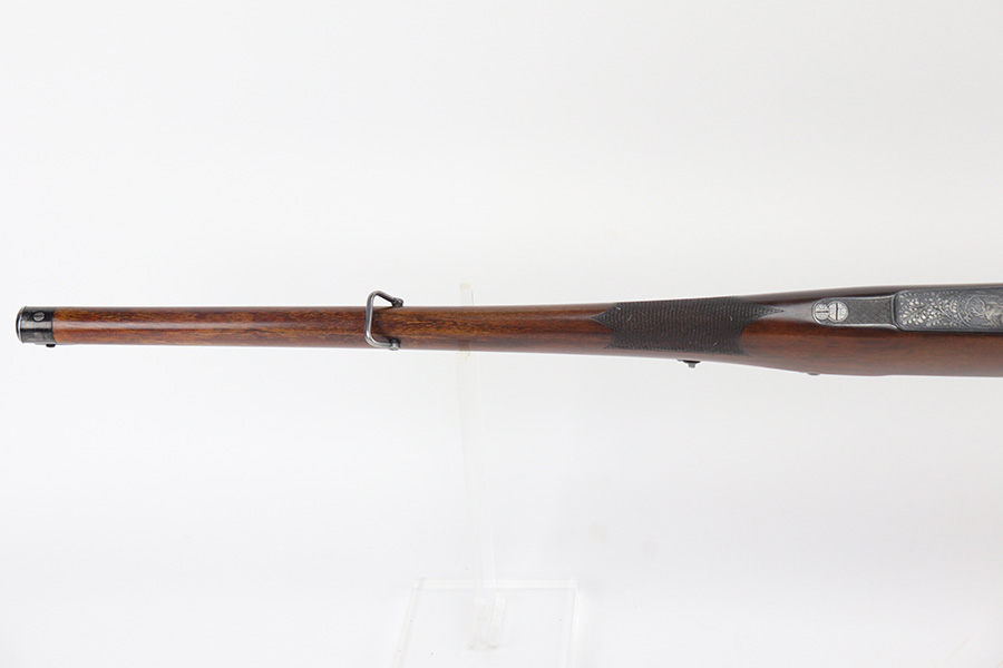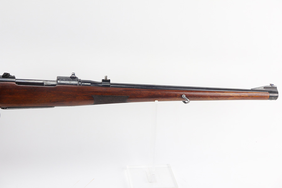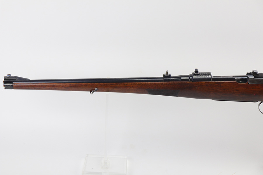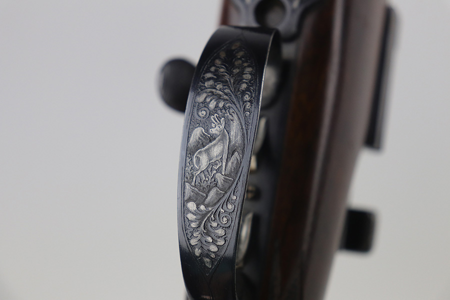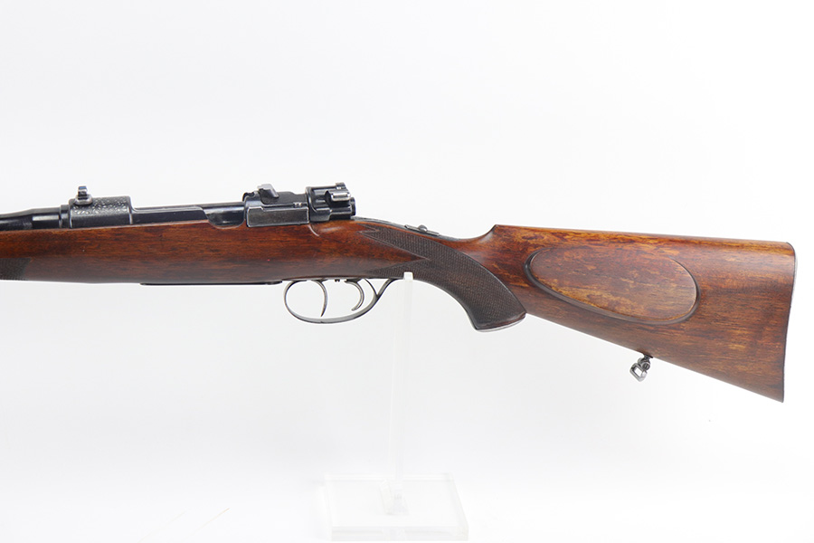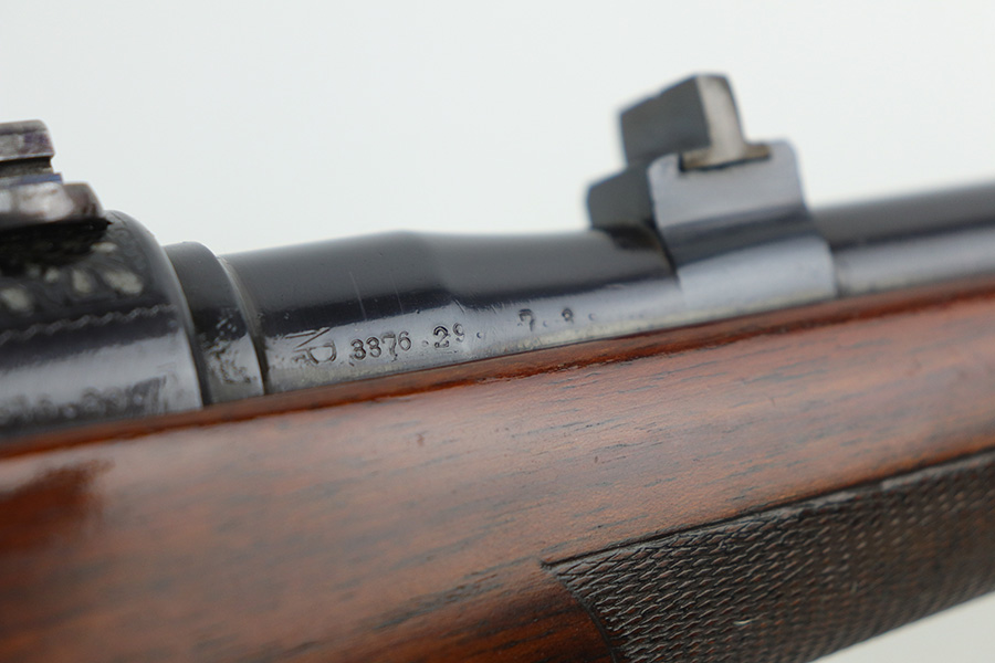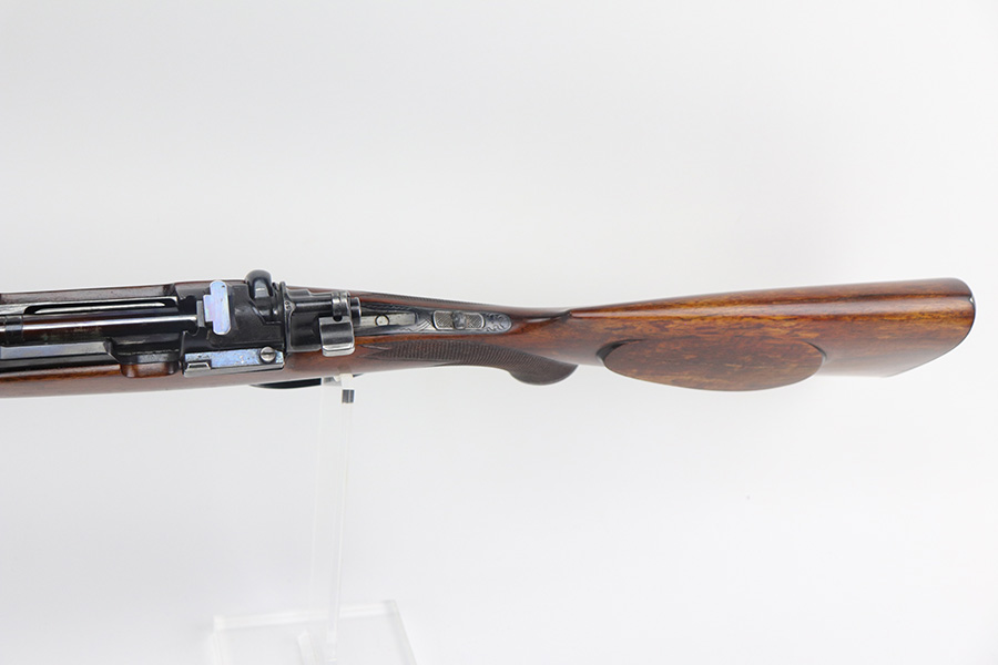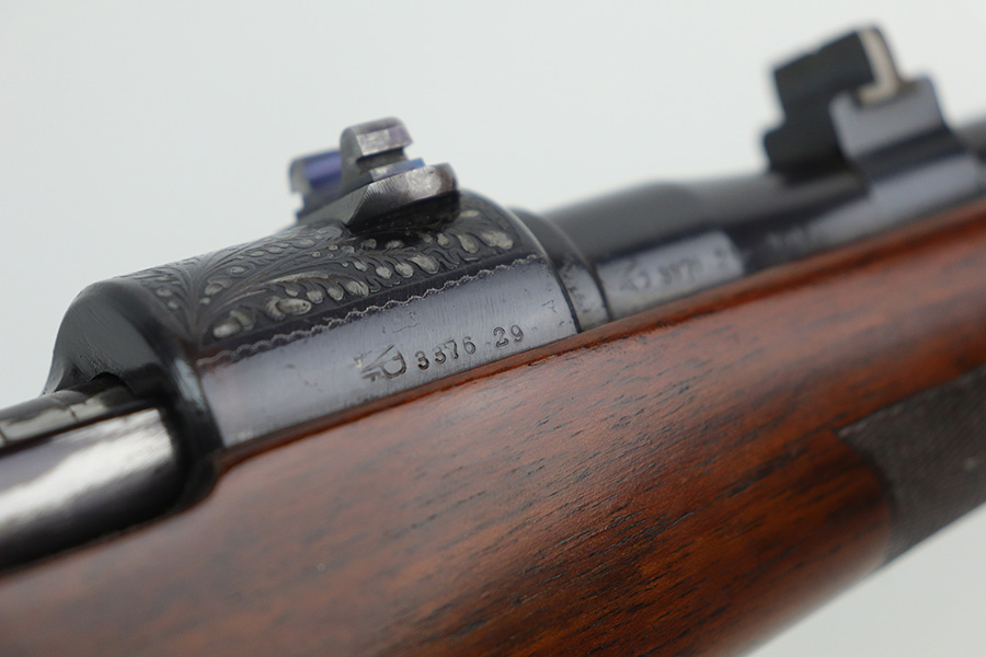 11/17/21 – This is a gorgeous example of a factory-engraved Steyr Mannlicher Model 1903 Carbine, manufactured in 1929. The gun features a beautiful and very ornate oak leaf and acorn engraving pattern on the chamber, tang, floor plate, and trigger group. There is also a detailed engraving of what we assume is a stag and an antelope on the floor plate and underside of the trigger guard. The gun has retained about 95% of its original high polish bluing. There is just some very light scratchy wear around the muzzle and some minor wear on the bolt stop. There is noticeable thinning and minor discoloration on the grip cap and the butt plate. There is still some fire blue intact on some of the small parts. The stock is beautiful and near-mint. Mint bore.
